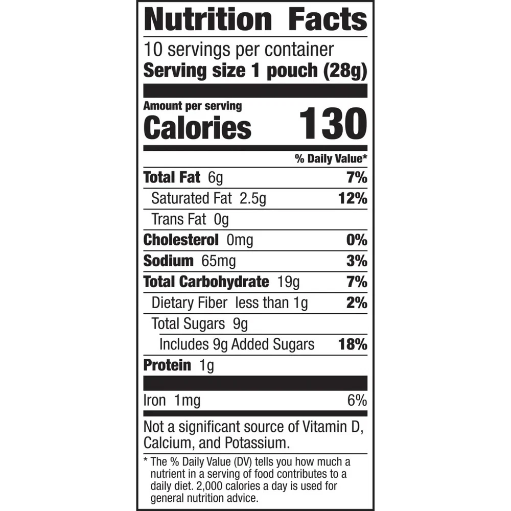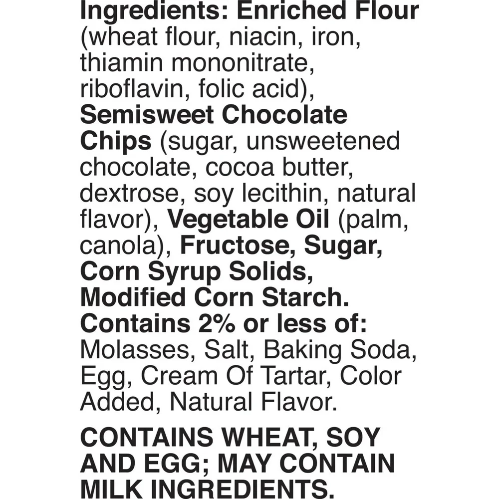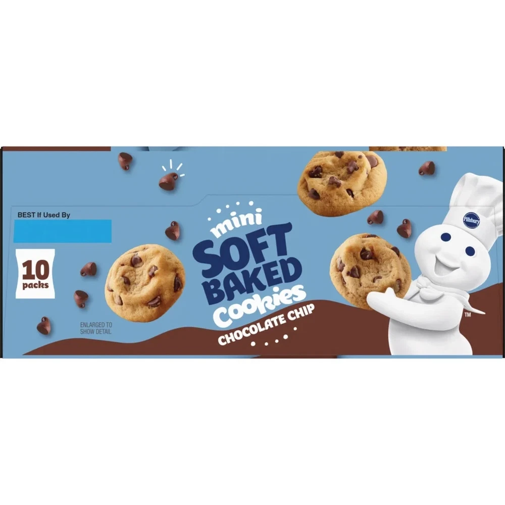 Pillsbury Mini Soft Baked Cookies, Chocolate Chip, Snack Bags, 10 Count, 10 oz (Free & Fast Shipping) Product details Soft, sweet, and ready to Eat! Pillsbury Mini Soft Baked Chocolate chip cookies are made with real chocolate chips and have the Perfect soft baked texture. Ideal for kids and adults alike, each portable snack bag delivers all the yumminess you Expect from Pillsbury in bite-sized ready to eat cookies. Pack Pillsbury Mini Soft Baked Cookies as a quick and easy lunch box surprise or on the go treat. Serve them alongside ice cold milk as an after school snack. Add them to make your ice Cream or dessert bar extra special. Hand them out for kids' parties or team treats. However you enjoy these mini soft baked Cookies, Pillsbury makes it simple to savor your favorite cookie flavors. Contains 10 snack pouches. MINI CHOCOLATE CHIP COOKIES: Delicious, mini soft baked cookies made with real chocolate chips; Perfect for the pantry, lunch box, or afternoon snack SOFT BAKED COOKIES: Enjoy your favorite Pillsbury cookie flavors with an irresistible soft baked texture; All the yumminess you expect from Pillsbury in a ready to eat cookie MUNCH ON THE MOVE: Pillsbury Soft Baked Cookies come in portable snack pouches so you can enjoy these convenient snacks on the go INDIVIDUAL SNACKS: Single serve snack pouches make ideal team treats or kids party snacks; A sweet addition to any care package or food gift basket CONTAINS: Pillsbury Mini Soft Baked Cookies, Chocolate Chip, Snack Bags, 10 Ct, 10 oz More details Flavor Chocolate Chip Texture Soft Baked Shelf life 279 days Cookie type Chocolate Chip Cookies Food condition Shelf-Stable Bakery toppings type Chocolate Chip Count 10 Ingredients Ingredients Enriched Flour (wheat flour, niacin, iron, thiamin mononitrate, riboflavin, folic acid), Semisweet Chocolate Chips (sugar, unsweetened chocolate, cocoa butter, dextrose, soy lecithin, natural flavor), Vegetable Oil (palm, canola), Fructose, Sugar, Corn Syrup Solids, Modified Corn Starch. Contains 2% or less of: Molasses, Salt, Baking Soda, Egg, Cream Of Tartar, Color Added, Natural Flavor. Active Ingredient Name Enriched Flour (Wheat Flour, Niacin, Iron, Thiamin Mononitrate, Riboflavin, Folic Acid), Semisweet Chocolate Chips (Sugar, Unsweetened Chocolate, Cocoa Butter, Dextrose, Soy Lecithin, Natural Flavor), Vegetable Oil (Palm, Canola), Fructose, Sugar, Corn Syrup Solids, Modified Corn Starch, Contains 2% or Less of: Molasses, Salt, Baking Soda, Egg, Cream of Tartar, Color Added, Natural Flavor.