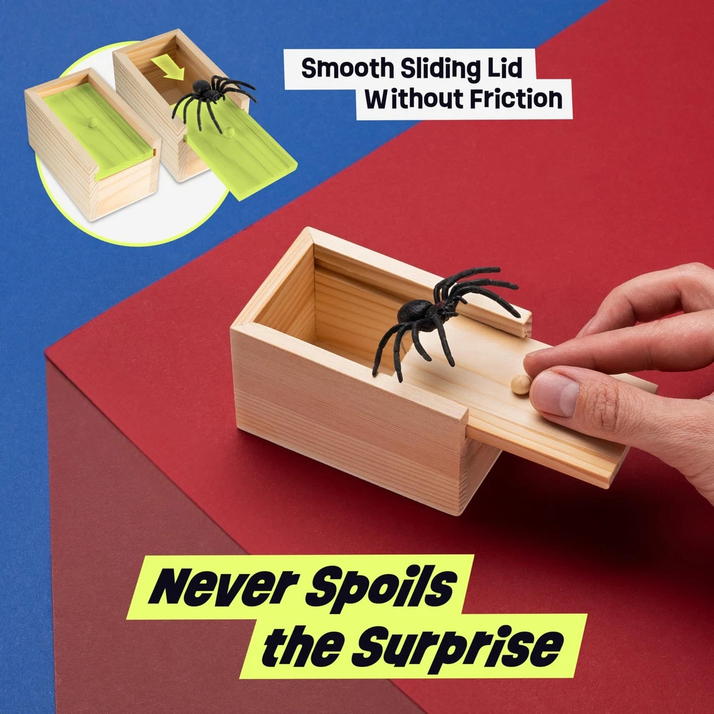 Surprise and Laughter - The Mini Spider Prank Box is designed to provide harmless fun and laughter with its realistic rubber spider that pops out when the box is opened. Perfect for April Fools pranks, gag gifts, or as a surprise for friends and family. High-Quality Craftsmanship - Made of solid wood with a high-quality finish, our spider prank box is built to last for years of practical jokes and pranks. Its durability ensures endless entertainment and reusability for various gift-giving occasions. Versatile Prank Kit - This spider box can be used in multiple ways, such as a Christmas gift, anniversary gift, Mother's Day, fathers' day, or even a surprise birthday box. With its endless possibilities, you'll never run out of ideas to startle and amuse your loved ones. Realistic Design - Our prank box variations have rubber spiders and rubber snakes designed to look incredibly natural, making them perfect for adding an extra level of surprise to your pranks. Watch as your friends jump in shock and awe! Perfect Gift for All Ages - Whether it's for kids or adults, our Mini Spider Prank Box is the ultimate hand-held or travel-size gag gift for any occasion. From April Fool's pranks to birthday surprises, this spider box will bring joy and laughter to everyone involved.