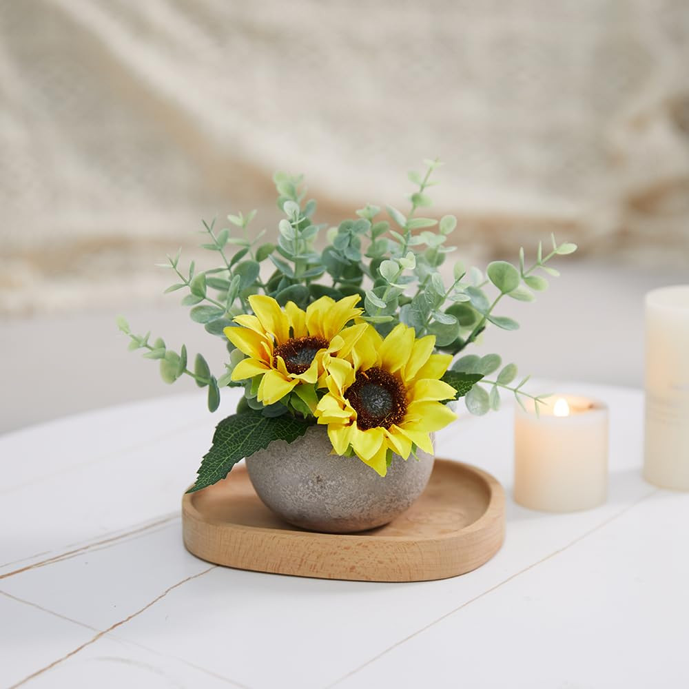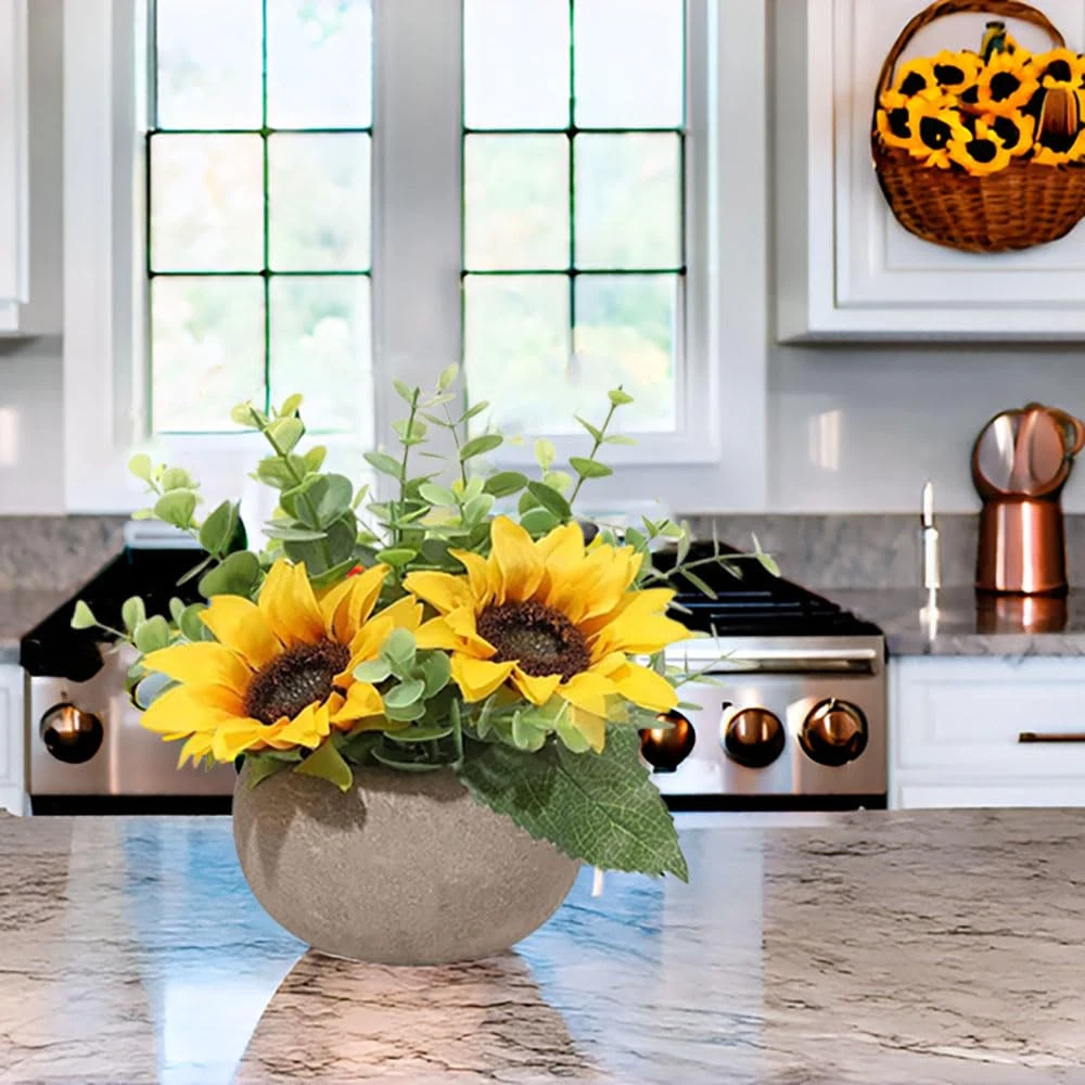 đ» ăWhat is inside the packageă When you receive the package, you will be pleasantly surprised to find 10 eucalyptus leaves, 2 fake sunflower heads, 1 sunflower leaf, and 1 cement pot inside. You will experience a feeling of happiness from sunflower bathroom decor. đ» ăExciting Appearanceă Our small artificial potted sunflower use eucalyptus leaves, which make them more vivid and vibrant, giving them a natural appearance. Sunflowers kitchen decoration are full and their leaves are clear, giving people a feeling of being bathed in sunlight. đ» ăSunny and cheerful moodă The representative of sunflowers for home is WARMTH/LOYALTY/SUNSHINE//POSITIVITY. When you see them, you will feel relaxed and full of vitality. đ» ăEasy to handleă: Our small sunflower in pot do not require watering or wilting, and are easy to manage. đ» ăAvailable Scenariosă Fake small flowers with vases - arranged with fake sunflowers and eucalyptus trees, are a versatile core decoration that is perfect for enhancing various settings in your home, bathroom, kitchen, living room, farmhouse, party, bedroom and outdoor space. Whether you place it on a sink, windowsill, bookshelf, or table, this exquisite artificial autumn flower decoration can add a touch of elegance and warmth to any environment.