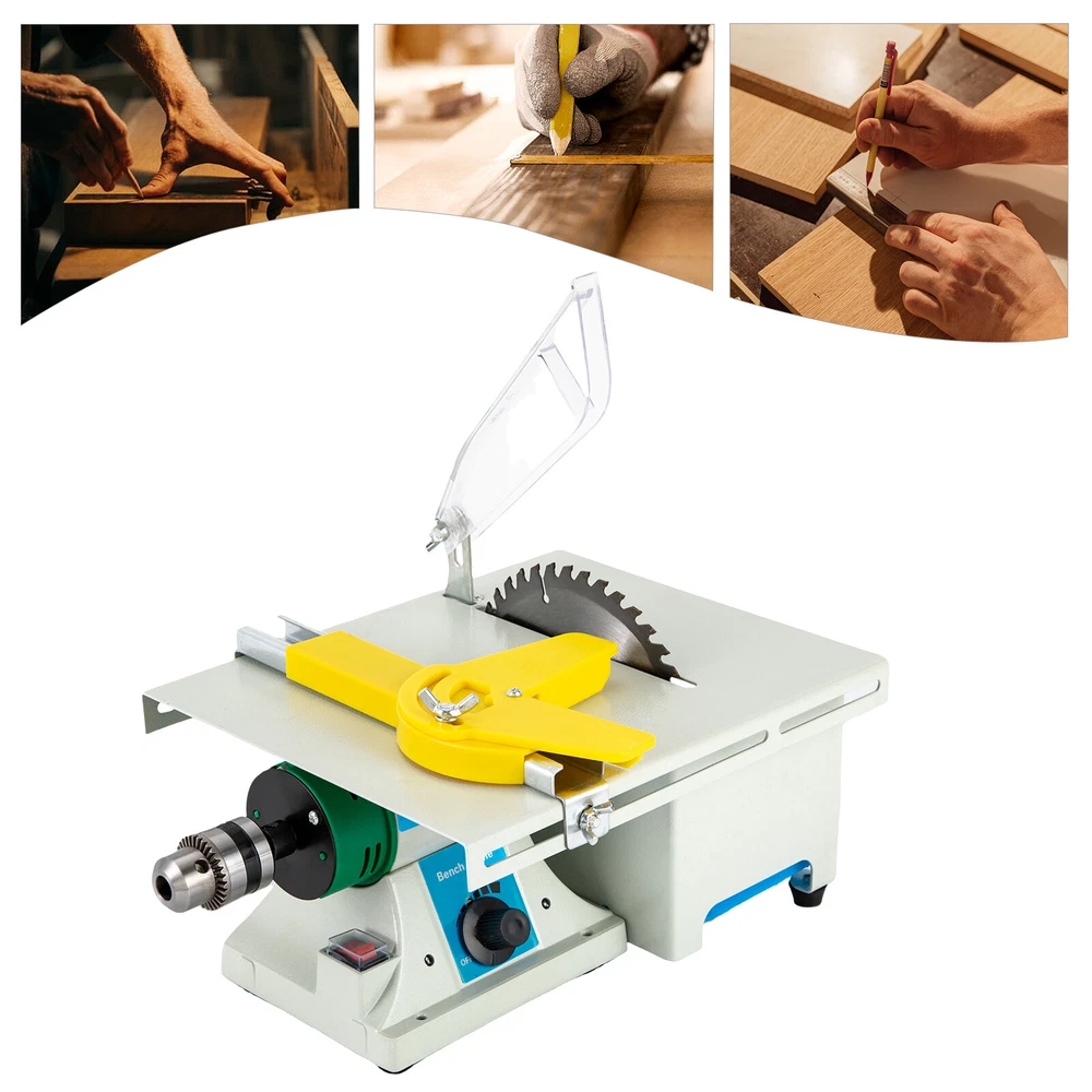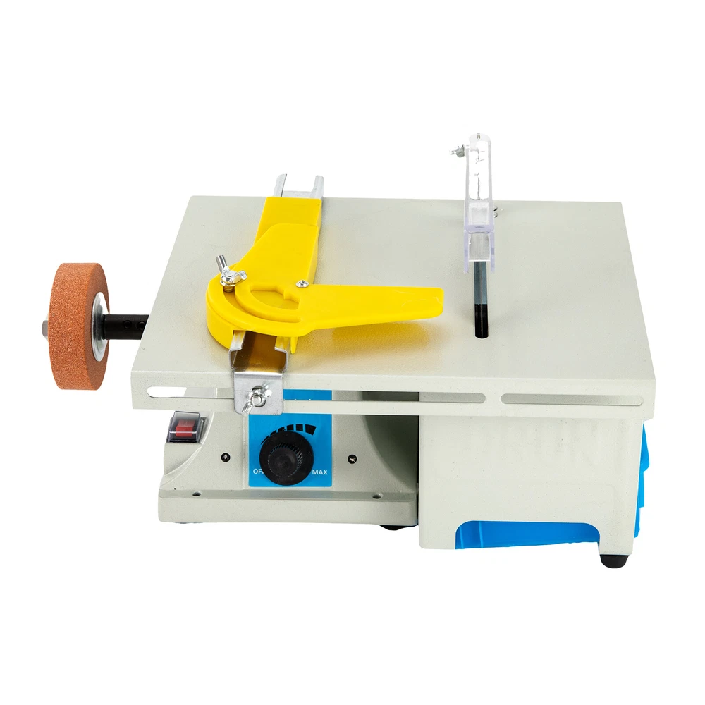 Mini Table Saw Jewelry Rock Polishing Machine Bench Grinder Polisher Table Saw Mini Table Saw Jewelry Rock Polishing Machine Bench Grinder Polisher Table Saw Description If you enjoy making jewelry and like polished stones, a grinder can be a very flexible and versatile tool. This table grinder that can handle a variety of heavy grinding tasks is your ideal choice! It helps you complete polishing and cutting work faster and better through variable speed, high-power motors, and a variety of accessories, making itself a great helper for you! Key Features 5-in-1 Bench Grinder: Comes with a jade saw blade, a woodworking saw blade, a fiber wheel, a flexible shaft, a carving handle, a drill chuck, and other accessories, this bench grinder allows for polishing, cutting, polishing, grinding, and carving. Therefore, you can create various decorations yourself. High Efficiency: With a 750W pure copper motor and infinitely adjustable speed(800-10000rpm) through the control knob, this product has high efficiency to meet your cutting, grinding, carving, punching, and polishing needs. Additionally, the 6" saw blades allow for 0.39in cutting depth. Durable and Sturdy: The premium aluminum, nylon, and steel materials and plastic spraying process give this product high stability, durability, high strength, and wear resistance , together with the pure copper motor and elongated&thickened bearings, making it maintain good performance for a long time. Lightweight and Portable: It is compact (11.4*8.66*9.25 inches) and portable (12.1 pounds), making it easy for you to take it to the place you need for various polishing tasks. High Stability: The aluminum base with non-slip rubber feet can effectively alleviate vibration and avoid scratching the countertop. The mounting holes and angle brackets allow for further fixation on the workbench, which helps to mitigate the potential damage caused by vibration to items to be cut or polished. Safe to Use: The main switch and saw blade are protected by an outer shell, which not only prevents dust and water from entering critical components but also effectively prevents accidents. The overheating protection function makes the machine less susceptible to overheating. The sink can effectively cool the machine and be waterproof , making your work safer. Complete Accessories: The complete installation accessories such as carbon brushes, chuck&handle keys, grinding wheel&saw blade connecting rods, and practical tools needed during work such as fiber wheel and flexible shaft save you cost and time without additional tedious purchases. Flexible Angle Ruler: Its operating table is equipped with a prominent yellow angle ruler, which can not only adjust the angle of the material to make your work more precise but also be used to push the material without touching the saw blade, making it safer. Good Clamping: The drill chuck has a precise clamping range(0.06-0.4"), making it suitable for polishing more items of different sizes while reducing deviation to the maximum extent. Easy to Maintain: You can use flat head screws to unscrew the carbon brush cover and replace the carbon brush, extending its service life. Details Practical Basket: It can be installed below the cutting saw blade, which can help you collect the cut waste and debris and keep your desktop clean. Ideal Handle: The 5.24-inch long carving handle provides a comfortable grip, and its three-disc chuck has good stability, helping you complete your work better. Long Power Cord: The approximately 4.92ft power cord allows you to have plenty of disposable lengths, thus reducing the limitation when you use it. Application It is suitable for carving, polishing, and drilling of jade, agate, metal, wood, etc. It is also suitable for manual polishing, grinding, and cutting of beads, bodhi, and various DIY materials. Specifications Power: 750W Voltage: 110V Speed: 800-10000rpm Blade Size: 15cm/6in Color: White, Yellow, Blue Style: Angled Plug: US-Standard Material: Aluminum, Copper, Nylon, Steel, Rubber Surface Treatment: Plastic Spraying Flexible Shaft Clamp Size: 4mm/0.157in Drill Chuck Range: 1.5-10mm/0.06-0.4in Cutting Depth: 0-10mm/0-0.39in Power Cord Length: About 1.5m/4.92ft Installation Required: Yes Number of Items: 1 Gross Weight: 6kg/13.2lbs Net Weight: 5.5kg/12.1lbs Table Size(L*W): 26.5*22cm/10.43*8.66in Product Size: 29*22*23.5cm/11.4*8.66*9.25in Package Size: 36*29*23cm/14.17*11.41*9.05in Package Included 1*Table Grinder 1*Goggles 1*Angle Ruler 1*Basket 1*Flexible Shaft 1*Flexible Shaft Handle 1*Drill Bit Clamp 2*Saw Blades 5*Grinding Heads 1*English Manual All Accessories for Assembly Notes Please note this tool should be grounded while in use. Please always wear proper eye and face protection devices such as safety glasses and face shields(not included). Please do not wear loose clothing or jewelry. Please tie back your long hair. Before use, please check each attachment for cracks or defects, and do not use any damaged, loose, vibrating or unbalanced accessories, or any attachments that are higher than the maximum rated speed of the machine. Please always insert the shank or arbor of an accessory or mandrel into the collect(or collet holder chuck or chuck arbor) as far as possible to provide proper support. Please tighten the collet or chuck securely. Please do not use excessive side pressures which may tend to bend or break the shank or arbor or an accessory. Let the speed of the accessory do the work. Please do not install the motor by jamming or using excessive pressure on the polishing wheel, buff, wheel, or other accessories. This can result in damage to the motor. Please do not operate your power tool during a perceptible power decreases. Please turn the power tool off and do not use it until power is fully restored. Please read the operating manual completely before use. And pay particular attention to the safety instructions included. Please allow the slight color difference caused by the shooting light