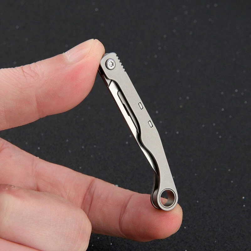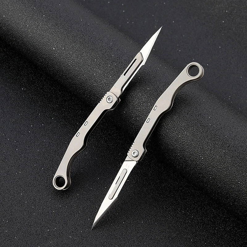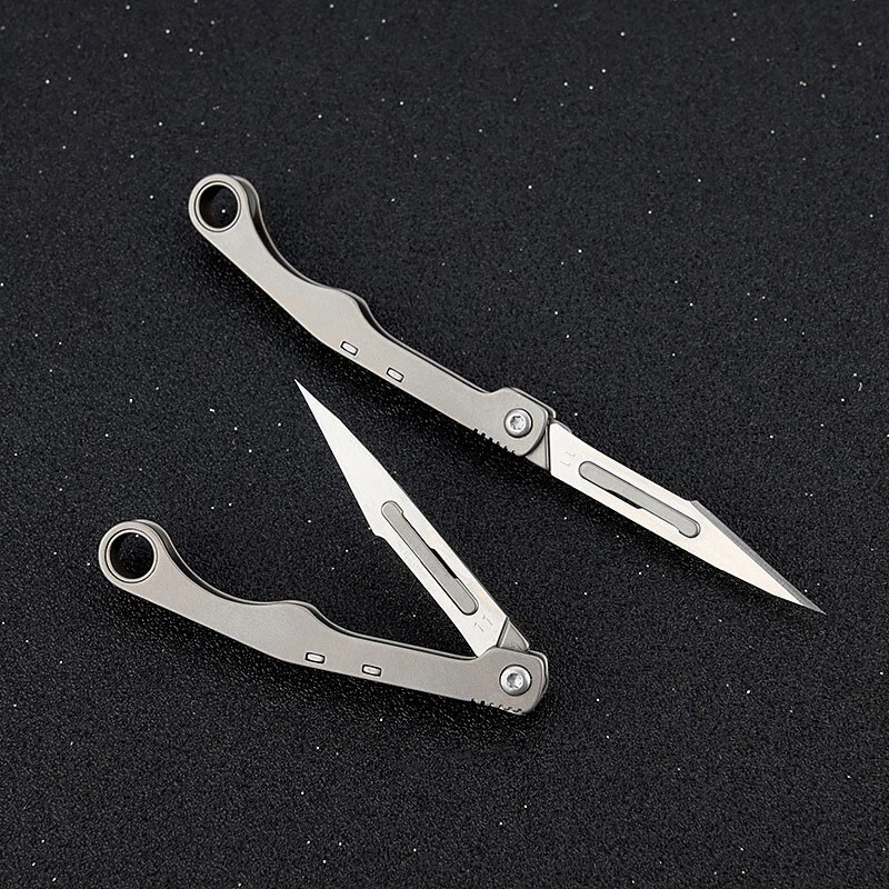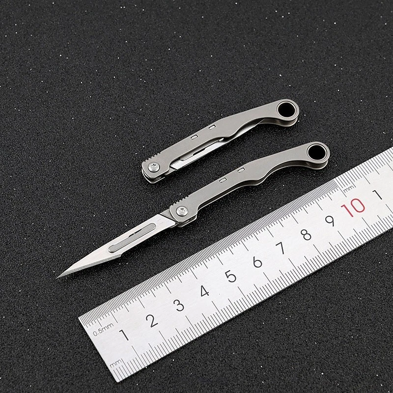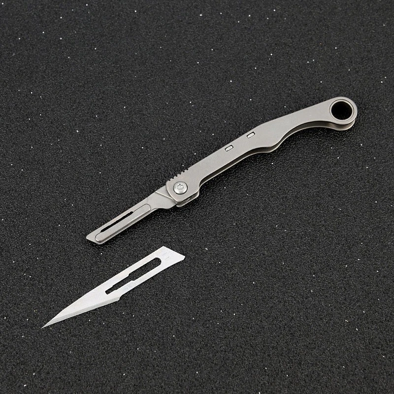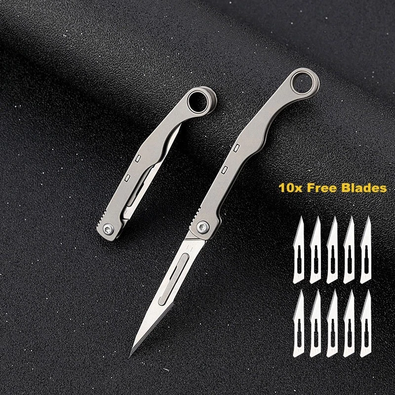 Description Mini Titanium Utility Folding Knife #11 Scalpel Blade Pocket Keychain EDC Outdoor Details: Made of TC4 titanium alloy and carbon steel. come with 10x #11 blades. It is a mini multi EDC tool, easy to carry. Handle Material: TC4 Titanium Alloy Blade Material: #11 Carbon Steel Color: Gray Open Length: 104mm Close Length: 60mm Handle Width: 8.3mm Handel Thickness: 5mm Blade Length: 20mm Blade Width: 7mm Blade Thickness: 0.2mm Blade Hardness: 58-60HRC Net Weight: 6g Package Included: 1pcs Mini Titanium handle with 10x blades. For Outdoor Hunting, Camping, Fishing, Hiking, Traveling, Cycling, Backpacking for Men & Women, for Everyday Carry, Best Gifts The cool pocket knife is a great gift for men and women, Birthday gift, Father's Day gift, Christmas gift, graduation gift, wedding gift, Thanksgiving gifts, Business gifts, office gifts, etc.