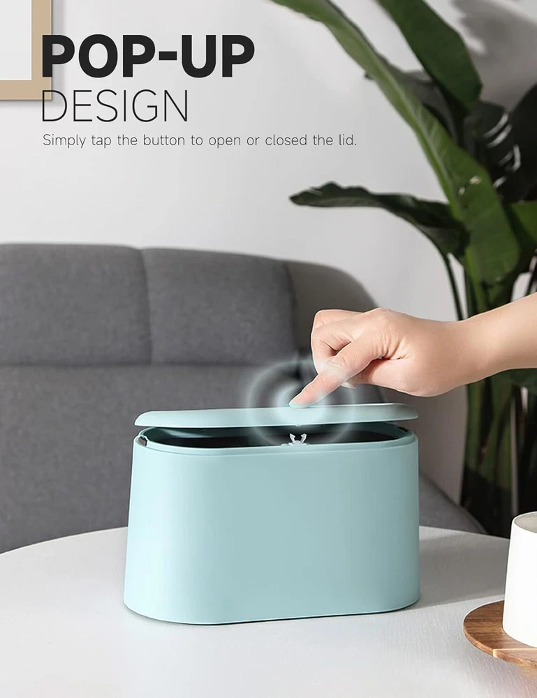 Product Description Mini Size The small shape moves freely. Liner Design Hide the garbage bag, Easy to replace. Pop-up design Simply tap the button to open or closed the lid. Wide Usage In The Dresser Table Store garbage after makeup. In The Kitchen Countertop Store kitchen waste. In The Office Desk Store desktop garbage, such as coffee capsules, waste paper, etc. In The Laundry Room Store lint (lint bin).