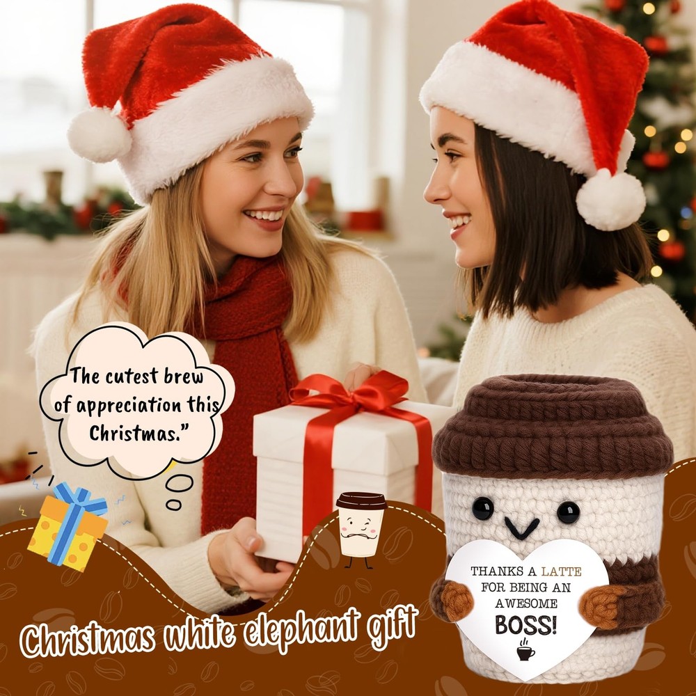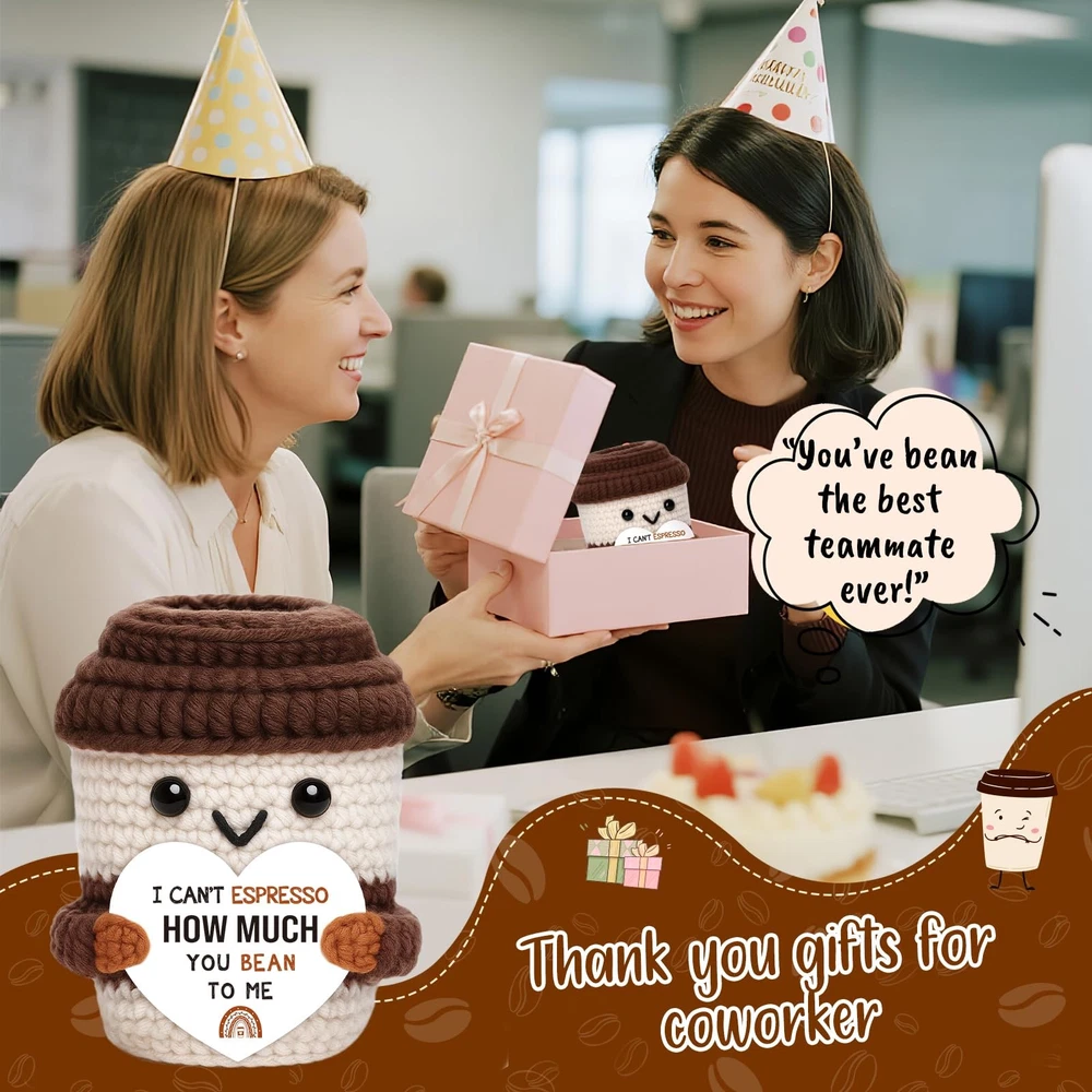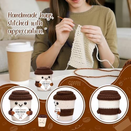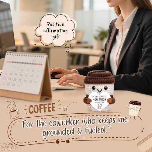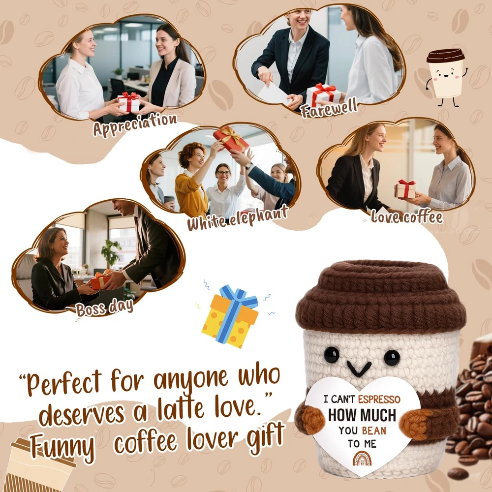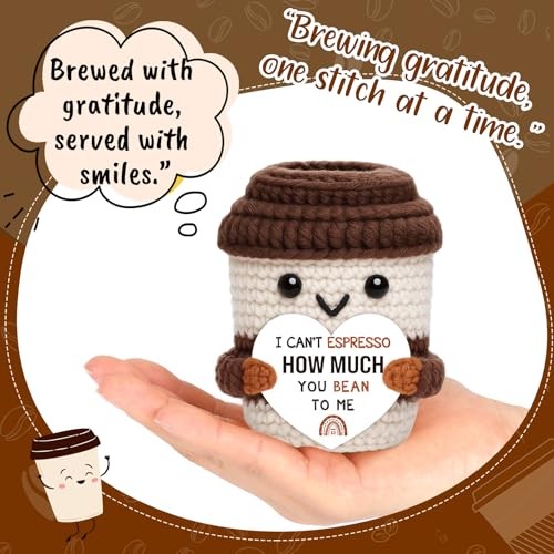 Mini Valentines Day Gifts for Him Her Couple Boyfriend Girlfriend Brown White Description Brew up a smile the coffee way. This handmade crochet cup carries the playful message: “I can’t espresso how much you bean to me.” The espresso/bean wordplay turns appreciation into something warm and memorable—ideal when a text feels too small but flowers feel too much. Made for both gifting and self-care, the mini cup sits by your keyboard as motivational desk decor, a positive reminder, and a gentle daily affirmation between tasks. At home, it nestles onto a coffee bar, coffee station, or tiered tray, and looks charming on a shelf, mantel, or kitchen counter. It’s versatile across occasions: a thoughtful coffee lover gift, sweet note for a partner or best friend, quick birthday surprise, just because pick-me-up, or thinking of you gesture. In the workplace, it’s a hit for coworker gifts, Secret Santa, white elephant, and a compact holiday gift basket filler that won’t feel generic. Handmade with cozy stitches and finished details, each piece has slight variations that make it uniquely yours. Keep it for yourself or share it with the people who “bean” the most to you. Décor item only; not edible. Features: Say it with coffee – “I can’t espresso how much you bean to me” shares affection and gratitude with a light touch. Great for coffee lover gifts, partner or friend surprises, just because gifts, and thinking of you moments. Self-use motivation – Keep it by your keyboard as motivational desk decor, a positive reminder, and a simple daily affirmation when you need a pick-me-up; small size, big mood boost. Coffee corner ready – Cheerful accent for coffee bar decor, coffee station decor, tiered tray decor, kitchen counter, shelf or mantel; a conversation starter that suits baristas and caffeine fans alike. Office & holiday friendly – Easy to gift for coworkers and teams; perfect for Secret Santa, white elephant, and a cheerful holiday gift basket filler or stocking stuffer without taking much space. Handcrafted charm – Soft stitches and neat details; each piece varies slightly. Durable mini décor that “brews” smiles all year. Décor item only; not edible. Product Details: Handling We will ship all orders within 3 business day of payment. Delivery We Do Not Ship Outside of the Continental US. Return Policy All items qualify for returns within 30 days of receipt. Buyer is responsible for return shipping on any item that is not damaged. Feedback We take our reputation seriously, we buy and sell online, so we understand the value of trust. If you are unsatisfied with your order, please contact us and we will work with you to resolve it to your satisfaction.