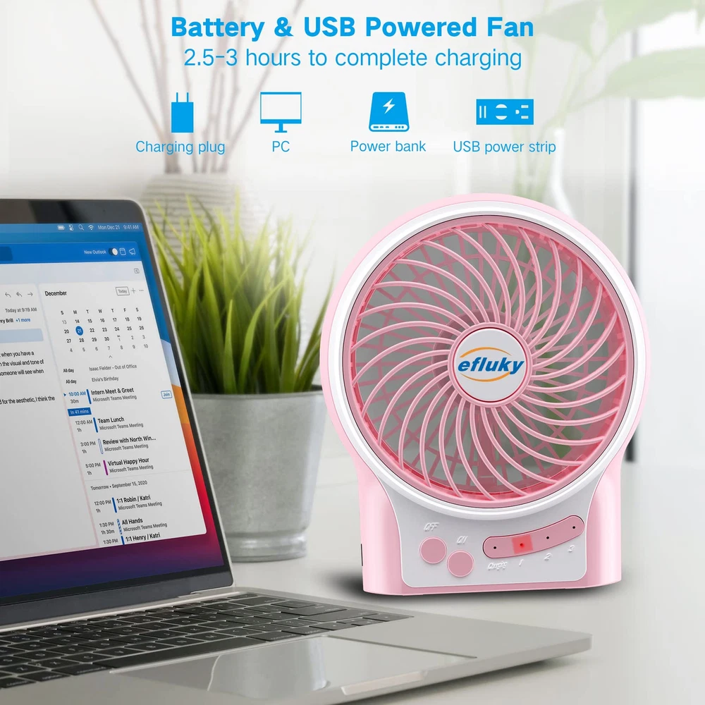 【USB Powered & Battery Powered Fan】This rechargeable fan can be powered by battery or USB. As a battery powered fan, you can handheld use it anywhere, anytime. As a USB fan, you can plug into all USB ports like laptops, power banks and other USB-enabled power supplies . Suitable for various places such as home, office, outdoor or other places. 【3 Speed Level Adjustable】: This small desk fan provides you low/medium/high 3 speed levels to choose. Select the appropriate fan speed by pressing the power button repeatedly. The maximum speed of mini desk fan is up to 3200 rpm to transfer you instant cool feeling. 【Flashlight & Blue Atmosphere Light】: This personal fan is equipped with side flashlight and blue atmosphere light fuction. Pressing the power botton 4 times will turn on the side flashlight. It can be used in the dark when you are outdoors or camping. A long press the power botton you will turn on the blue LED, brings you a beautiful atmosphere. We believe this desktop fan would also be a great gift choice. 【Portable Size & Exquisite Design】: This rechargeable fan enalbed with mini size: 4.9 x 5.6 x 1.4 inches. It's easy to put into a bag and is perfect for travel or camping. Also an handheld fan for , women and men outdoor use in hot summer. 【Long Endurance & Fast Charge】 Full charge takes only 2.5-3 hours and offers you up to 9 hours of continuous working time on low speed setting.