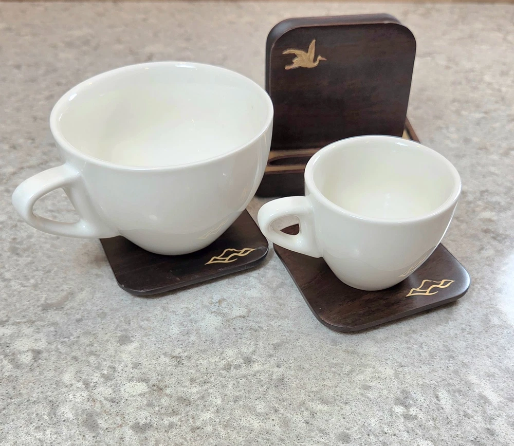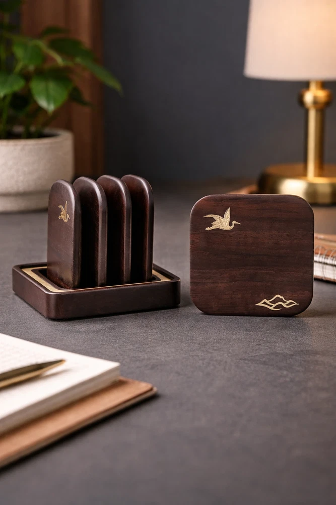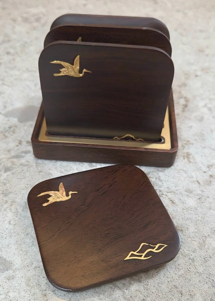 This mini wooden coaster set with holder is designed specifically for shot glasses, espresso cups, sake cups, and small drinks , making it perfect for bars, coffee stations, and compact tabletop spaces. Crafted from solid natural wood with a rich dark finish and elegant gold inlay accents, these coasters protect surfaces while adding a refined rustic touch to your décor. The compact size makes them ideal where standard coasters are too large. ✅ WHAT’S INCLUDED: 4 mini square wooden coasters 1 matching wooden holder ✅ FEATURES: Compact size for shot glasses & espresso cups Solid natural wood construction Decorative gold inlay design Smooth polished finish Space-saving holder keeps coasters organized Ideal for bar carts, coffee bars & small tables ✅ PERFECT FOR: Shot glasses & tasting flights Espresso & demitasse cups Sake cups Bar carts & home bars Unique gift ideas 📌 Care Instructions: Wipe clean with dry or slightly damp cloth. Do not soak. 📏 OFFICIAL DIMENSIONS Individual Coasters: Size: 7.5 cm x 7.5 cm x 0.8 cm (approx. 2.95" x 2.95" x 0.31") Holder (Estimated): Approx: 8.5 cm x 8.5 cm x 3.5 cm order ships the next day after purchasing