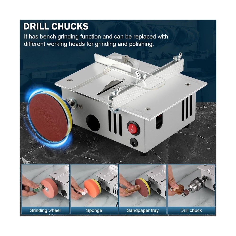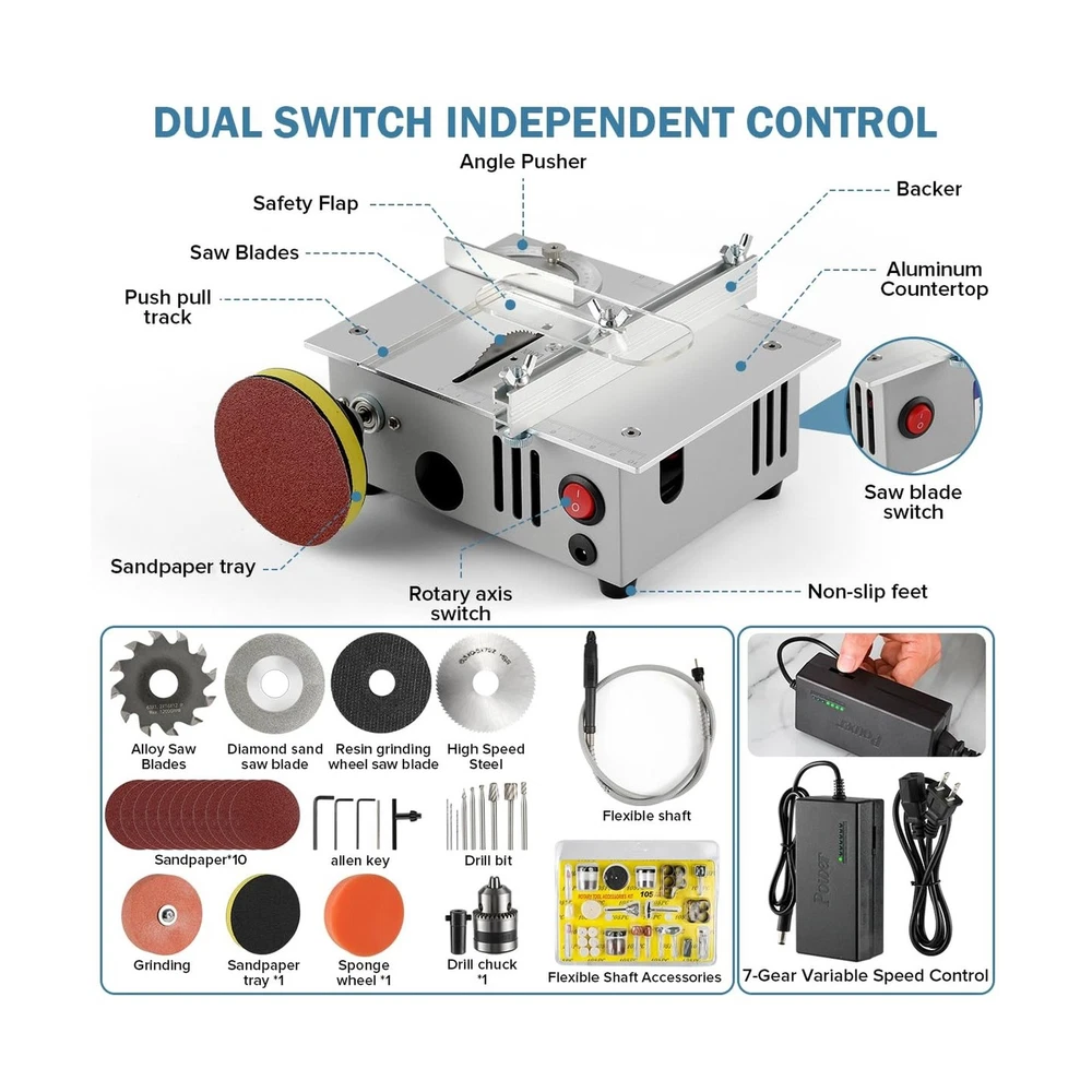 Mini table Saw,mini Table Saws for Crafts, Mini Multi Functional Table Saw, Dual-motor control for cutting, grinding,engraving and drilling.Speed & Angle Adjustable,for Wood/PCB/Acrylic/Plastic Description Features: Dual switch independent controlOur upgraded mini table saw bids farewell to the limitations of traditional single motor! Equipped with two independent pure copper motors and a dedicated independent switch control. The cutting function and grinding/polishing function will not start simultaneously, and each motor can run independently, which not only doubles the power, but also improves safety Adjustable Height FunctionThe mini table saw has the function of adjustable height, with a lifting range of 0-16mm. The adjustable function of the saw blade facilitates precise adjustment of the cutting depth according to the thickness of the material, ensuring cutting effect and accuracy. Lowering the height of the saw blade can reduce exposed parts and avoid accidental contact. When cutting thin materials, lowering the height appropriately can reduce the risk of material bouncing. Adjustable Cutting AngleThe mini table saw According to the desired shape, the cutting plate of the table saw can rotate from 0 degrees to 90 degrees. The front panel of the portable table saw is engraved with clear markings, which can accurately control the cutting angle. With the support of the table saw and the angle dial, the same angle can be quickly set. When making furniture, wood needs to be cut into various angles to achieve seamless connection between different components, such as making a 45 degree photo frame or a 90 degree table and chair frame. Four different saw bladesMini table saw set includes 4 different types of saw blades:PCB cutting blades, high-speeds steel saw blades, alloy saw blades, and resin saw blades. Mini table saw can cut include: PCB boards, wood sticks, plastic sheets, thin wood boards, copper-clad boards, aluminum tubes, copper tubes, etc. Mini Multifunctional Table Saw: The mini multi-functional table saw is a multi-functional table top tool Can be cut, polished, engraved.our equipped with drill chuck and sanding disc, it can hold drilling heads with a shank diameter of 0.5-3.2mm.The craftsman saw can also be fitted with a flexible shaft to drill or engrave items. The saw table set comes with over 100 small parts for your use,Make our small handicrafts an essential tool for every craftsman. Product Details: Brand: Nicklaua Color: Silver Blade Material: Alloy Steel Surface Recommendation: Aluminum Power Source: Corded Electric Brand: Nicklaua Color: Silver Blade Material: Alloy Steel Surface Recommendation: Aluminum Power Source: Corded Electric Special Feature: Brushless Included Components: Mini Table Saw Product Dimensions: 8"L x 4"W x 3"H Item Weight: 2.88 Kilograms Number of Teeth: 50 Cutting Angle: 90 Degrees Blade Shape: Rectangular Handle Material: Aluminum Manufacturer: Nicklaua Item Weight: 6.34 pounds Item model number: TJ-02 Style: Set2 Material: Aluminum Item Package Quantity: 21 Special Features: Brushless Batteries Included?: No Batteries Required?: No Date First Available: June 17, 2025 Delivery We Do Not Ship Outside of the Continental US. Return Policy All items qualify for returns within 30 days of receipt. Seller is responsible for return shipping on any item that is not damaged. Feedback We take our reputation seriously, we buy and sell online, so we understand the value of trust. If you are unsatisfied with your order, please contact us and we will work with you to resolve it to your satisfaction.