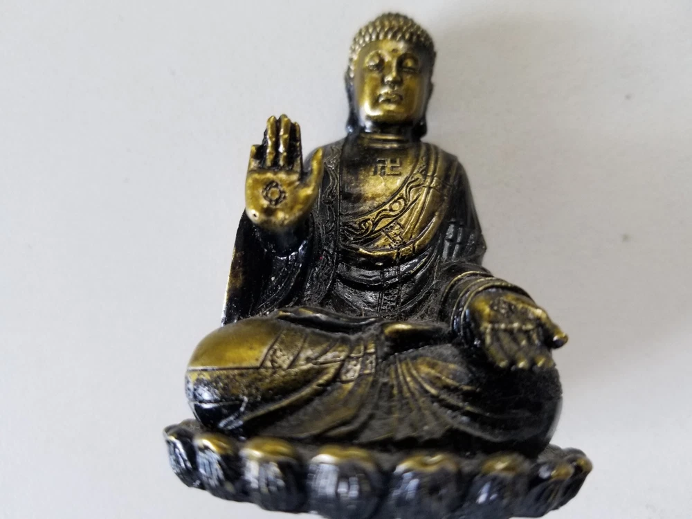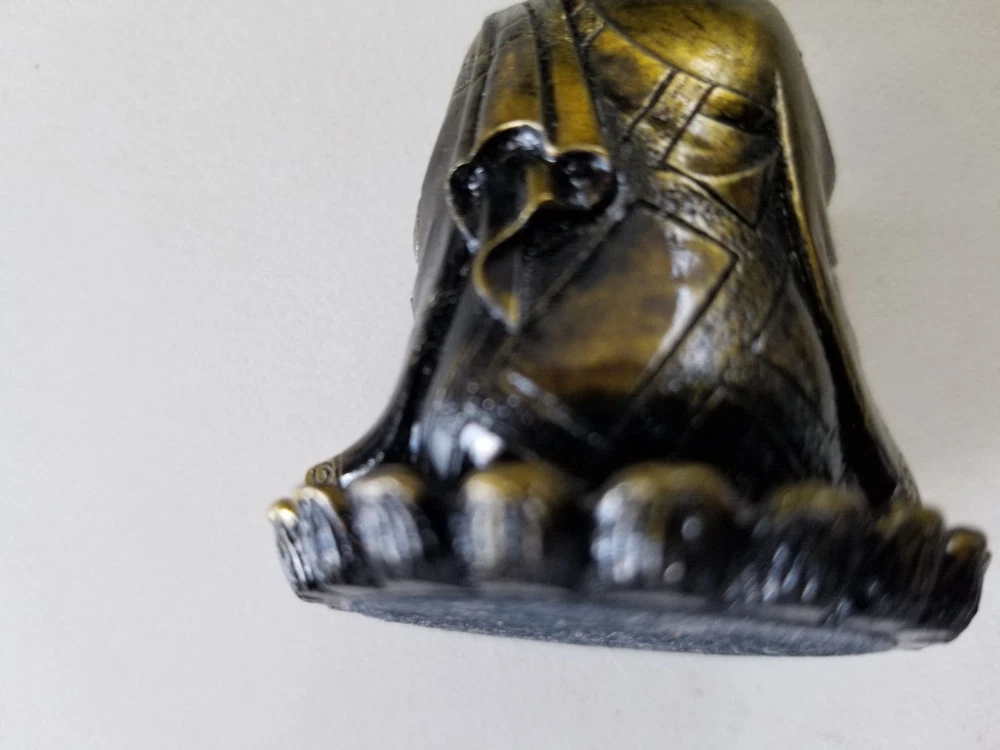 This miniature Buddha figurine is a majestic and intricate decoration piece that will be a wonderful addition to your collection. It is made of high-quality resin and sports a glorious gold tone that is sure to give it a regal appearance. Measuring 2.5 inches, the figurine is perfect for display on a shelf or tabletop, making it an excellent gift for any Buddhist art enthusiast. Very good preowned condition with no flaws. Please view photos.