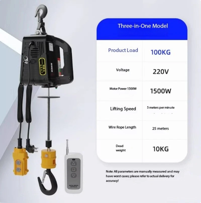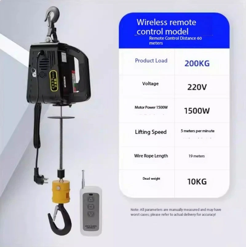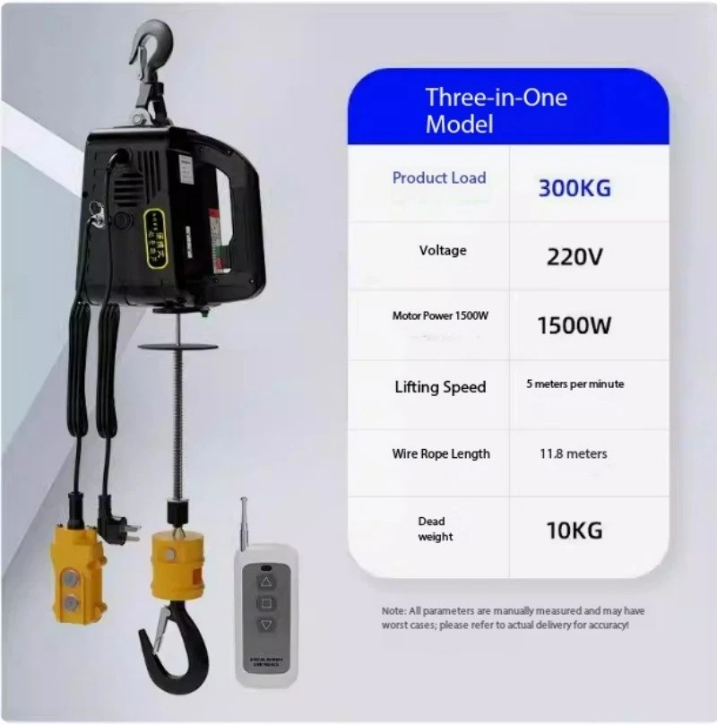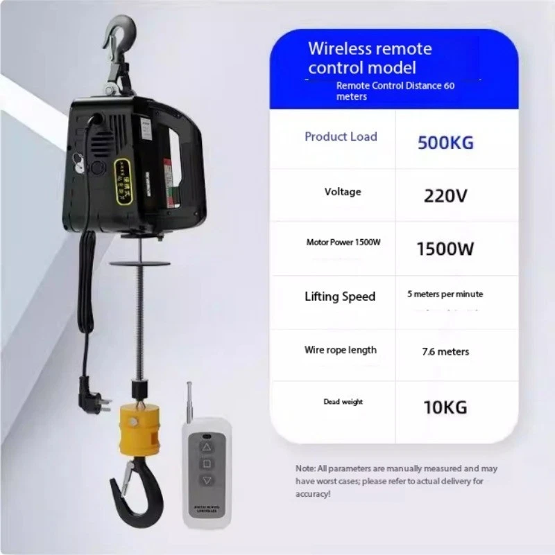 Mini Electric Hoist 220V Portable Home Use Small Crane Compact Lift Remote-Controlled Winch Product Load Capacity: 100KG Voltage: 220V Motor Power: 1500W Lifting Speed: 5 meters/minute Wire Rope Length: 25 meters Net Weight: 10KG Note: All parameters are manually measured and may be subject to slight variations. Actual product specifications prevail upon delivery! Product Load Capacity: 200KG Voltage: 220V Motor Power: 1500W Lifting Speed: 5m/min Wire Rope Length: 19m Net Weight: 10KG Note: All parameters are manually measured and may vary. Actual product specifications may differ upon delivery. Product load capacity: 300KG Voltage: 220V Motor power: 1500W Lifting speed: 5m/min Wire rope length: 11.8m Net weight: 10KG Note: All parameters are manually measured and may be subject to slight variations. Actual product specifications may differ upon delivery. Product load capacity: 500KG Voltage: 220V Motor power: 1500W Lifting speed: 5m/min Wire rope length: 7.6m Net weight: 10KG Note: All parameters are manually measured and may be subject to slight variations. Actual product specifications may differ upon delivery.