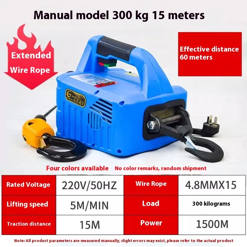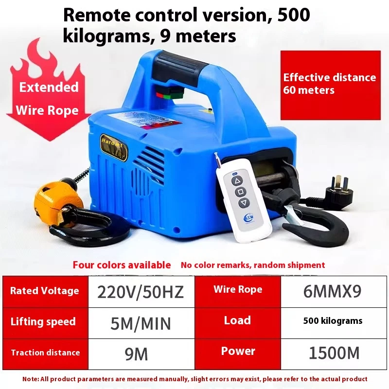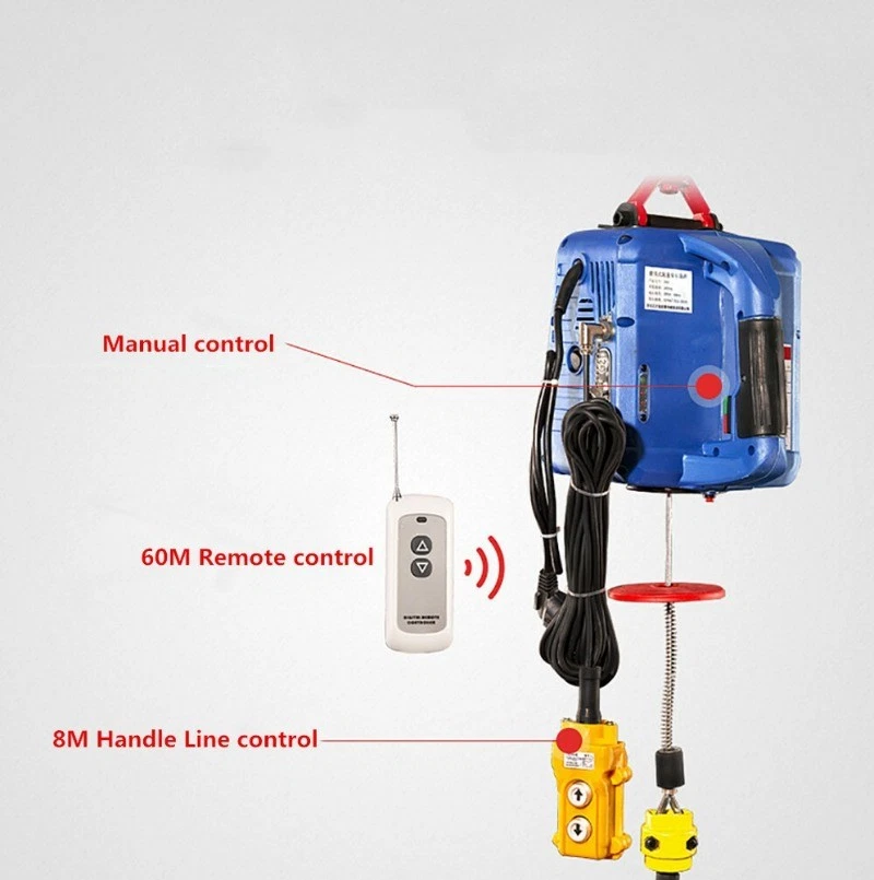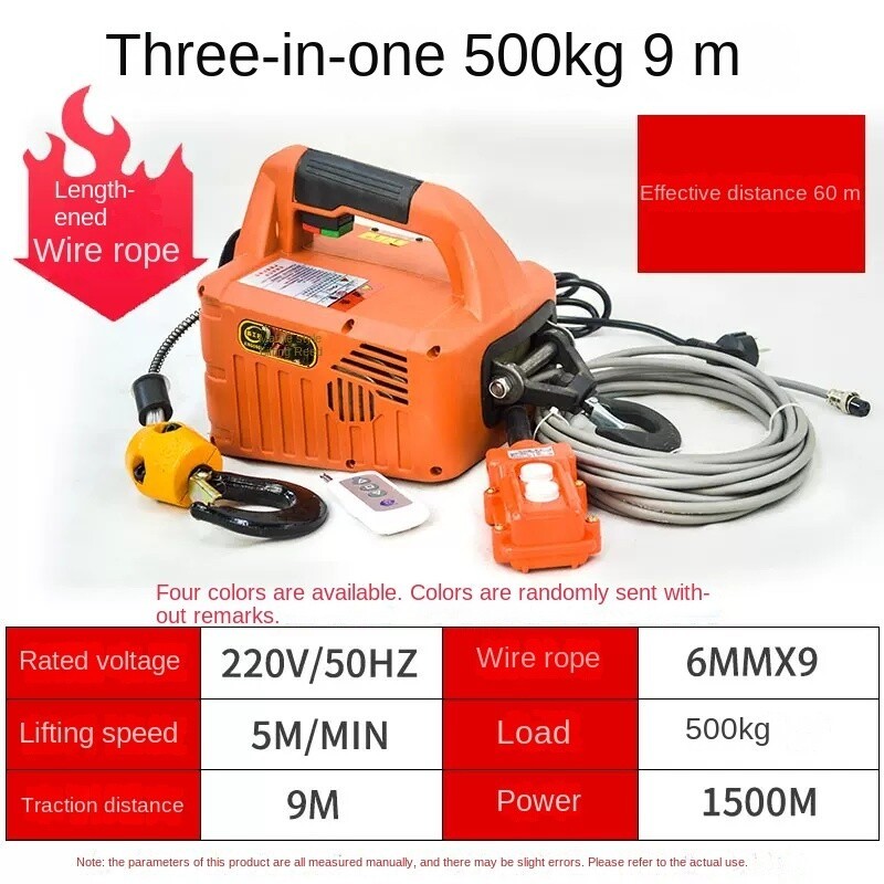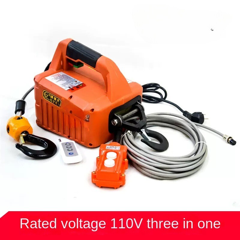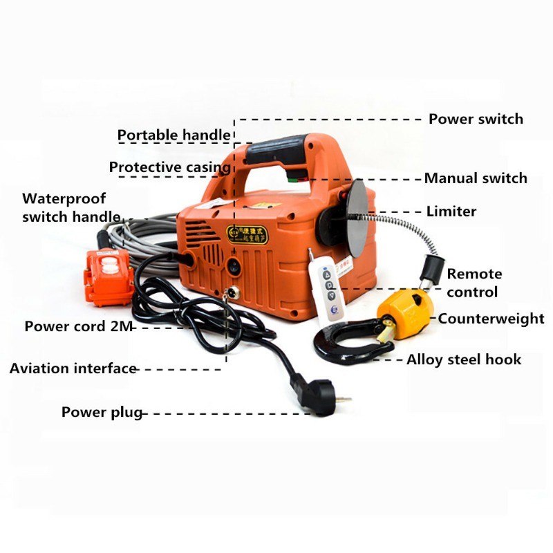 Miniature electric hoist 220Vporta blehome air conditioner traction crane lifting hoist small crane voltage:AC 110V/60HZ or 220V/50HZ Power 1500W Traction distance: 7.6M Wire rope: 6MM*7.6 Load: 500KG Packing size: 38x32x25CM Weight: 12KG