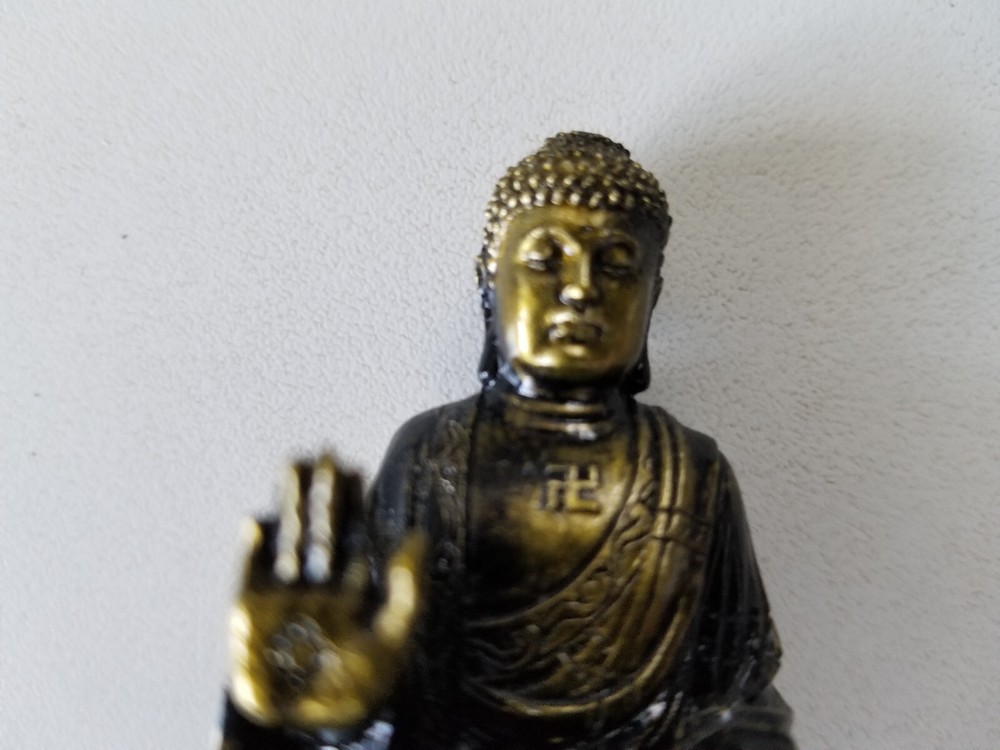 This miniature Buddha figurine is a majestic and intricate decoration piece that will be a wonderful addition to your collection. It is made of high-quality resin and sports a glorious gold tone that is sure to give it a regal appearance. Measuring 2.5 inches, the figurine is perfect for display on a shelf or tabletop, making it an excellent gift for any Buddhist art enthusiast. Very good preowned condition with no flaws. Please view photos.