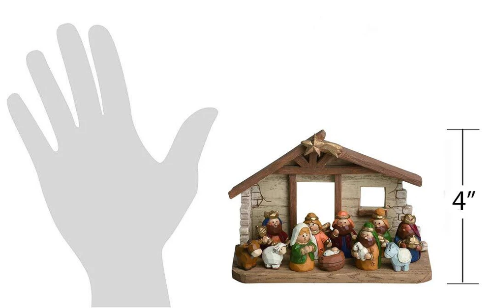 Charming Christmas Nativity Set of 11 Figurines with Crèche Figurines and creche are made of cast resin Traditional stable with exposed rafter architecture and the Star of Bethlehem above Figures include Baby Jesus, Mary, Joseph, Three Wise Men, Angel, Shepherd and animals Provides festive charm and brings joy to your home this holiday season