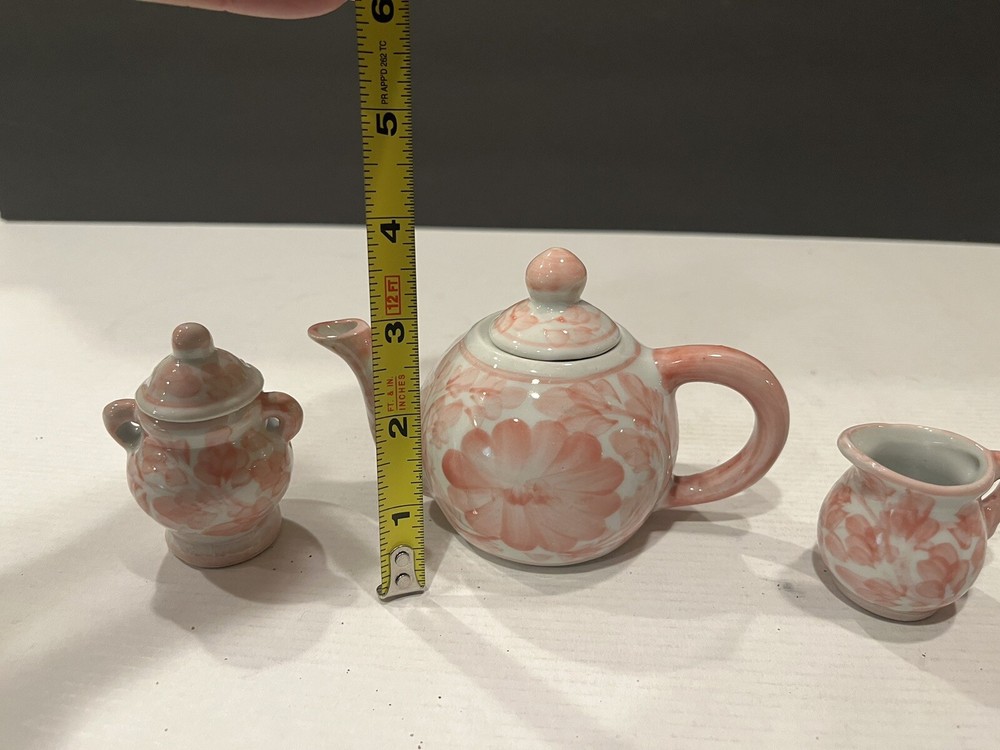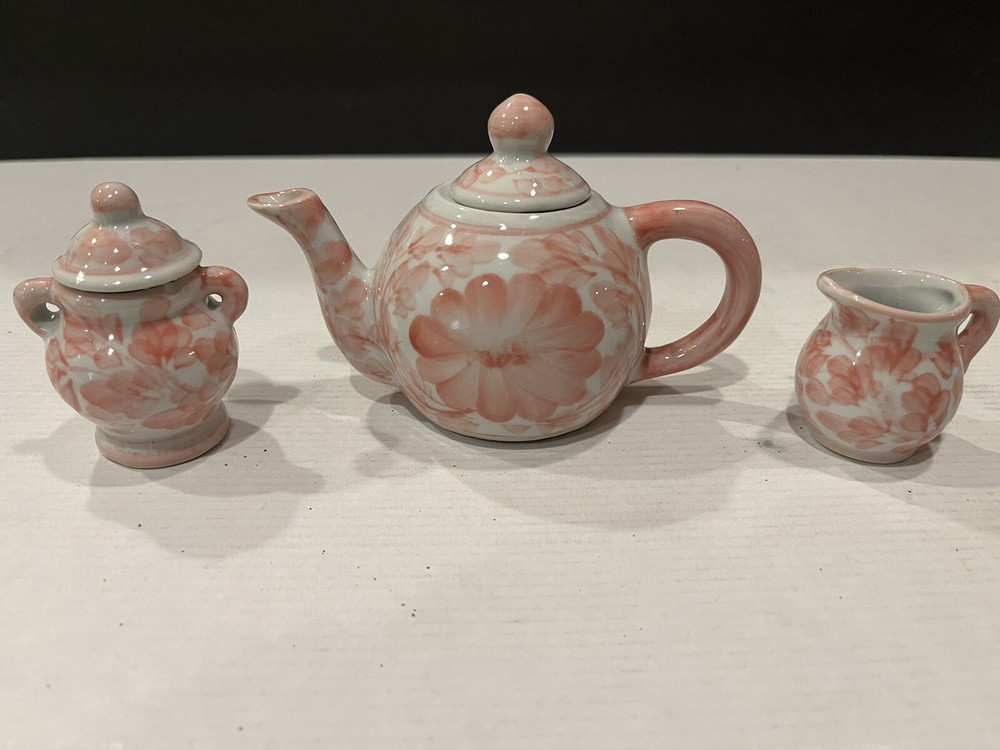 Finish: Painted Style: Victorian Size: Small Subject: mini teapot Number in Pack: 3 Type: Minature Teapot, Sugar Bowl And Pitcher Pattern: Flower Collection: trinket box Material: Porcelain Color: Red Floral Brand: Unbranded Occasion: All Occasions