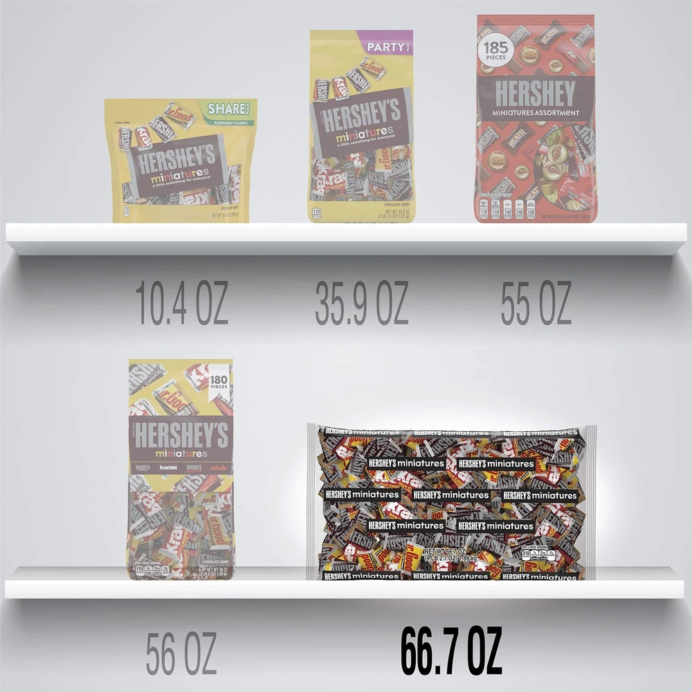 There's something for everyone in this Miniatures assortment. Find miniature versions of all your favorite chocolate bars in one sweet bag, including milk chocolate bars, SPECIAL DARK mildly sweet chocolate bars, KRACKEL chocolate candy with crisped rice and MR. GOODBAR chocolate candy with peanuts. Enjoy delicious candy classics individually wrapped for lasting freshness and convenience all year long. Perfect for lunch boxes, movie nights, game nights, snack breaks, sharing moments and candy dishes at home and in the office, these milk and dark chocolate miniatures will keep your snacking fun and simple. Give a variety of chocolates to your favorite people on Easter, Valentine's Day, Halloween, Christmas or an ordinary day when you're in a generous mood. Want to take these treats a step further? Place a Miniatures chocolate bar on top of your best baked goods to please the crowd with your culinary genius! Contains one (1) 66.7-ounce bulk bag of Miniatures in an assortment featuring Milk Chocolate, SPECIAL DARK Mildly Sweet Chocolate, KRACKEL Milk Chocolate with Crisped Rice and MR. GOODBAR Chocolate Candy with Peanuts Fill snack drawers, candy dishes and lunch boxes with variety chocolate candy sure to sweeten any season Certified kosher milk and dark chocolate bars individually wrapped for easy storage and lasting freshness Perfect for graduations, back to school preparation and birthday parties A delectable assortment of smooth milk chocolate, milk chocolate with peanuts, milk chocolate with crisped rice and semi-sweet dark chocolate