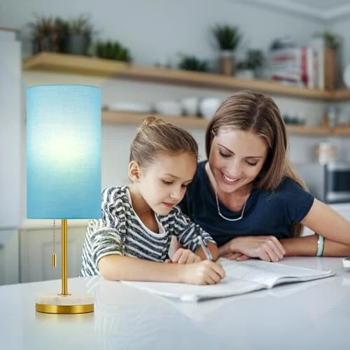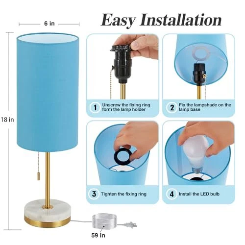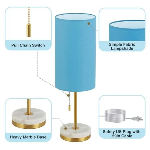 Return Policy Fast Delivery Trusted seller Minimalist Table Lamp Set of 2, Nightstand Lamp for Bedroom Living Room, Modern Pull Chain Bedside Lamp with Marble Base, Fabric Shade, Small Desk Lamp for Home, Office, Reading,Blue Product Description 【Minimalist Lamp for Small Spaces】Lamps dimensions - 18 x 6x 6inches, the marble table lamps are small in size so they can fit anyw in your house. Table lamp for living room, bedroom, dorm, study room, guest room, kids room and so on. With a white linen shade and marble + metal base, the small table lamp is exquisitely crafted and ideal as a gift for family and friends. 【Reading Lamp with Marble Base & Eye Caring Shade】 The night lamp with high quality Marble + Metal base which have upgraded finish is anti-rust and corrosion free. The heavy base can prevent it from tipping or wobbling and the thick pole design will hold the lamp shade steadily, no shaking. Besides, the fabric shade make the lamp spreads relaxing, comfortable, evenly and soft lighting, which creates a comforting ambience to protect your eyes. 【Gold Lamp Table with Pull Chain 】 The pull chain switch is easy to operate, just pulling. This office lamp has an E26 standard base socket. You can customize your stylish lighting with different shapes or different colors of any E26 base light bulbs to create your unique decoration. (Bulbs not included) 【Easy to Install & Heavy Base】You can easily complete it in just a few minutes. (Tips: the base of each study lamp is made of natural marble, so the textures may be inconsistent or less, which makes each lamp unique.)Metal&Marble base will not shake easily,The base contains non-slip pads to prevent accidental tipping. 【No-worry Buy】: Each product has been well tested by the manufacturer to ensure high-quality product before being shipped. If you have any questions about our lamps, please contact us, we will provide you with the fastest and friendly service within 24 hours. Shipping Returns Payment Shipping Shipping is FREE to all addresses other than APO/PO boxes in the lower 48 states. All our stock ships from US-based warehouses. Shipped via USPS or UPS (depending on location and package weight) Unless stated otherwise, all orders will ship within 24-72 hours of your payment being processed. Check our feedback to see the great reviews of FAST shipping we offer. Returns Seller does not accept returns Payment We currently accept payment via eBay managed payments only. Once payment is cleared, we will dispatch your shipment within 1-3 business days. Please refer to the "Shipping" tab for more information regarding shipping speed to your destination.