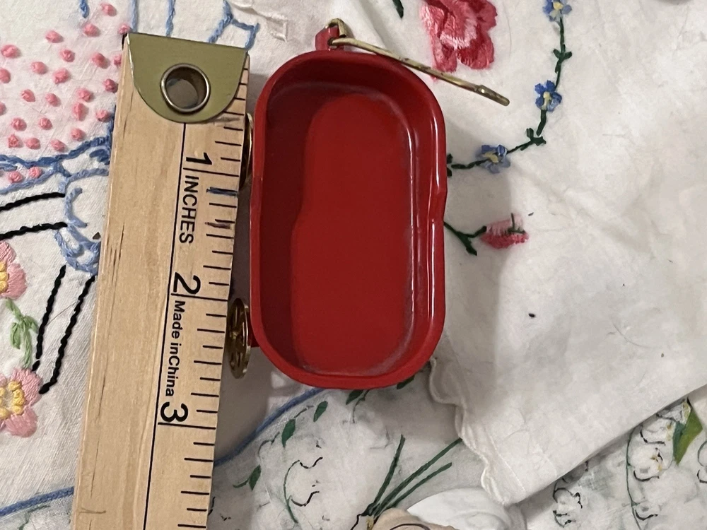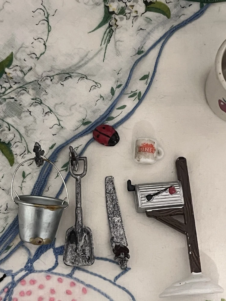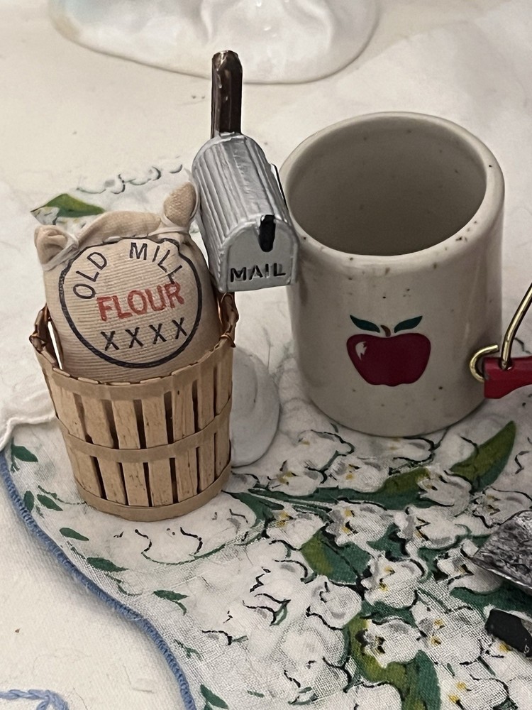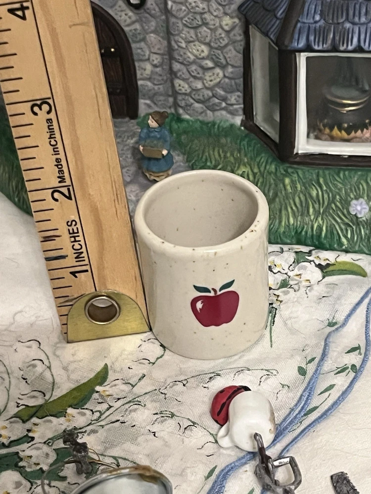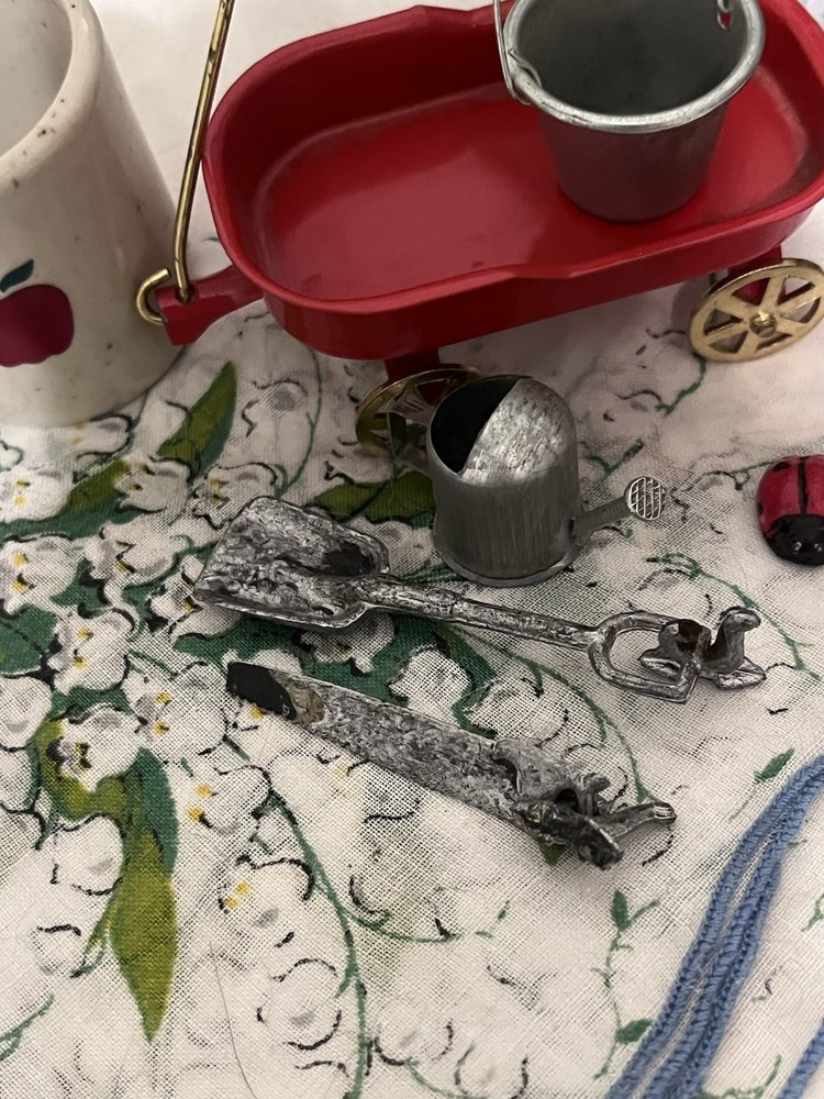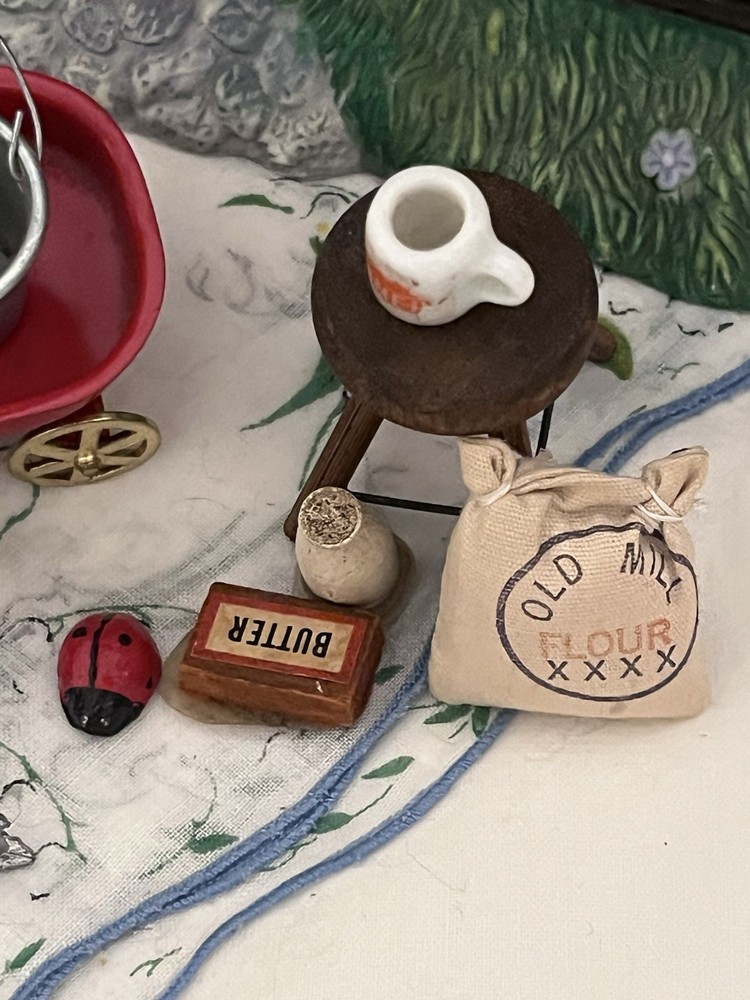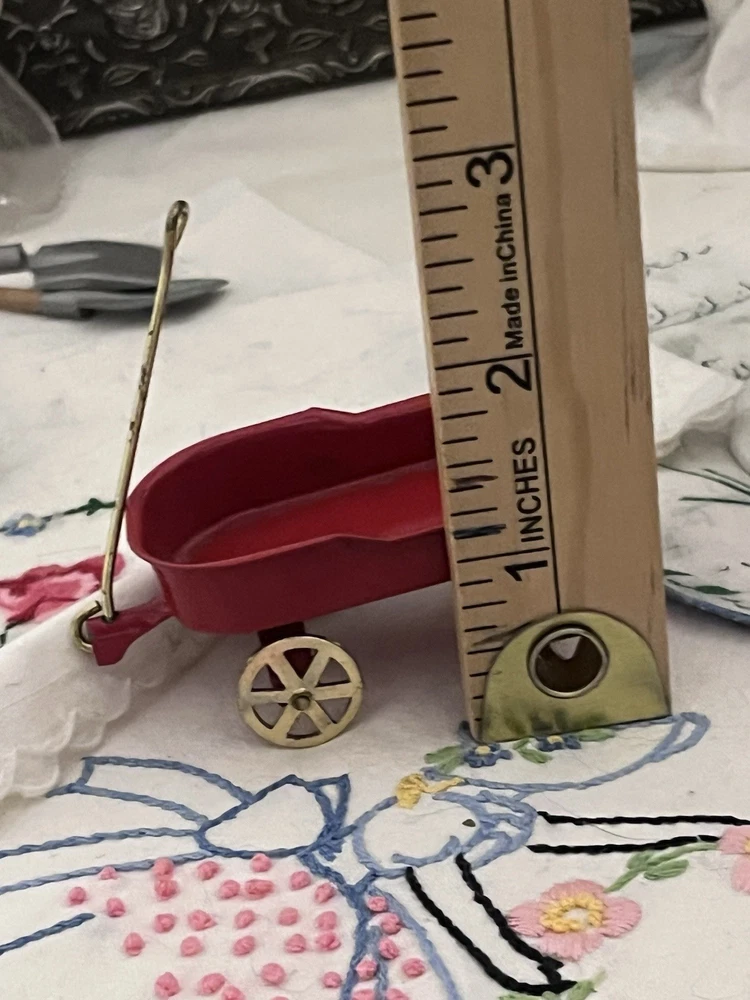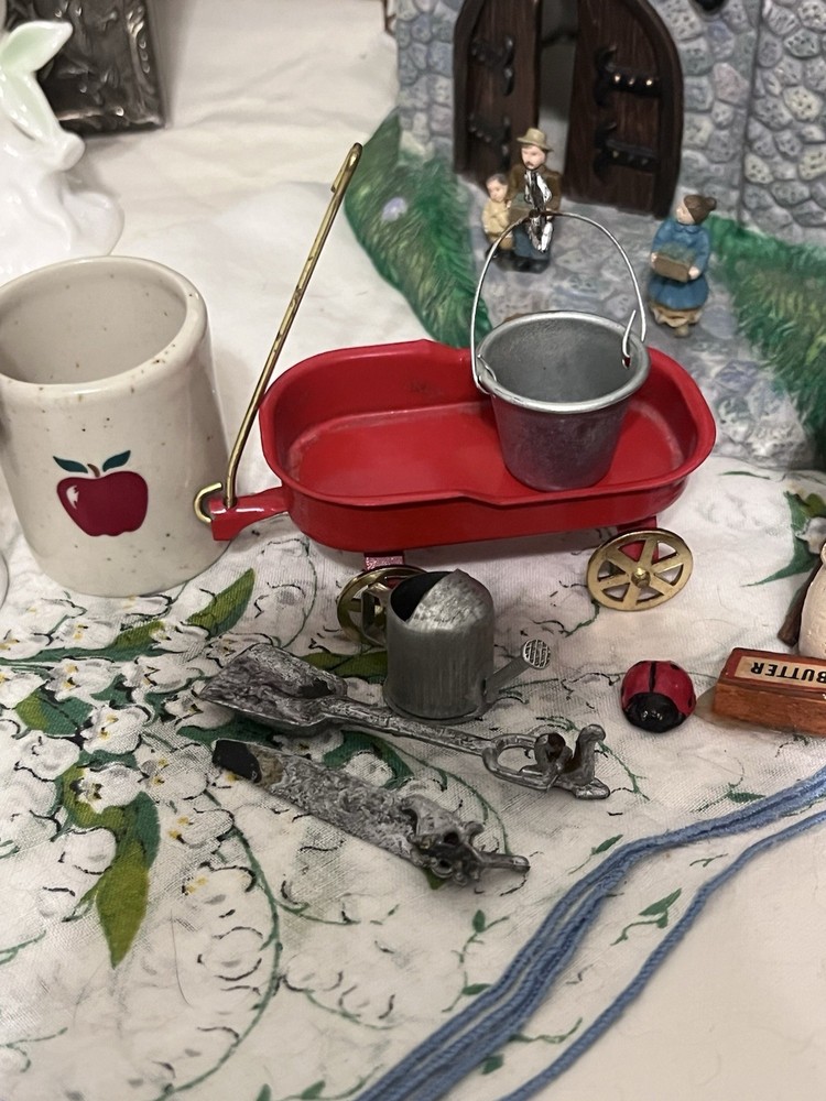 The red wagon is too cute this is made of metal and has the handle. The little tools and bucket could also be hung as you will see they look like on a hook. Theres a little water can, basket, apple crock and more. Yes that is a tiny coffee cup a farmer needs his caffeine. The little milk stool is wooden. I really don’t know scales why photos by ruler. I just use as displays and scenes. Please see all photos for details part of the item descriptions. You will receive all. I also have more of the feed sakes sold in another lot. Also really old chickens made of wood. Please ask any questions all sold as is and all sales finale. Comes from clean smoke free home. Thanks Does not included decor in background or vintage textiles shown on.
