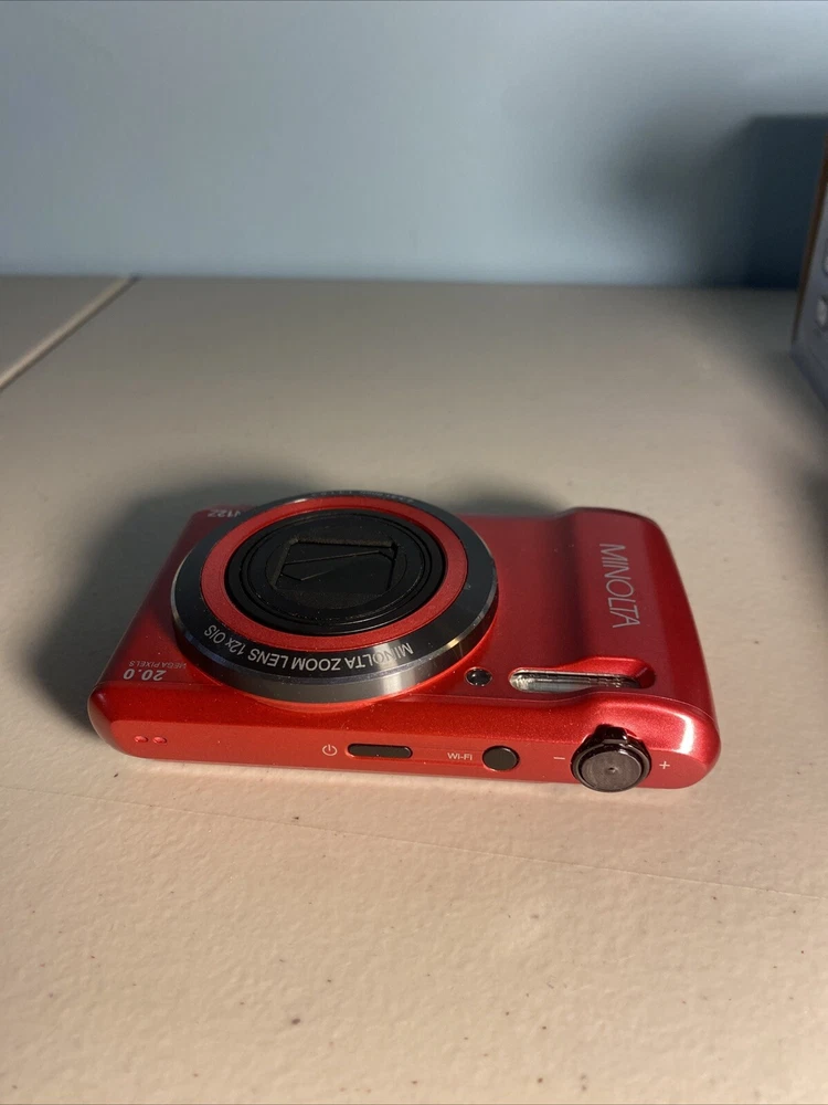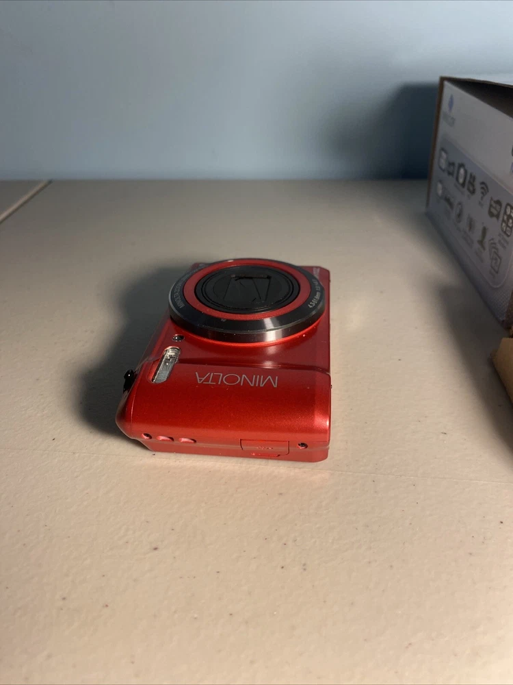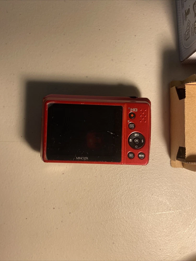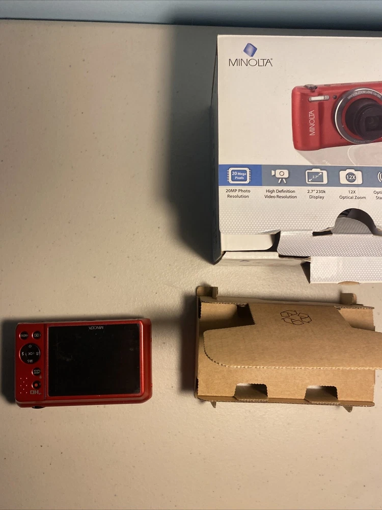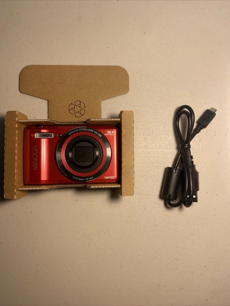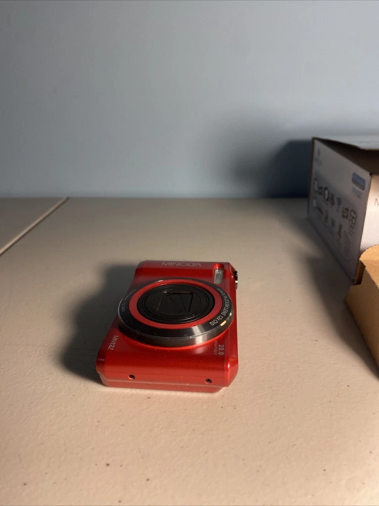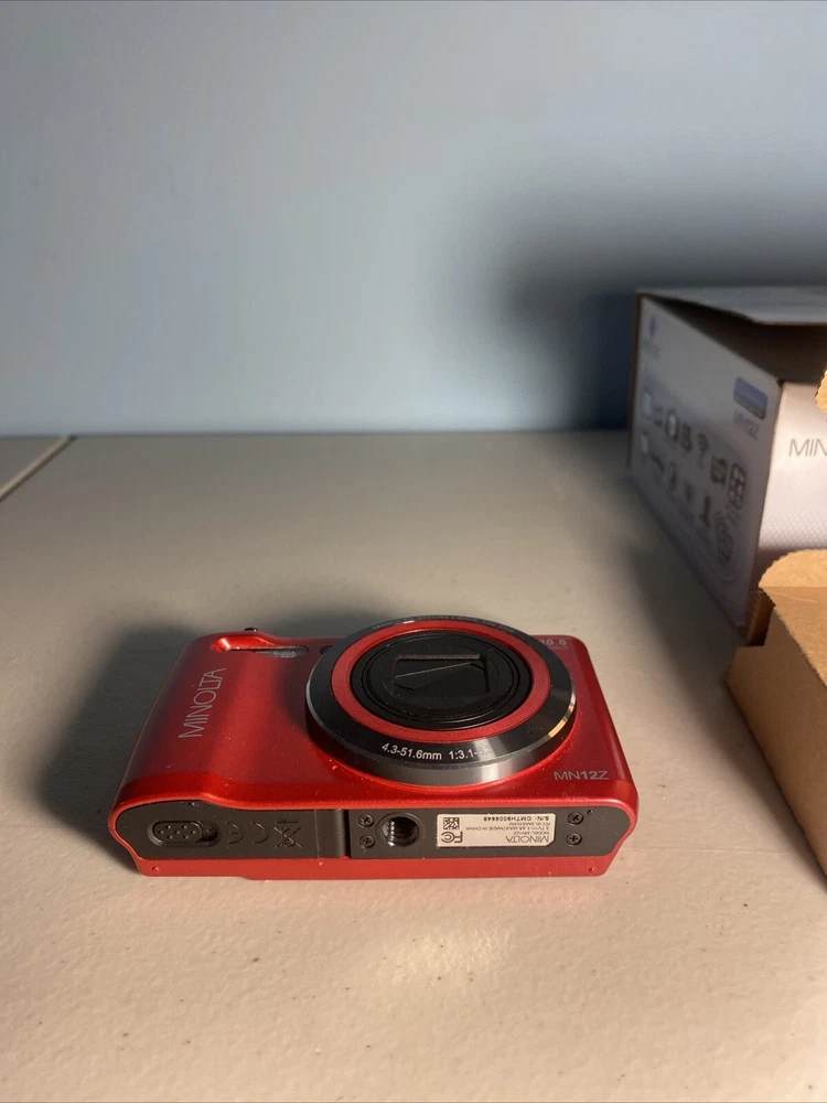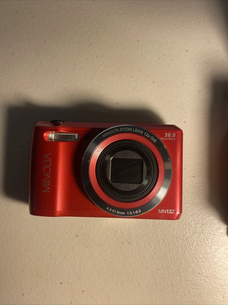 The Minolta MN12Z digital camera in red is an open box item being sold untested. It includes a charger but does not come with a battery. This digital SLR camera is ideal for photography enthusiasts looking for a compact and reliable option. Note on condition: Visible tearing of SCREEN PROTECTOR on back Untested