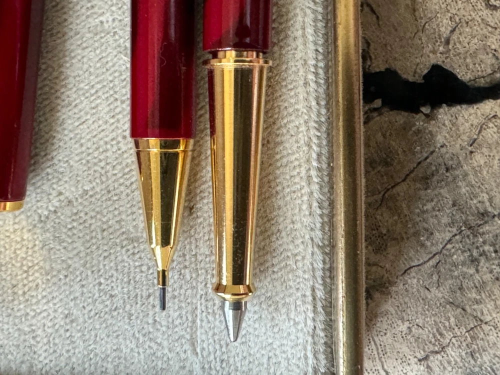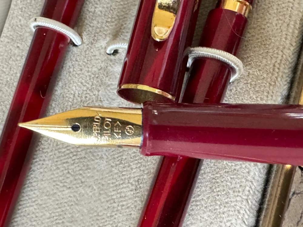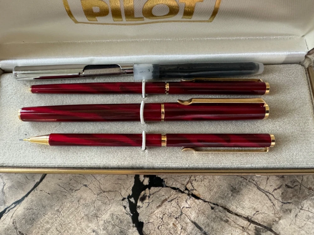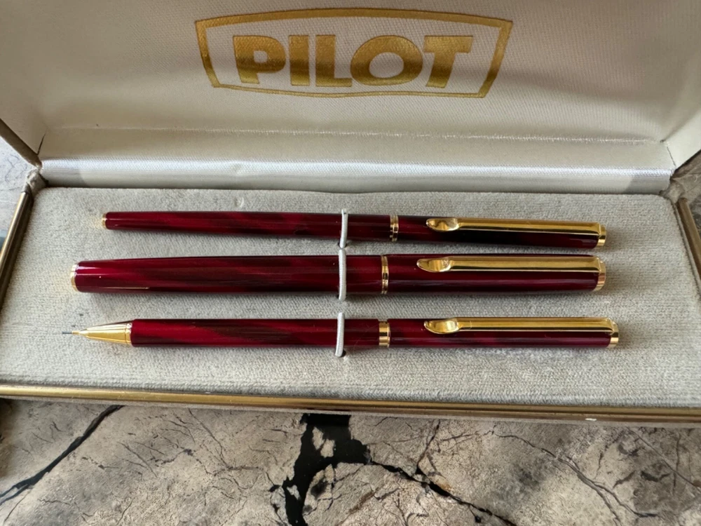 Elevate your writing experience with this mint condition vintage Pilot 3 piece fountain pen, ballpoint, and mechanical pencil set. This vintage set is made in Japan and features a deep glossy Chinese red exterior finish with a gold finish superloy pilot F nib. A great collectible and perfect for those who love wonderful writing instruments. Comes with original light tan faux suede box. Buyer pays $10.00 domestic shipping.
