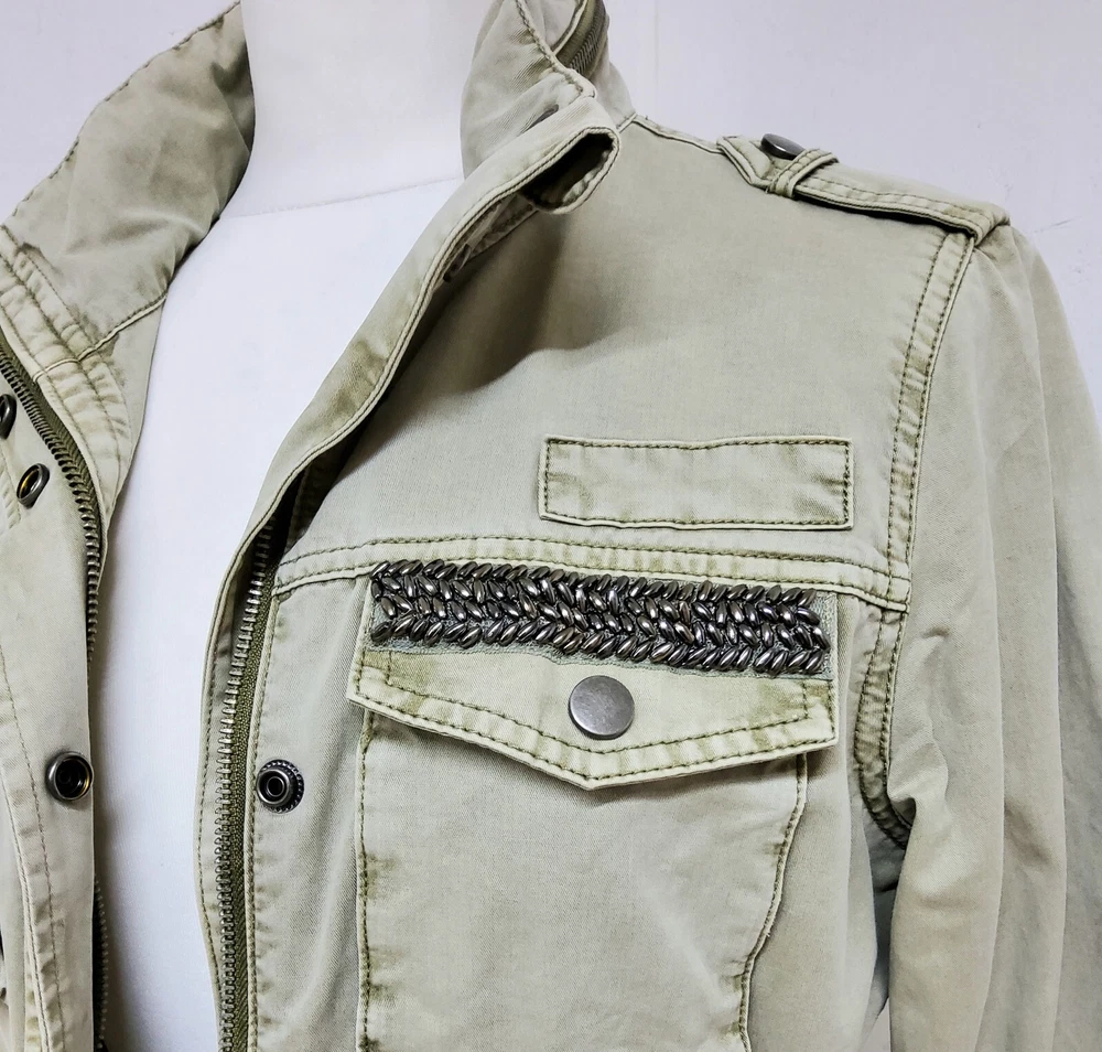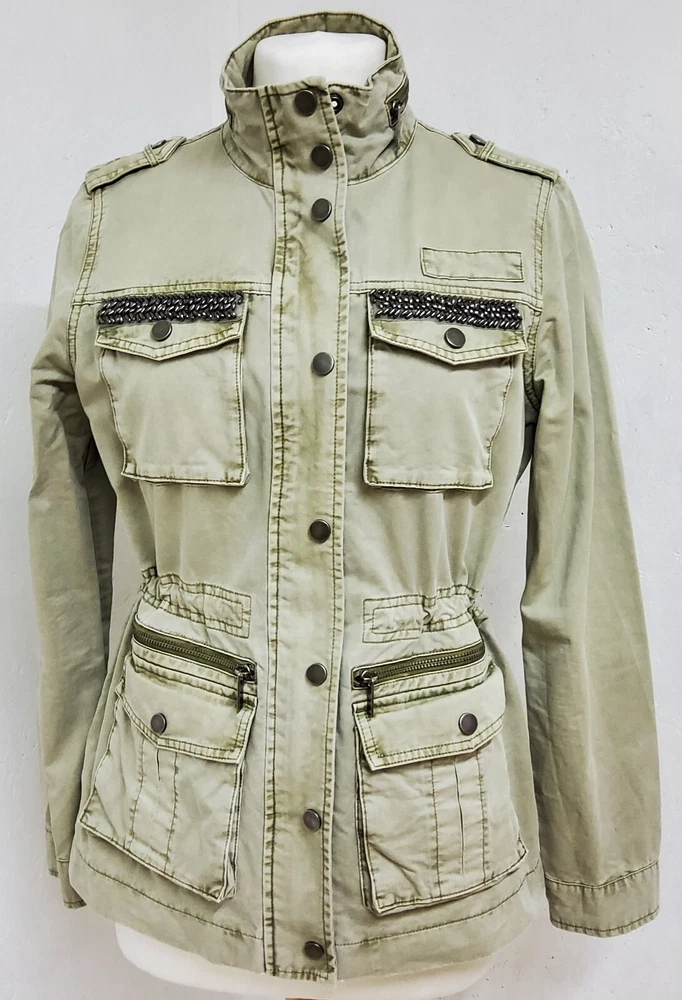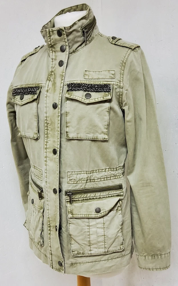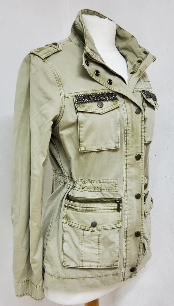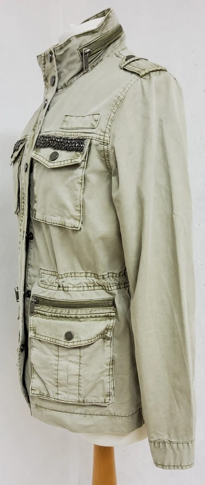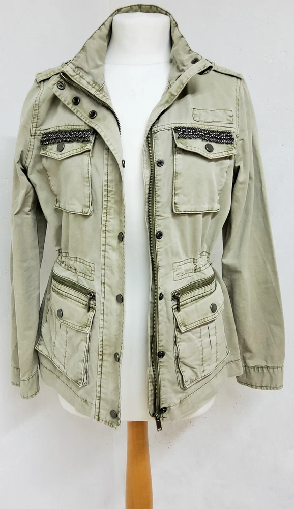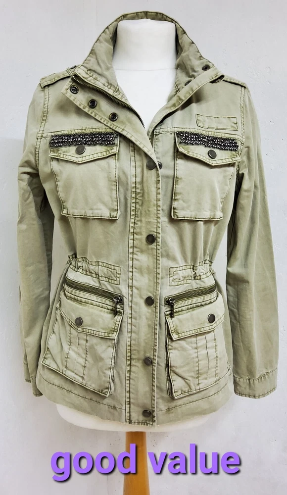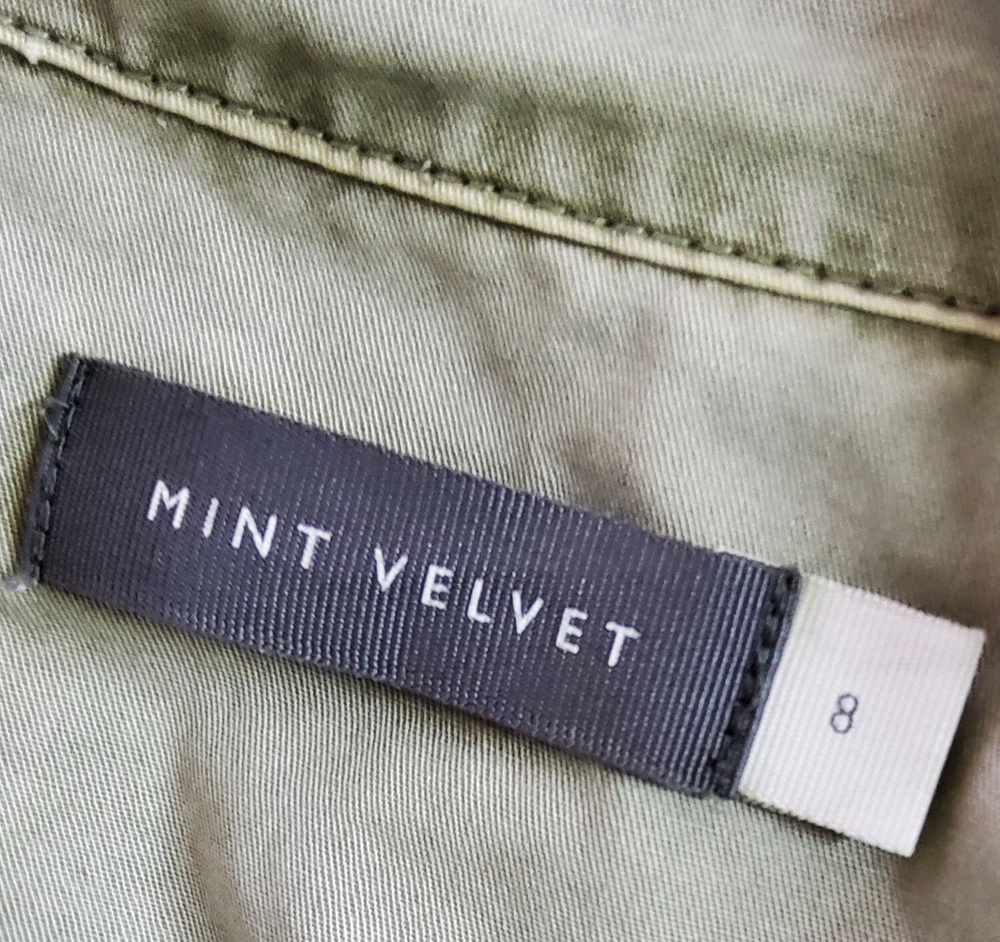 Style: Military Jacket Fabric Type: Denim Outer Shell Material: Cotton Type: Jacket Colour: pale khaki green Department: Women Size Type: Regular Brand: Mint Velvet Size: 8 Features: Stretch