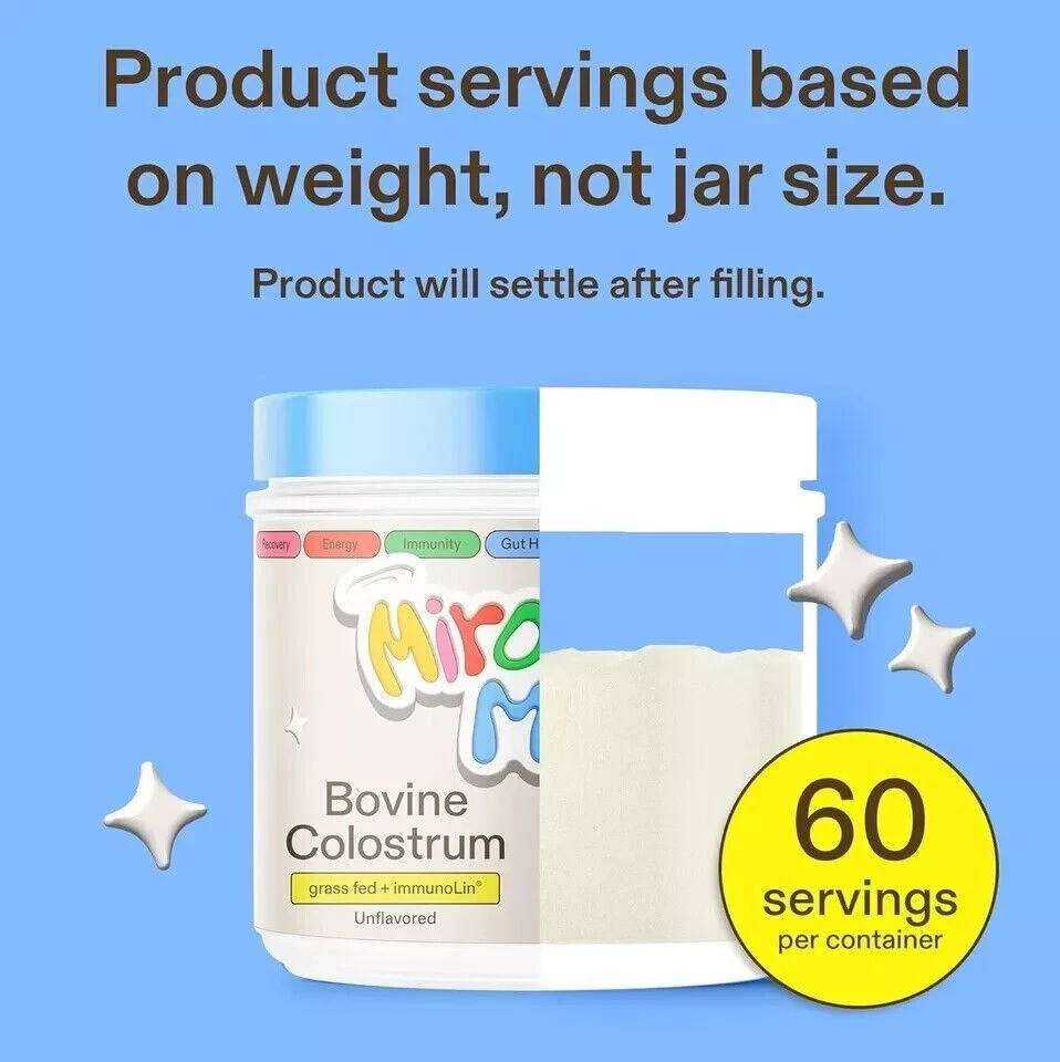 Miracle Moo Bovine Colostrum Powder – Immune & Gut Support, 60 Servings 2027 Expiry Miracle Moo Bovine Colostrum is a high-potency, immune-supporting supplement made from ethically sourced, first-milking colostrum from grass-fed, pasture-raised cows in the USA. Rich in naturally occurring immunoglobulins (IgG), lactoferrin, growth factors, and proline-rich polypeptides (PRPs), it supports immune defense, gut lining integrity, skin clarity, and overall vitality. Each serving delivers a powerful dose of 600 mg of IgG , thanks to the inclusion of ImmunoLin® —a premium, clinically studied colostrum concentrate known for its immune-enhancing properties. Free from hormones, antibiotics, and artificial ingredients, Miracle Moo is formulated for purity, potency, and ease of use. 🌟 Key Benefits : Immune System Support – High IgG content helps defend against pathogens and supports immune resilience. Gut Health & Repair – Promotes a healthy gut lining and microbial balance, aiding those with leaky gut or digestive discomfort. Skin & Hair Clarity – Users report clearer skin, stronger nails, and improved hair health. Hormone-Free & Non-GMO – Sourced from U.S. dairy farms that follow ethical and sustainable practices. Unflavored & Versatile – Easily mixes with water, smoothies, or coffee without altering taste. 🕒 When to Take : Take one scoop daily , ideally in the morning on an empty stomach to enhance absorption and gut repair. May be taken at night for additional digestive or immune support. 🧪 What’s Inside : Grass-fed bovine colostrum ImmunoLin® (50% IgG) Naturally occurring peptides, vitamins (A, D, E), and essential amino acids No sweeteners, colors, or fillers 🚫 Free From : Gluten Soy Artificial additives Antibiotics & hormones
