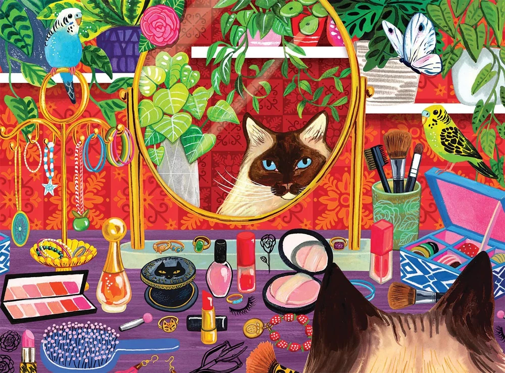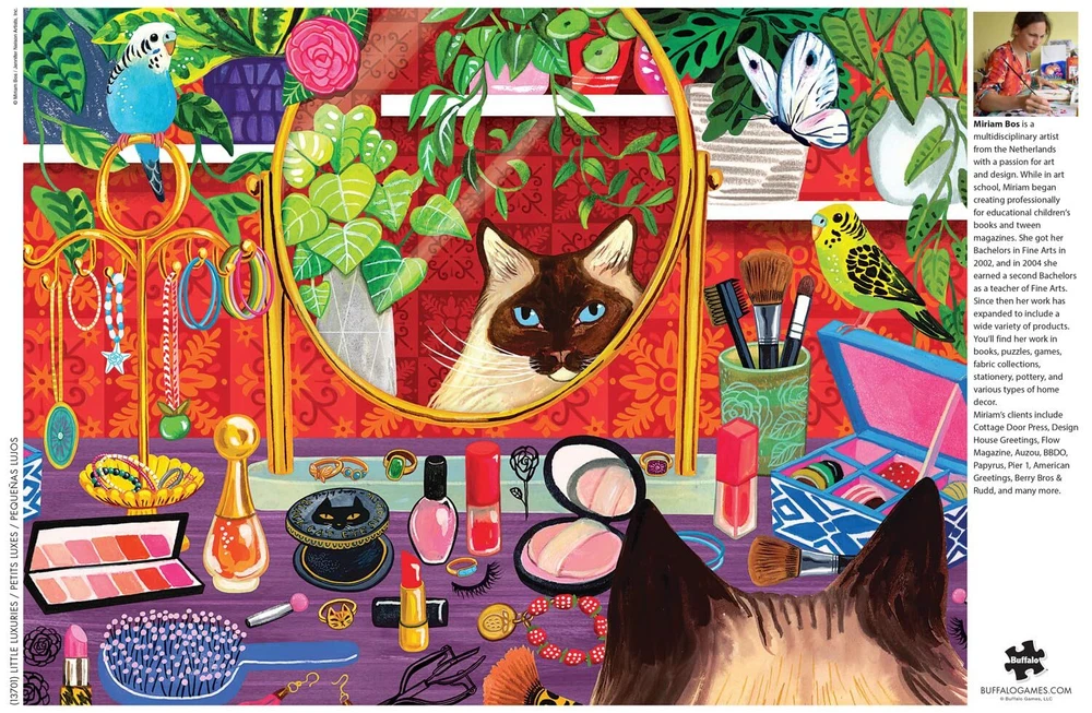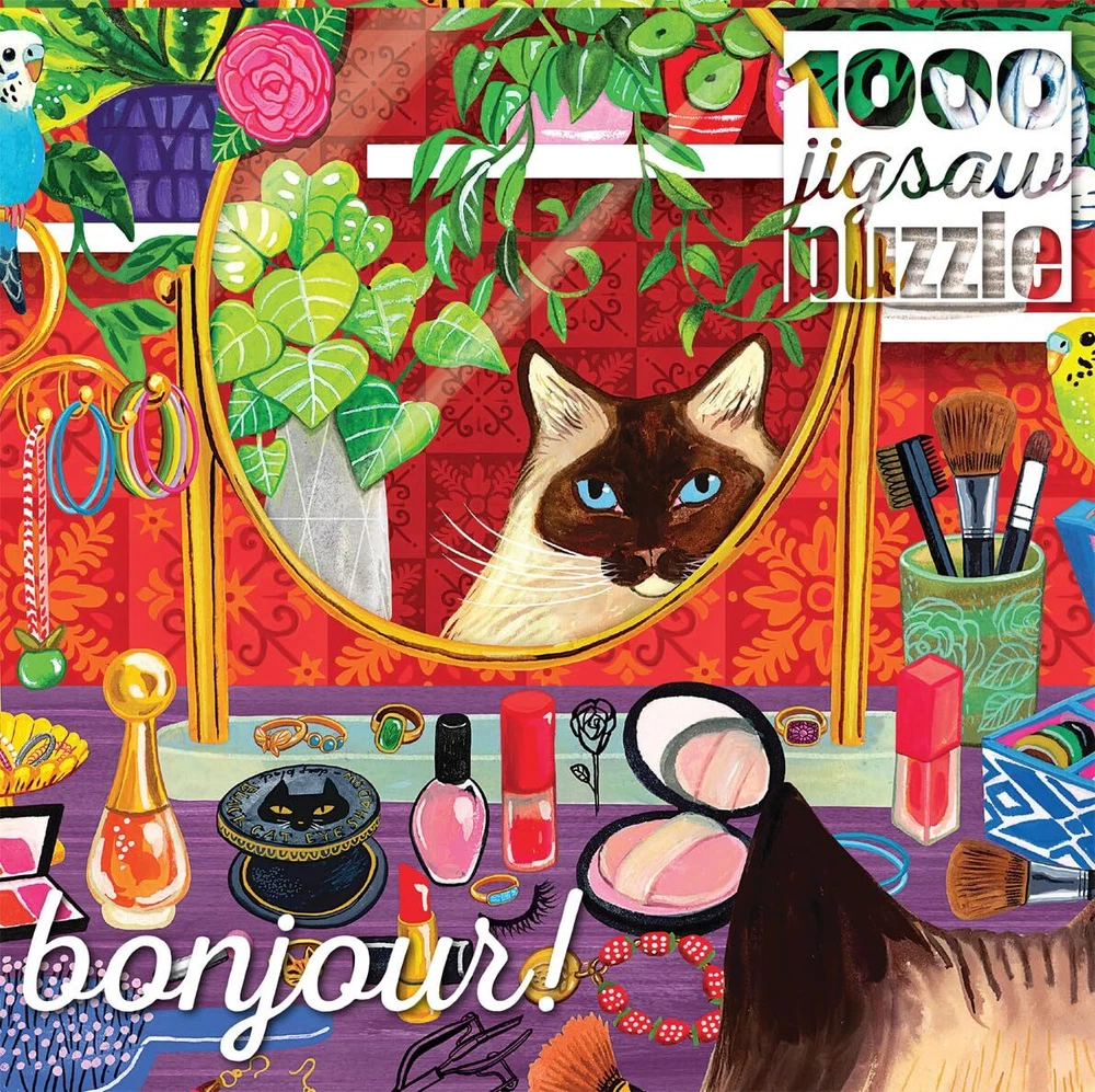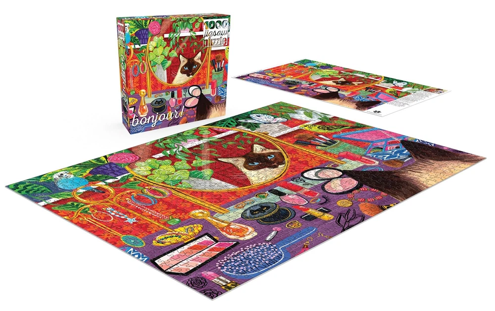 Enjoy piecing together this 1000-piece premium jigsaw puzzle from the BONJOUR! line titled Little Luxuries. This puzzle depicts a colorful vanity set up, with makeup, hair ties, and jewelry all strewn about. Looking into the mirror is a Siamese cat who seems to have taken over her owner’s spot, as bird friends watch on! Say BONJOUR! to your new favorite puzzle. BONJOUR puzzles are a contemporary twist on classic puzzle themes - images with compelling color palettes and engaging subject matter are sure to entertain and relax you as you complete them. Every jigsaw puzzle is manufactured from recycled puzzle board. A precision cutting technique guarantees that every piece will fit soundly with the company's signature Perfect Snap™. A bonus puzzle poster is also included so that you have a handy reference of what the completed puzzle should look like while you put yours together. 1000 PIECE JIGSAW PUZZLE – This 1000-piece jigsaw puzzle is the perfect level of challenge. Measuring 7.94in. x 7.94in., this puzzle is a great single evening activity for the entire family, friend group or yourself. For adults ages 14 and up. HIGHEST QUALITY MATERIALS – The puzzle pieces are thick and sturdy. Our high-quality dies ensure laser cut precision every time. APEX PUZZLE IMAGERY - Relax and enjoy the puzzling process while “traveling” to some of the most beautiful, bucket-list places, Or join in the fun with our portfolio of licensees, or finish in style with world renown artists. FULL COLOR BONUS POSTER - Every puzzle includes a full color poster to reference while assembling your puzzle. Or, for a real challenge, try to solve without the poster in hand! PERFECT GIFT - Puzzles are not only great gifts for any and all occasions including birthdays, holidays, housewarming parties or even just a fun night in with friends.