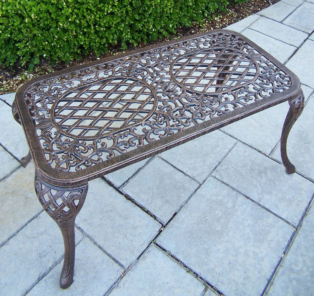 Rectangular bronze patio coffee table dimensions are: 35" L x 18" W x 20" H, 17 lbs Powder coated finish for more durability Rectangular in shape for more surface area Cast aluminum material is the best weather resistant and waterproof material Bronze color to compliment the rich style