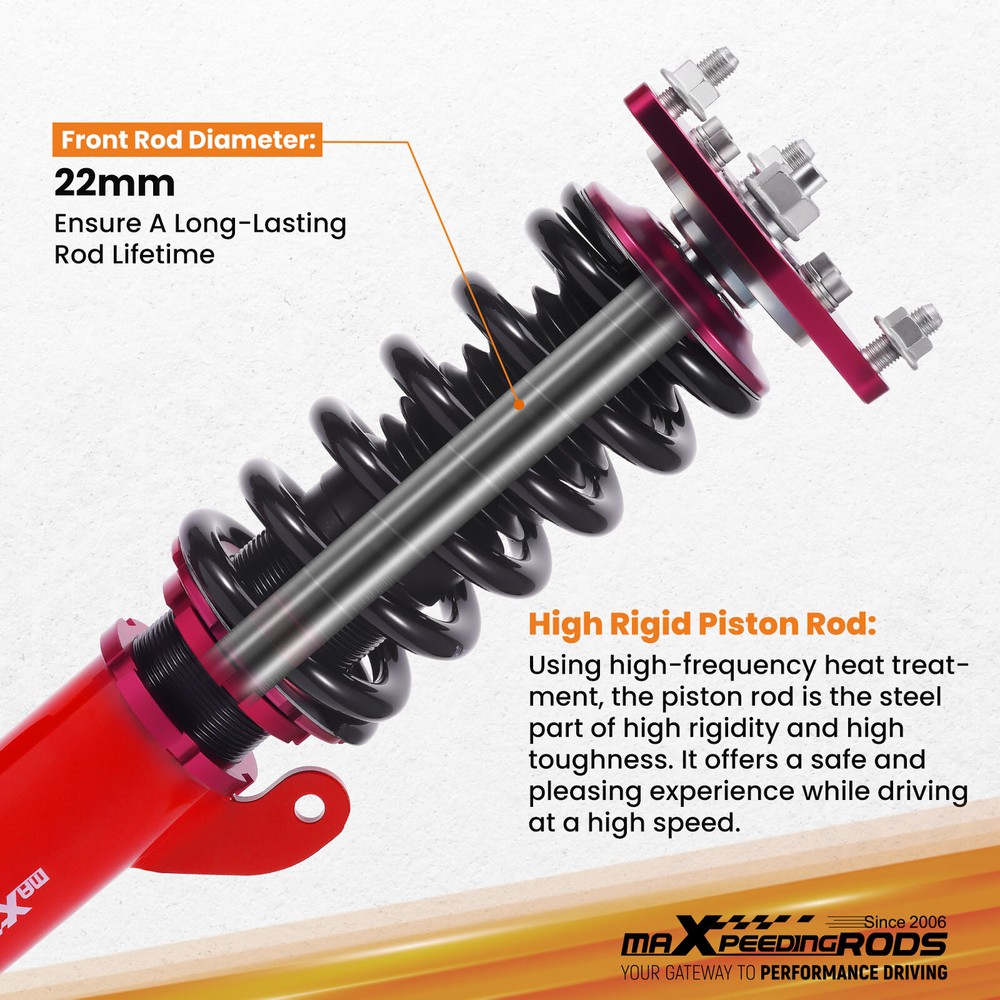 ZJPSS Adjustable Coilovers Lowering Suspension Kit for Mitsubishi Lancer 08-16 Top Camber Plate with Pillow Ball Mount Top Camber Plate with Pillow Ball Mount Provides More Precise Feel From Suspension And Steering. Anodized Shock Body With Anti-Corrosion Coating Manufactured From High Quality T-6061 Billet Aluminum With Anodized Finish For Superior Strength And Corrosion Protection. Drops From 1 to 3 Inch From Factory Ride Height Full Threaded Absorber Tube Casing For Independent Height Adjustment. Durable Cold Wound Steel & Heat Treated Coils High Rigidity 55CrSi Steel Cold-bent Coil Springs - Over 600k Continuously Stress Test With 0.04% Distortion Rate. Top Camber Plate with Pillow Ball Mount Anodized Shock Body With Anti-Corrosion Coating Drops From 1 to 3 Inch From Factory Ride Height Durable Cold Wound Steel & Heat Treated Coils Specifications Top mounts Adjustable camber plate Adjustable height Yes, Lowering 1-3 inch Front spring length 9 kg/mm (504 lbs/in) Rear spring length 6 kg/mm (336 lbs/in) Package Including 2 Front + 2 Rear Warranty 1 Year Features - Ride Height Adjustable - Drops From 1 to 3 Inch From Factory Ride Height - 55CrSi high strength durable cold wound steel & heat treated coils - Manufactured from high quality T-6061 billet aluminum with an anodized finish for superior strength and corrosion protection. - Improved Handling and stability without premature tire wear - Improved Vehicle Stability and traction in hard cornering situations - Full threaded absorber tube casing for independent height adjustment - Twin-Tube System for Comfortable Ride on Streets - Fully Rebuildable With All Parts Available Application For Mitsubishi Lancer(CX/CY) 2008-2016, except Lancer Evolution For Mitsubishi Outlander Sport(GA) 2011-2020 Specification Front top mount: Pillow ball with camber plate Damping adjustable: Not available Camber adjustable: Available Height adjustable: Yes, lowering 25-75mm depending on the vehicle models Front Spring Rate: 9kg/mm (504 lbs/in) Rear Spring Rate: 6 kg/mm (336 in/lbs) Spring length Front: 180 mm Spring length Rear: 179 mm Spring Preload advised: 7-10 mm Color: Red body with black spring Package included 2 x Front coil-overs 2 x Rear coil-overs 2 x C spanners ★ 30-day Money Back & 12-Month Replacement Guarantee. Please feel free to contact us if there is any question. Height Adjustable Lowering Kit; Independent Ride Height And Spring Tension Settings; High Rigidity 55CrSi Steel Cold-bent Springs; Anodized Shock Body With Anti-Corrosion Coating; Top Camber Plate with Pillow Ball Mount Provides More Precise Feel From Suspension And Steering; Full 1 Year Limited Warranty From Date Of Purchase. Other items you might also like Coilovers Suspension Lowering Kit For Mitsubishi Lancer 2008-2016 Adj. Height Coilovers Suspension Shocks Struts Kit for Mitsubishi Lancer (CX/CY) 2008-2016 Damper Adjustable Coilovers Lowering Kit FOR MITSUBISHI Lancer 2008-2016 Coilovers Suspension Adj Height Shocks Absorbers Kit For Mitsubishi Lancer 08-16 MaXpeedingrods 24 Click Coilovers Suspension Shocks for Mitsubishi Lancer 08-16 Adj. Damper Coilovers Kits for Mitsubishi Lancer Sedan 4-Door 08-16 Shock Strut 24 Way Damper Coilover Shocks & Struts Kit for Mitsubishi Lancer GTS Sedan 08-16 Shipping Terms of Sales Payment Contact us All orders will be shipped within 1 business day after payment has been processed. For orders placed before 5:30 AM PST on business days, most items will be shipped out on the same day. All orders will be shipped with a tracking number via USPS, UPS, or FedEx Express and delivered within 2-6 business days We do not ship to P.O. Boxes, APO/FPO addresses, or Military Mail Boxes. Please ensure your address is confirmed by PayPal before checkout, as we only ship to confirmed addresses. 30-day free return and money back guarantee If you are not satisfied with your purchase, you can return the item with its original packaging to us for a full refund with no restocking fee. Please note that the return cost should be paid by the seller. One Year Unlimited Mileage Quality Guarantee If you receive incorrect items, items that are damaged during transportation, or defective items, we will accept returns and cover the return freight. Please note that the return cost should be prepaid by the buyer. After inspecting the faulty item, we will issue a refund of the return cost to the buyer. We offer a full refund or replacement for all faulty items, which includes the cost of original shipping. Please contact us before initiating a return. Our representatives will provide you with detailed instructions on how to proceed. Our guarantee covers only the cost of the item. We are not responsible for installation or other fees, such as labor, towing, additional repairs, or related expenses. We only accept payment through Paypal for all orders, which should be made through eBay. Paypal offers various payment methods, including credit card, direct debit, VISA, and others. For more information, please visit Paypal. Our customer service center is open 24 hours a day, seven days a week. If you have any questions, please don't hesitate to contact us. We are dedicated to providing excellent customer service and will do everything we can to ensure your satisfaction.