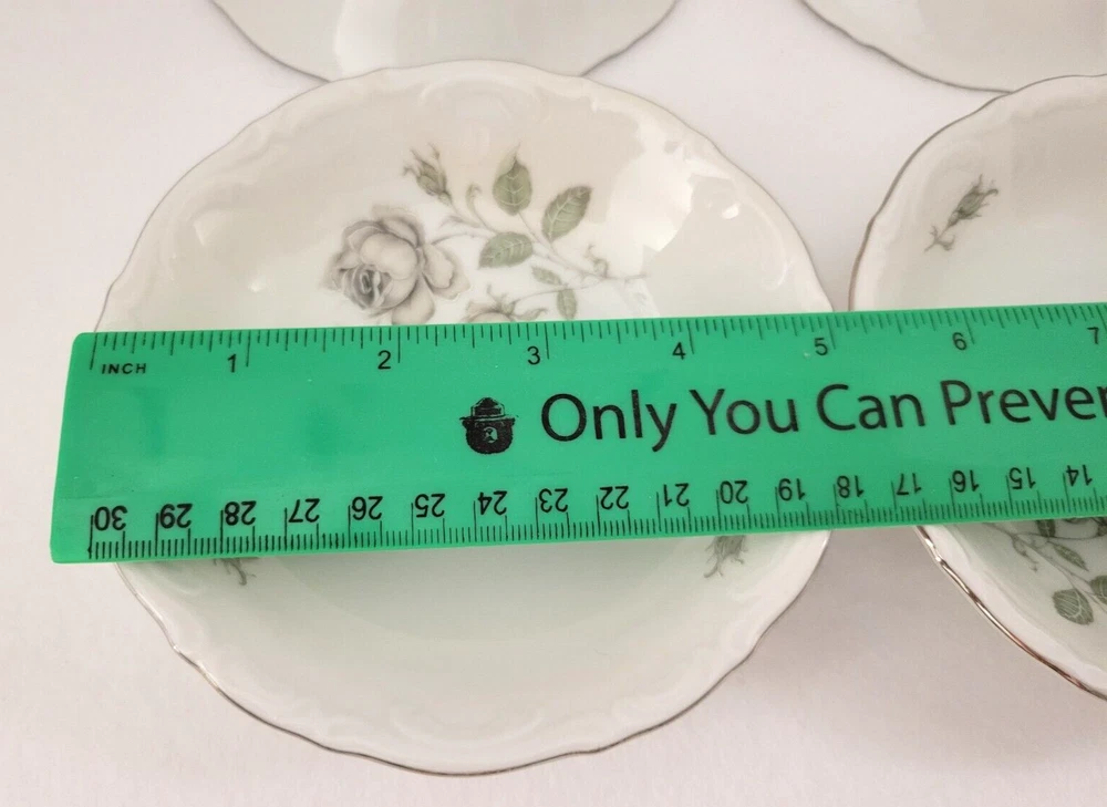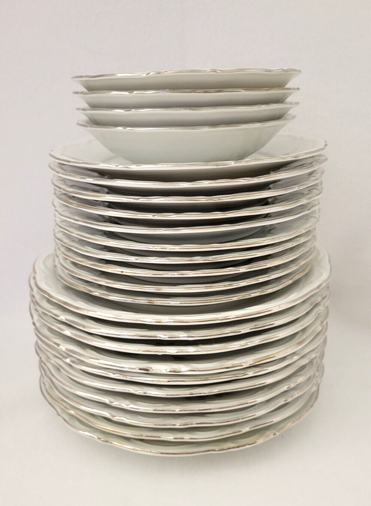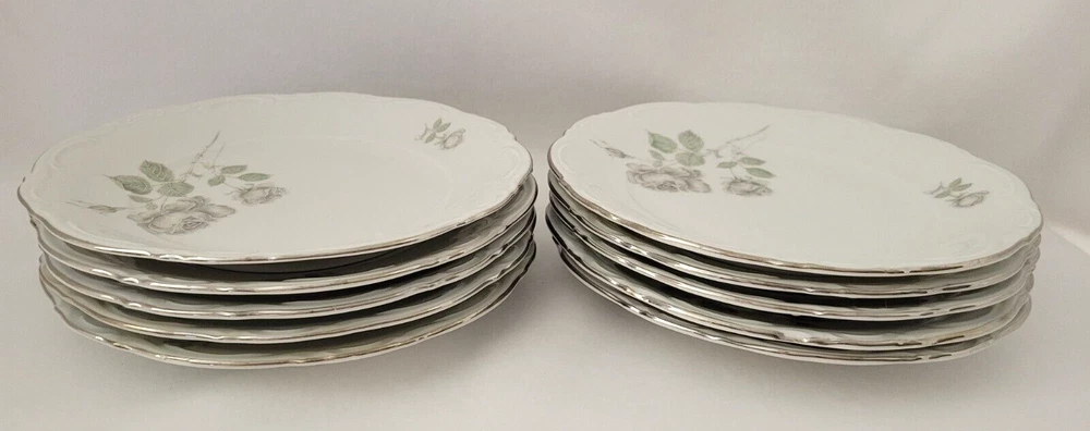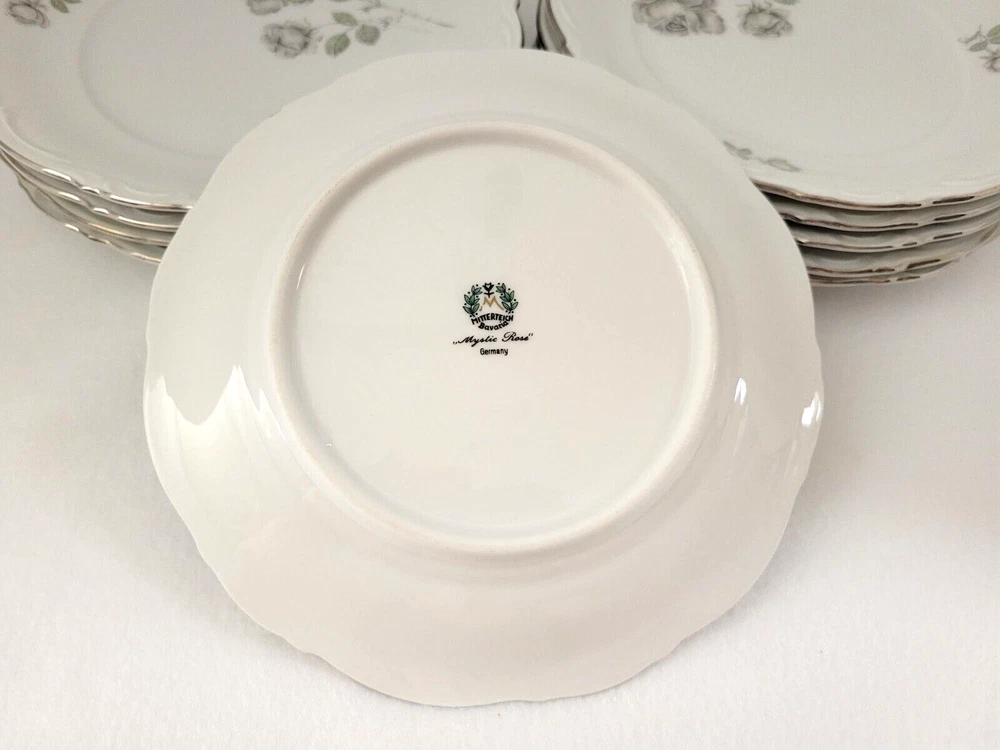 Mitterteich Bavarian Mystic Rose Silver Platinum Trim 4 - Approx. 5 inch Dessert Bowls 10 - Approx. 7 inch Dessert Plates 10 - Approx. 8 inch Salad Plates Each item is carefully packaged to prevent any damage and is shipped immediately with tracking.