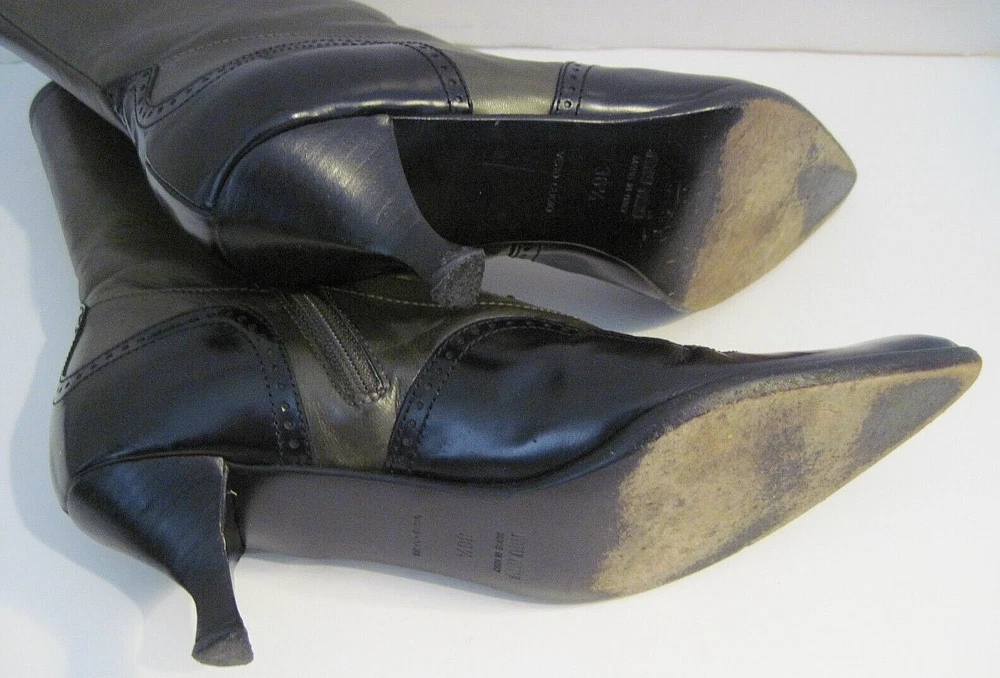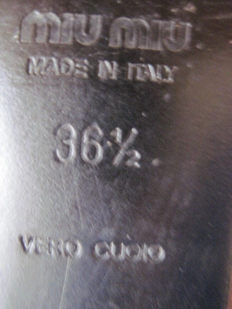Elevate your shoe game with these vintage MIU MIU leather boots size 36 1/2. The wingtip design and pointed toe give these booties a classic and sophisticated look. The kitten heel is perfect for any occasion, whether it be casual or formal. The boots feature a zipper closure, making them easy to put on and take off. The green color and solid pattern make these boots a great addition to any winter, summer, fall, or spring wardrobe. The leather upper, insole, and outsole ensure durability and comfort. These mid-calf boots are perfect for women who want to add a touch of the 90s to their outfit. Gently used.