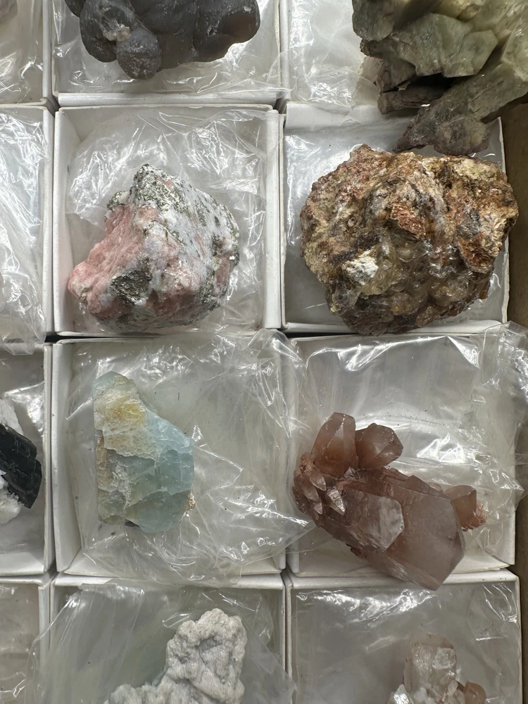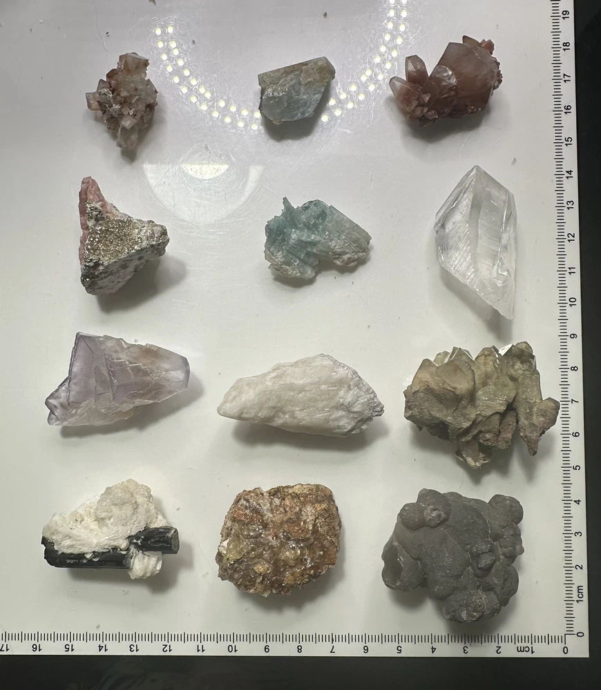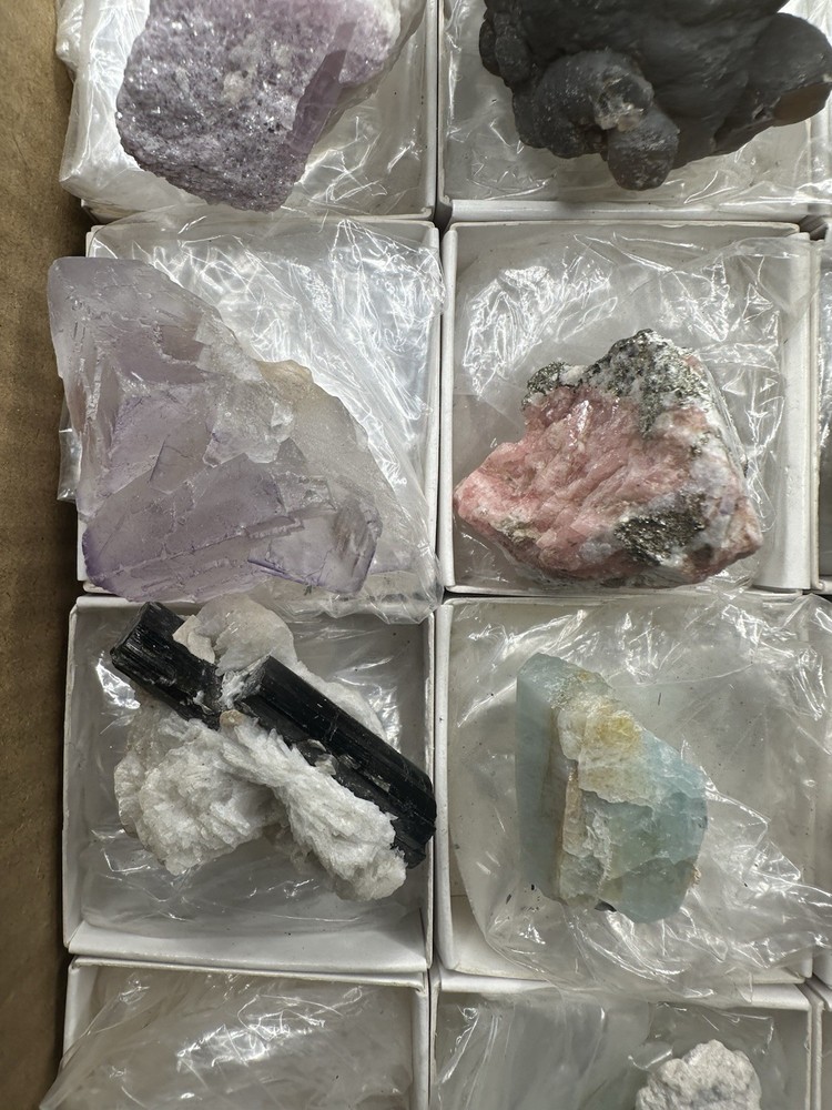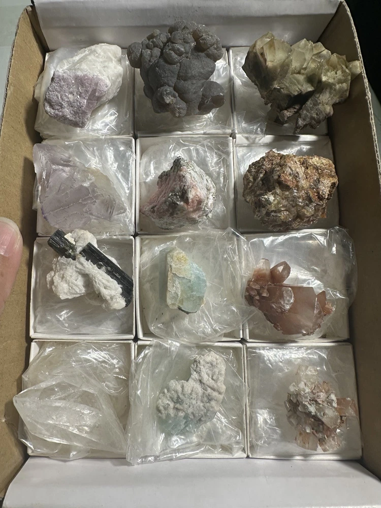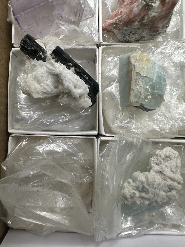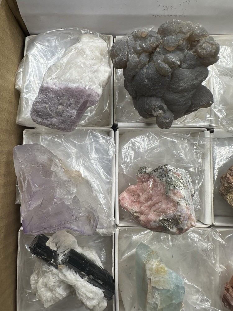 1 flat - 12 pieces of mix crystals 1. Pink tourmaline with pink druzy 2. Botryoidal 3. Chlorite quartz 4. Phantom fluorite 5. Rhodochrosite 6. Kryptonite crystals 7. Black Tourmaline in matrix 8. Aquamarine 9. Red calcite 10. Quartzi 11. Blue tourmaline bunches 12z red aragonite