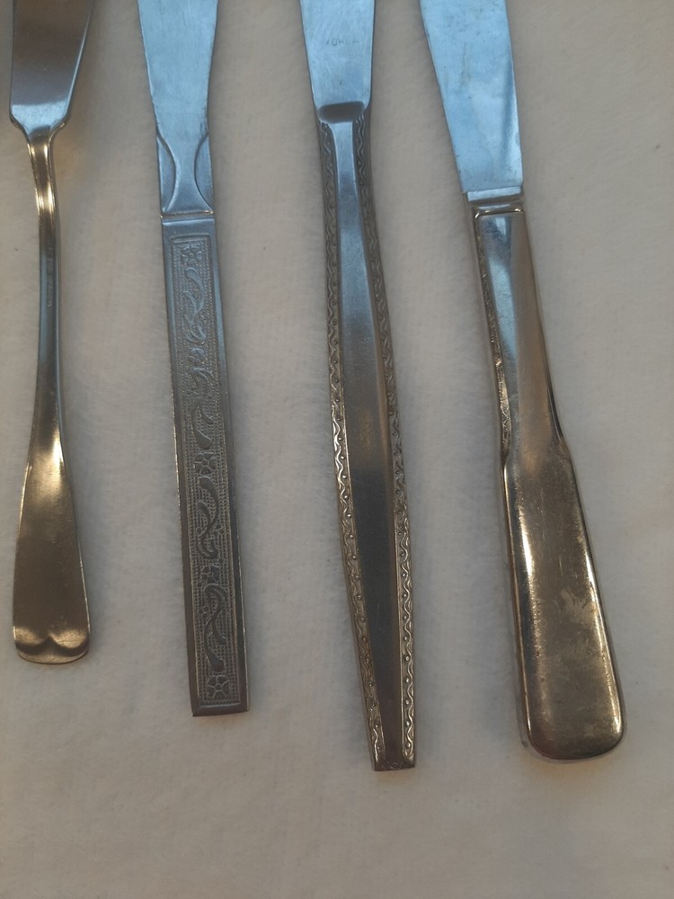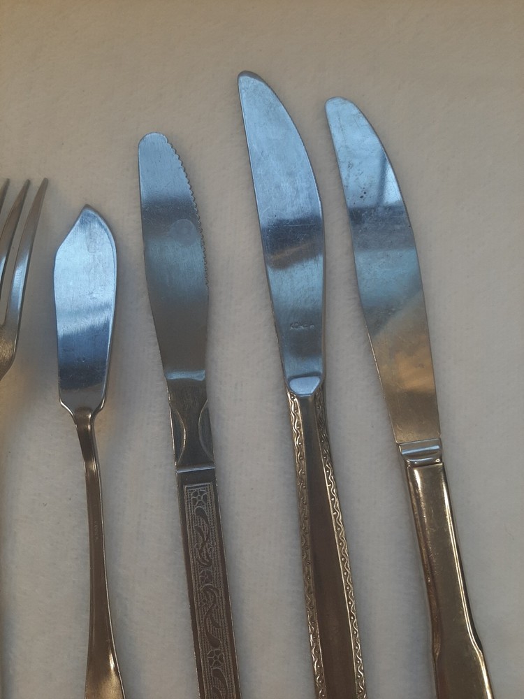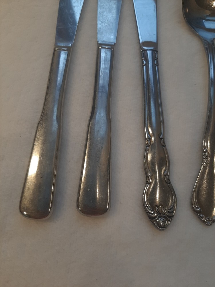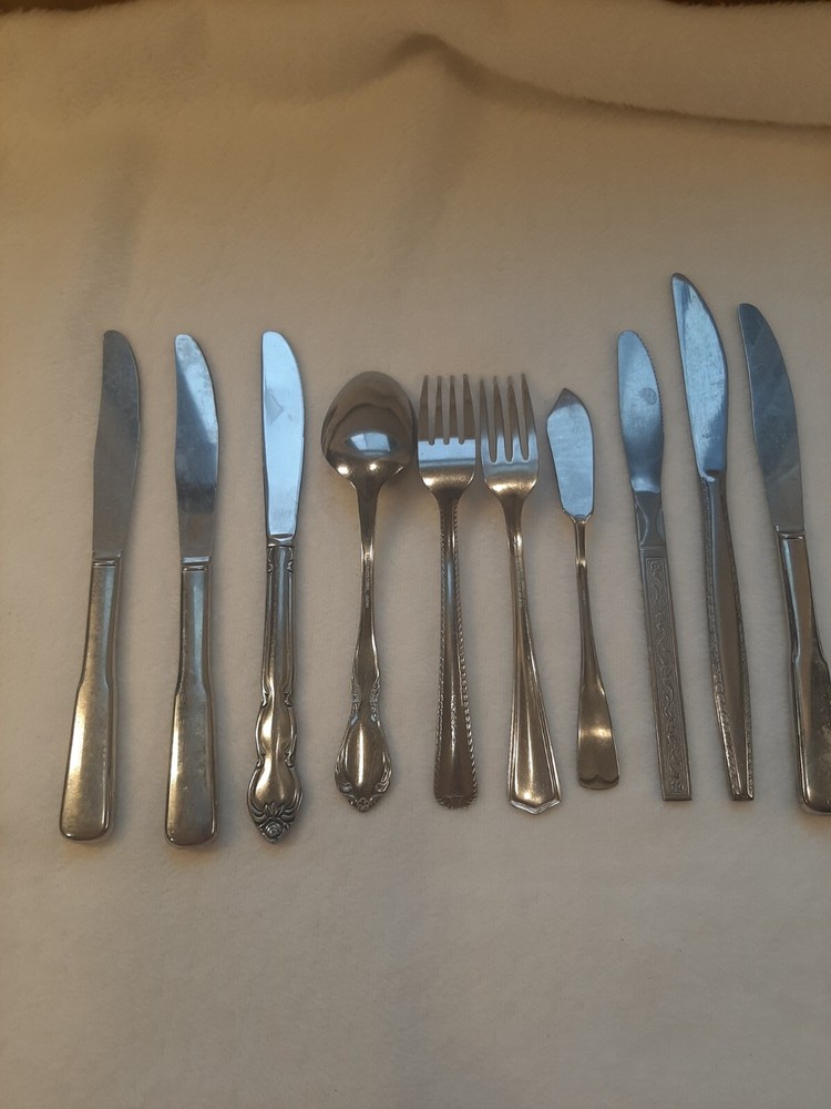 Mixed Lot of 10 Stainless Flatware Forks/Knifes/Spoons Patterns Replacements In good pre-owned condition may show signs of wear from use/handling/storage/display. Please view all pics for condition/details/flaws/issues. SOLD AS IS Lot of flatware unknown makers 6 dinner knifes 1 butter knife 1 dinner spoon 2 forks There is/maybe marks/spots/dirt/debris/rust/tarnish please see photos 1-20, there is/maybe paint loss/sticker loss please see photos 1-20, there is lite discoloration please see photos 1-20, there are surface scratches to item please see photos 1-20, please see all photos for condition/issues/details.