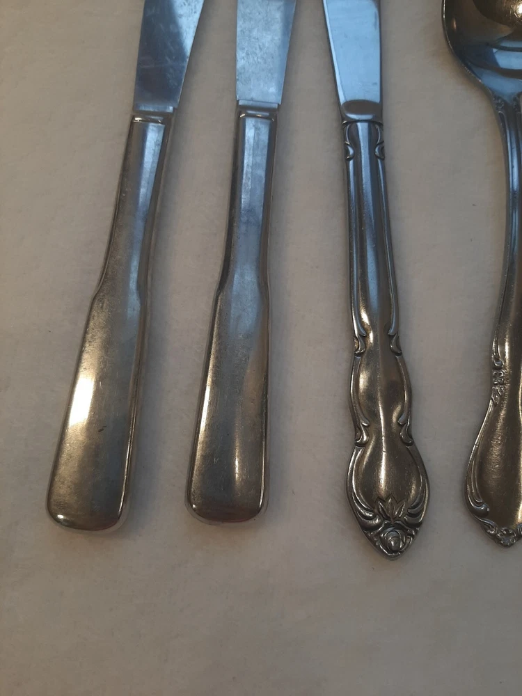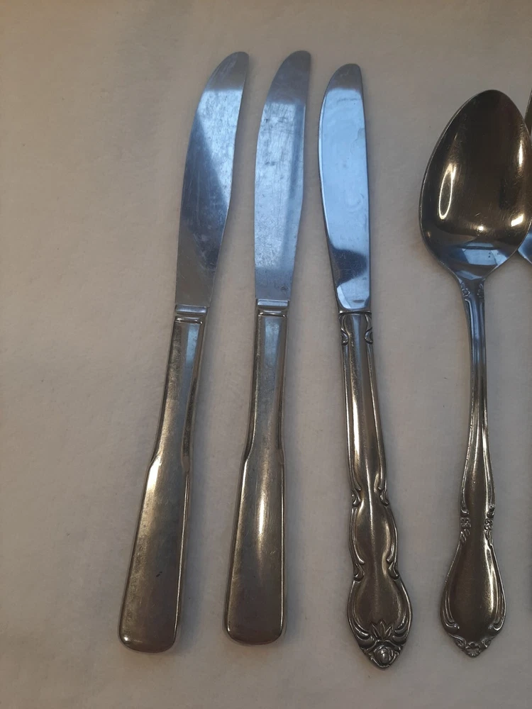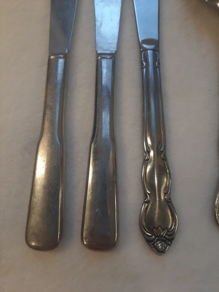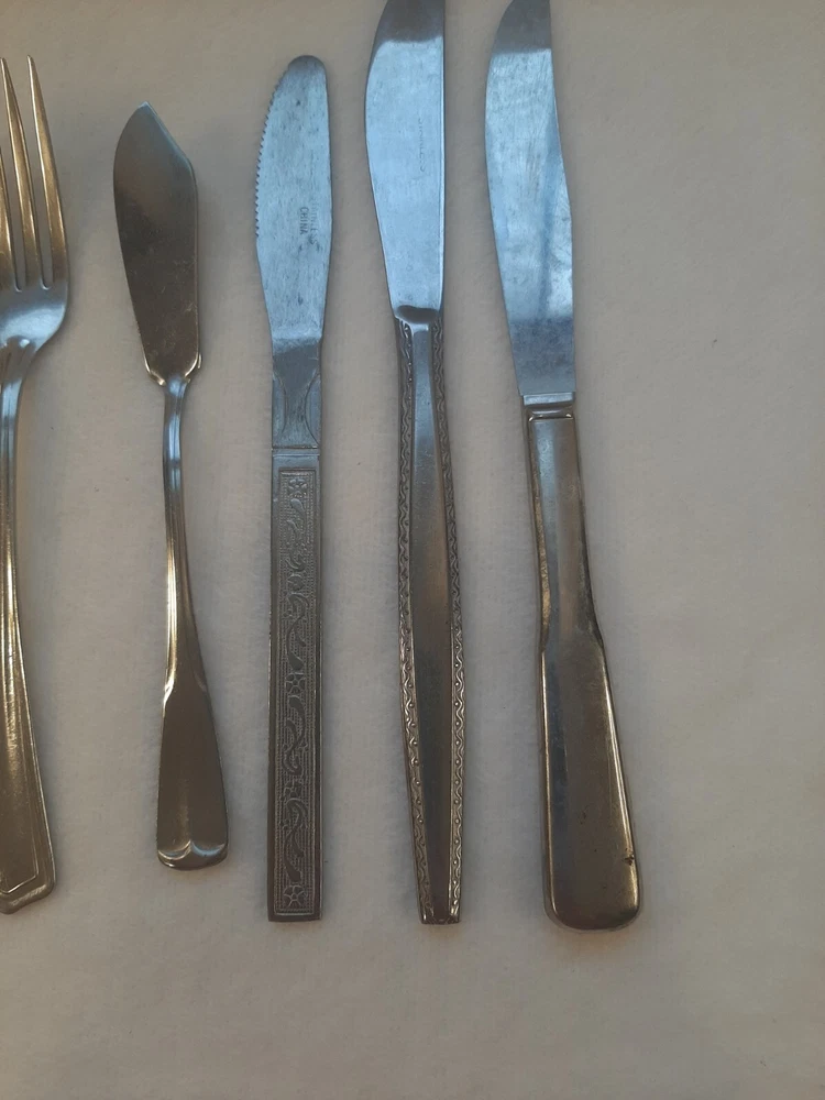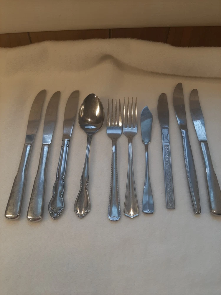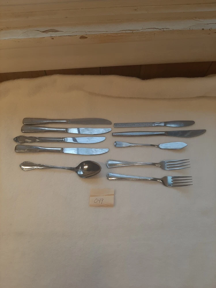Mixed Lot of 10 Stainless Flatware Forks/Knifes/Spoons Patterns Replacements In good pre-owned condition may show signs of wear from use/handling/storage/display. Please view all pics for condition/details/flaws/issues. SOLD AS IS Lot of flatware unknown makers 6 dinner knifes 1 butter knife 1 dinner spoon 2 forks There is/maybe marks/spots/dirt/debris/rust/tarnish please see photos 1-20, there is/maybe paint loss/sticker loss please see photos 1-20, there is lite discoloration please see photos 1-20, there are surface scratches to item please see photos 1-20, please see all photos for condition/issues/details.