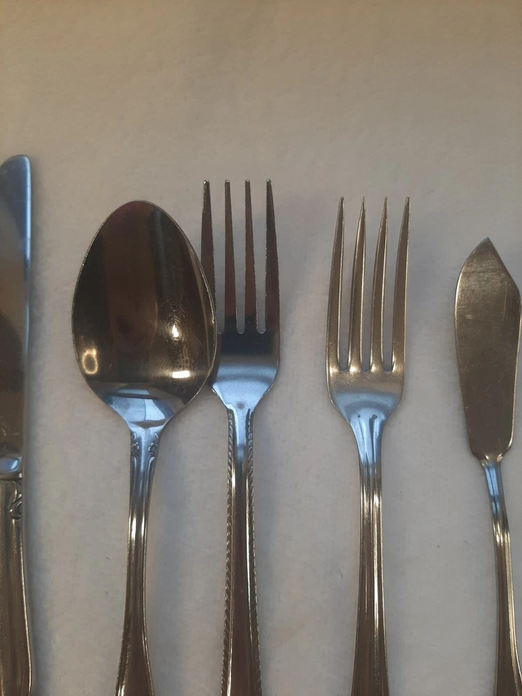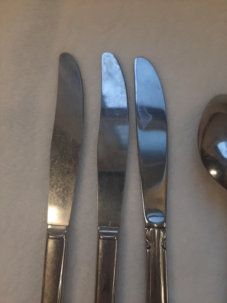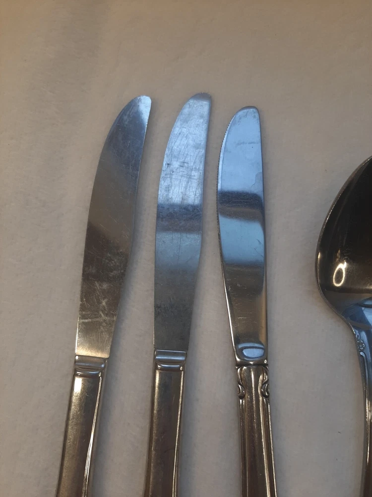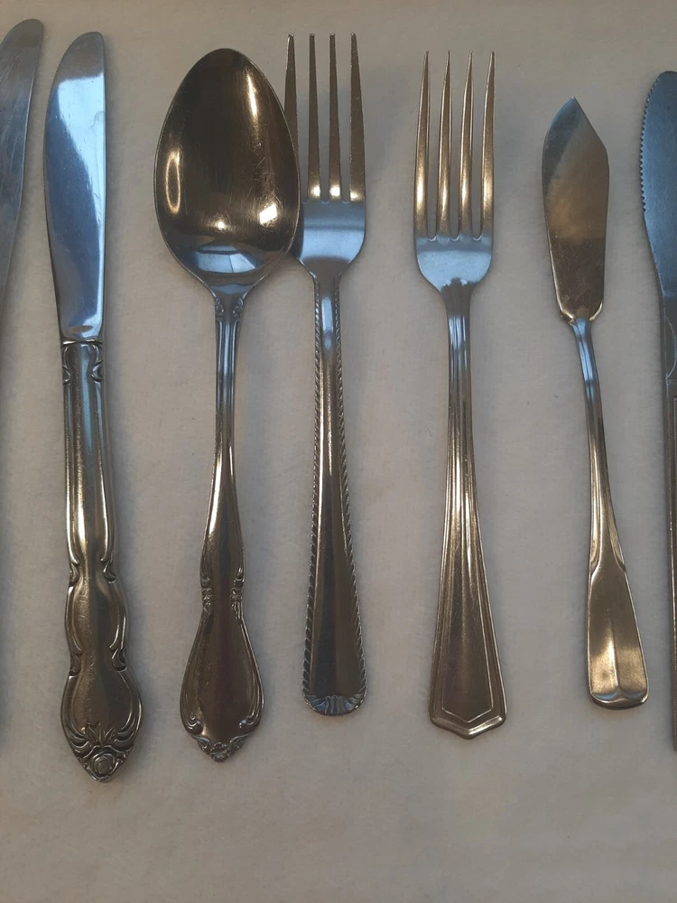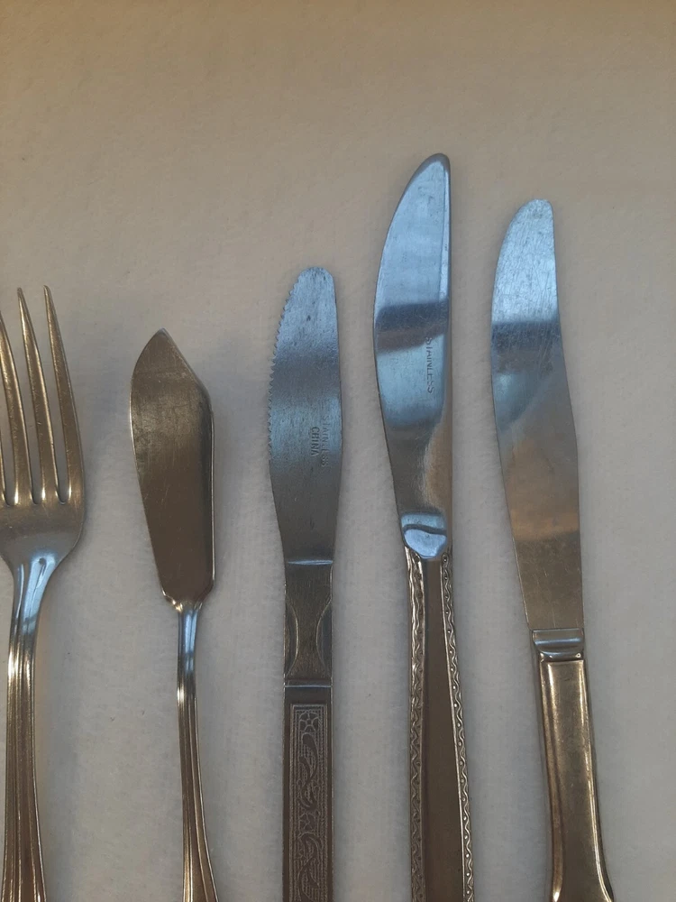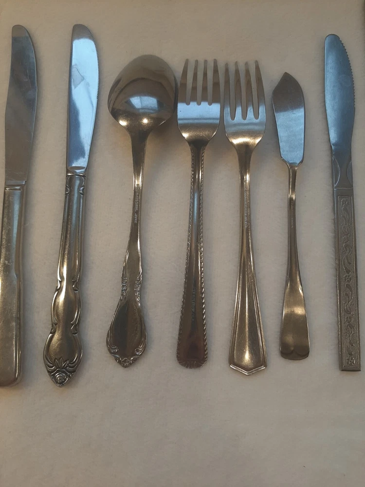 Mixed Lot of 10 Stainless Flatware Forks/Knifes/Spoons Patterns Replacements In good pre-owned condition may show signs of wear from use/handling/storage/display. Please view all pics for condition/details/flaws/issues. SOLD AS IS Lot of flatware unknown makers 6 dinner knifes 1 butter knife 1 dinner spoon 2 forks There is/maybe marks/spots/dirt/debris/rust/tarnish please see photos 1-20, there is/maybe paint loss/sticker loss please see photos 1-20, there is lite discoloration please see photos 1-20, there are surface scratches to item please see photos 1-20, please see all photos for condition/issues/details.
