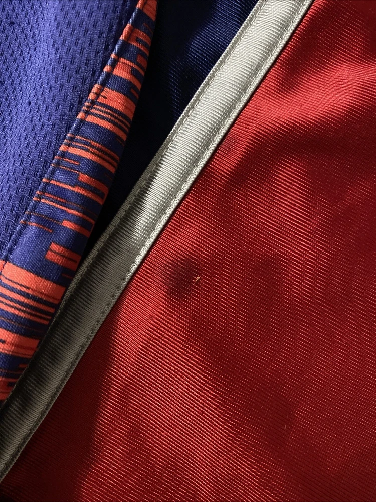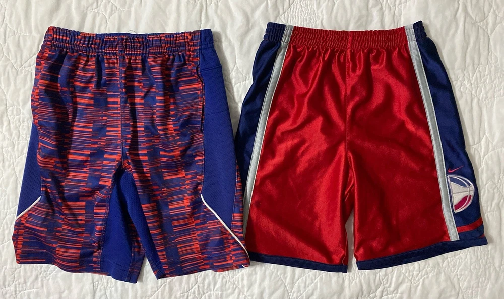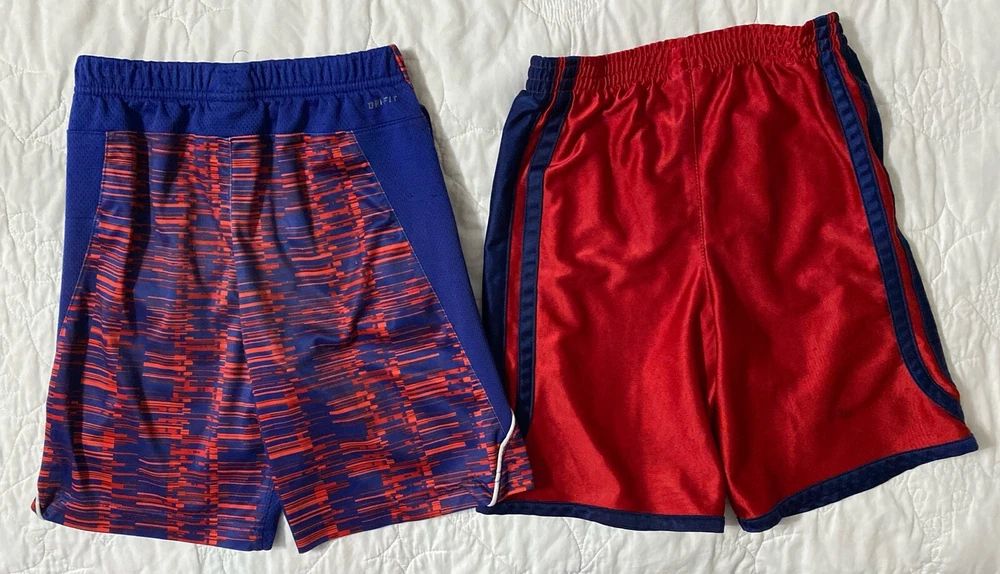 Lot of 2 - Athletic Shorts Size: Youth Large (7) Red: Nike, 100% Polyester, Elastic Waist, Stitched Swoosh and Basketball (Inseam approx. 6.5") Blue/Red: Nike, Dri-Fit, 100% Polyester, Elastic Waist, Pockets (Inseam approx. 7.5")