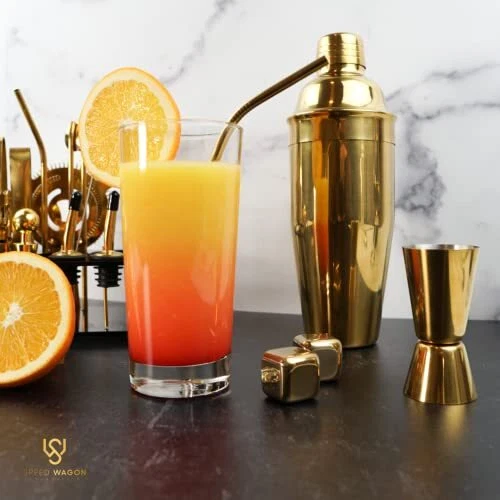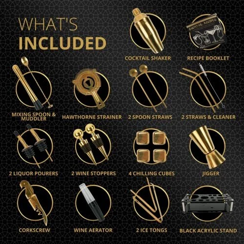 Return Policy Fast Delivery Trusted seller Mixology Bartender Kit – 24 Piece Gold Cocktail Shaker Set w/Stand – Essential Home Bar Accessories Martini Shaker, Jigger, Muddler, Chilling Cubes & More Product Description 24 PIECE BARTENDER SET: Our mixology bartender set includes a 24oz cocktail shaker, mixing spoon, muddler, strainer, straw cleaner, 2 spoon straws, 2 straws, 2 liquor pourers, 2 wine stoppers, 4 chilling cubes, jigger, corkscrew, wine aerator, 2 ice tongs, recipe booklet and an acrylic stand. All the necessary tools to be a top-notch bartender. WINE & MIXED DRINKS TOOLS: Not only does our drink mixer set have all the essentials to make the perfect cocktail, but it also includes everything you need to open, pour and store a delicious bottle of wine. This well-rounded set puts all your tools in one spot so you can be ready to whip up your favorite drink in no time! PREMIUM QUALITY TOOLS: Each tool in our cocktail shaker set is made of high-quality stainless steel with a smooth, shiny finish. The black acrylic stand was specially designed to hold all tools in a clean and organized fashion. Available in silver and gold. RECIPE BOOKLET: In addition to these essential tools, our kit also includes a recipe book with instructions for making a variety of cocktails. Whether you're a seasoned bartender or just starting out, this kit has everything you need to impress your friends and family with your mixology skills. THE PERFECT GIFT: This cocktail mixing set makes a great gift for a friend or family member who enjoys making cocktails or is interested in learning how to make them. It comes in sleek black packaging and can easily be set up in any kitchen or wet bar area. Shipping Returns Payment Shipping Shipping is FREE to all addresses other than APO/PO boxes in the lower 48 states. All our stock ships from US-based warehouses. Shipped via USPS or UPS (depending on location and package weight) Unless stated otherwise, all orders will ship within 24-72 hours of your payment being processed. Check our feedback to see the great reviews of FAST shipping we offer. Returns Seller does not accept returns Payment We currently accept payment via eBay managed payments only. Once payment is cleared, we will dispatch your shipment within 1-3 business days. Please refer to the "Shipping" tab for more information regarding shipping speed to your destination.