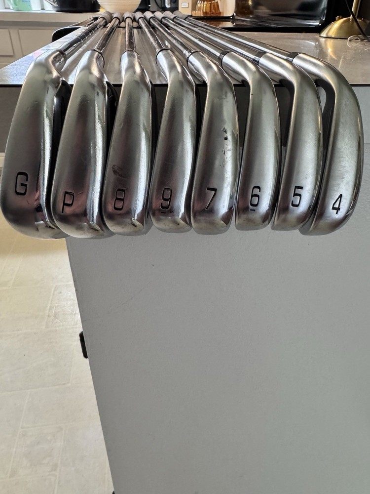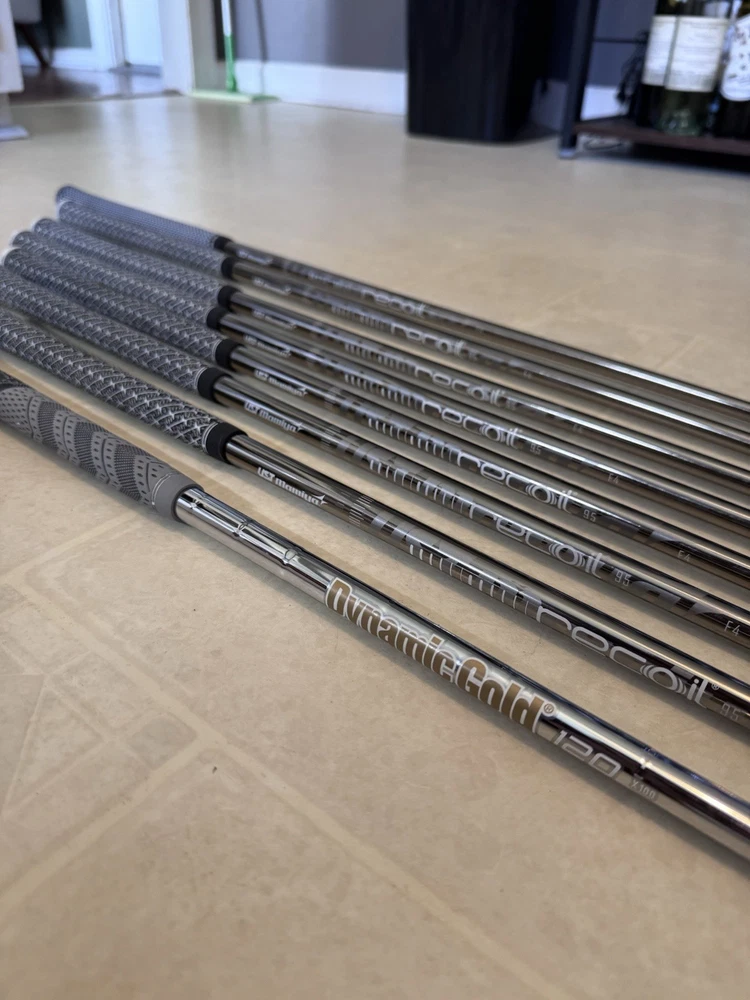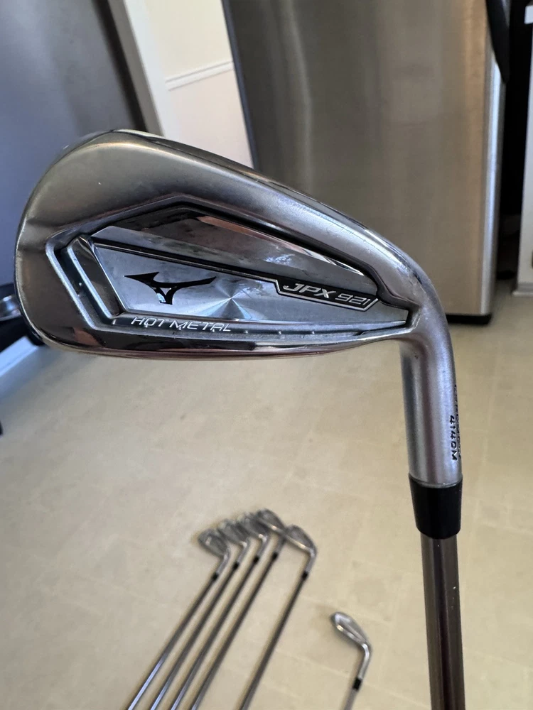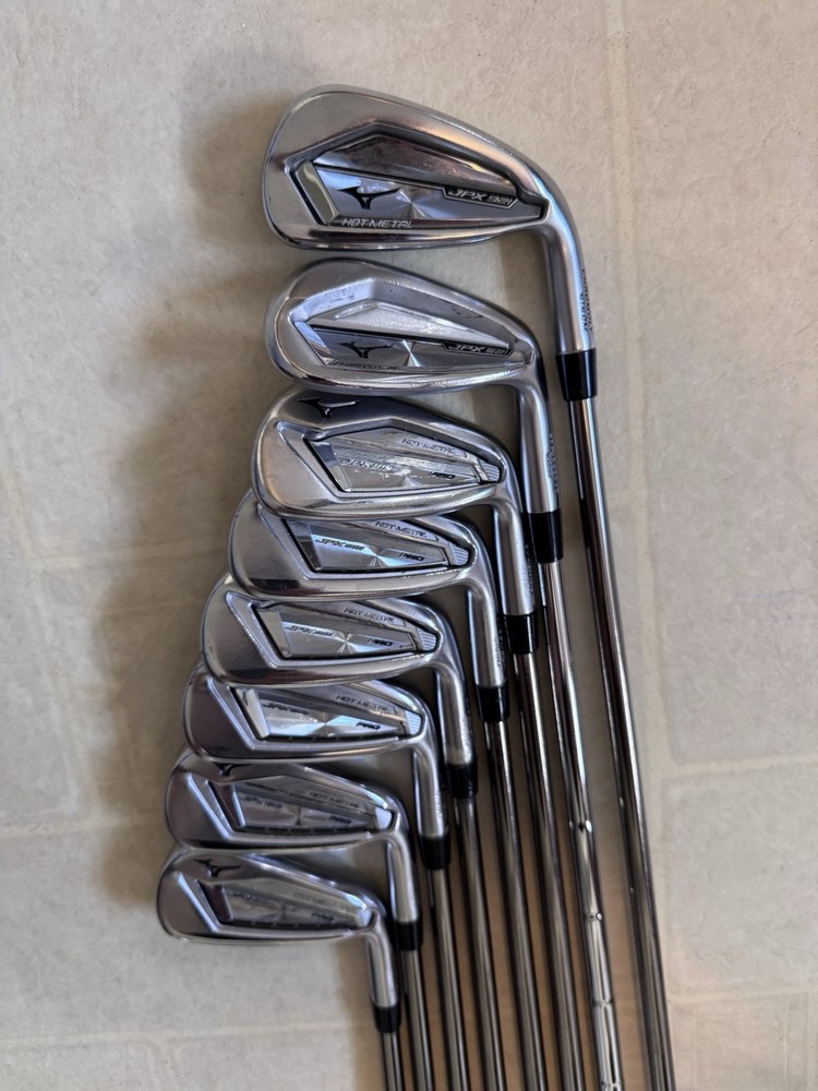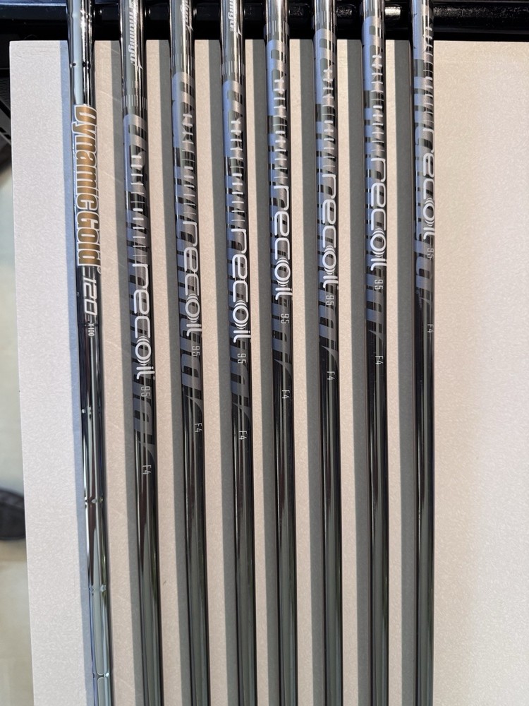 Mizuno JPX Hot Metal Pro Iron set 4-GW with Mamiya Recoil F4 Stiff Shafts. The 4 iron and gap wedge are JPX 921 as they were added separately. Gap wedge is Dynamic Gold 120 X-stiff with golf pride standard grip. All other clubs have golf pride Z cord grips.