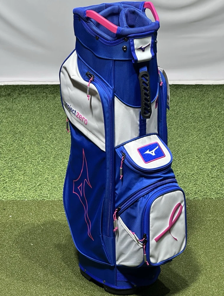 We are a reputable golf company that has been in business in St. Louis, Missouri since 1975. We have been doing this for 40 years because we do things right the first time. WE HAVE THE FASTEST SHIPPING ON EBAY! Don't believe us? Check out our Feedback. If you have questions, please feel free to ask. As always, thank you for looking. Mizuno Project Zero LW-C Cart Golf Bag COLOR: Blue/Pink STYLE: Cart Bag DIVIDERS: 7-Way Divider CONDITION: New w/ Tags - See Pics (10/10) RAIN HOOD: Included We have partnered with BCRF for five years and counting to aid them in their efforts to turn 1 in 8 women diagnosed with breast cancer into 0 in 8. The LW-C is here to break the reputation of cart bags as being bulky, heavy, and cluttered. Large pockets for apparel or bigger items, a cooler pocket for hydration, and a 7-way top cuff are just a few features that this lightweight cart bag still has, but in a smaller, more efficient design. 7-Way Top Cuff with 3 Full Length Dividers Dual Shoulder Straps with Quick Release Clips: Can be easily removed and stored in the full length apparel pocket so straps don't get in the way when riding Single Shoulder Strap with Adjustment Point Full Length Apparel Pockets Large Cooler Pocket with Drain Hole Fleece Lined Valuables Pocket Padded Grab Handle on Body of Bag Removable Ball Pocket Panel: Easily zips off and back on for customization or embroidery Quick Access Mesh Pockets Push Cart Notch Molded into Bottom Cuff: Enables an extra level of stability when used on a push cart Integrated Pen/Market Slot Carabiner Accessory Clip: A metal loop with a spring loaded closure to quickly connect accessories Loop Velcro Patch: Provides easy accessibility for gloves, or offers a perfect place to display morale patches for an extra level of personalization Elastic Strip for Tees Matching Rainhood: Matching rainhood ensures clubs stay dry in wet weather Umbrella Holder
