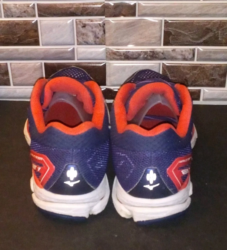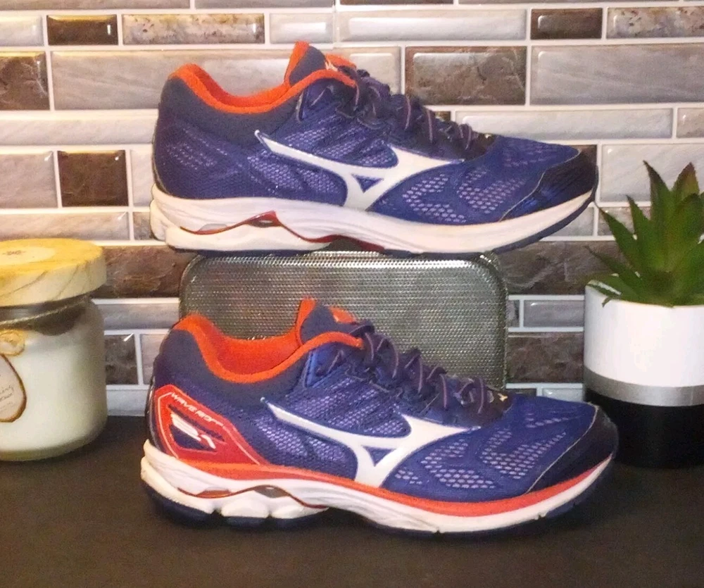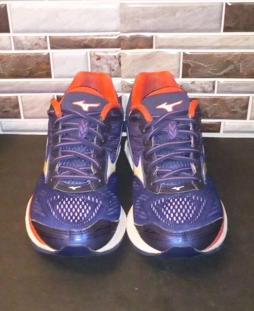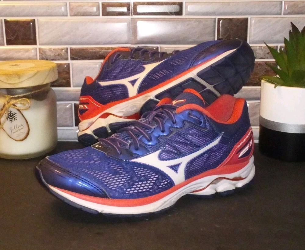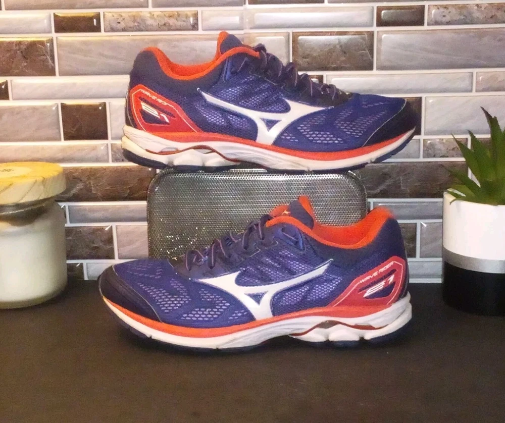 The Mizuno Wave Rider 21 Running Shoes are women's athletic sneakers in a navy blue color. These lace-up shoes feature a low-top design with a mesh upper for breathability and a rubber outsole for traction. They are lightweight, cushioned, and designed for performance, making them ideal for activities like running, walking, and training. The shoes are part of the Mizuno Wave Rider product line and have a modern, colorful design with accents of lace and logo detailing. Perfect for active women looking for comfortable and stylish footwear.