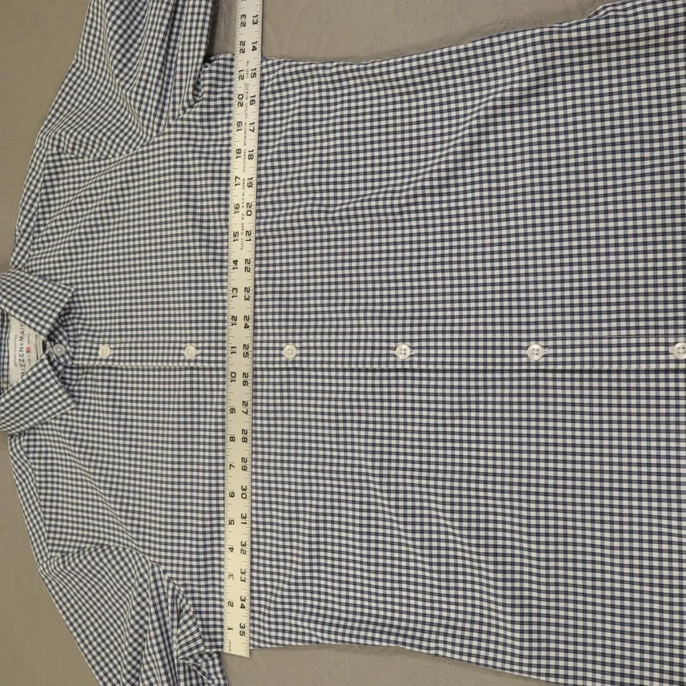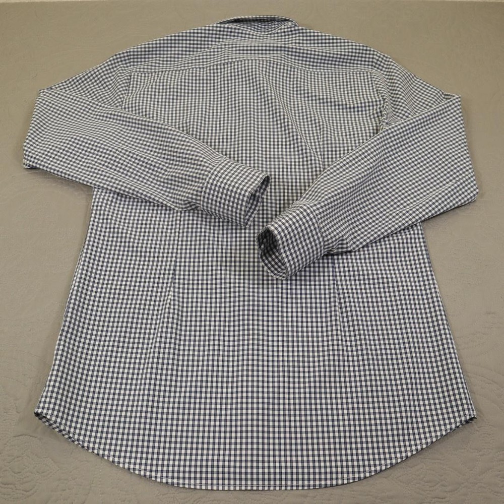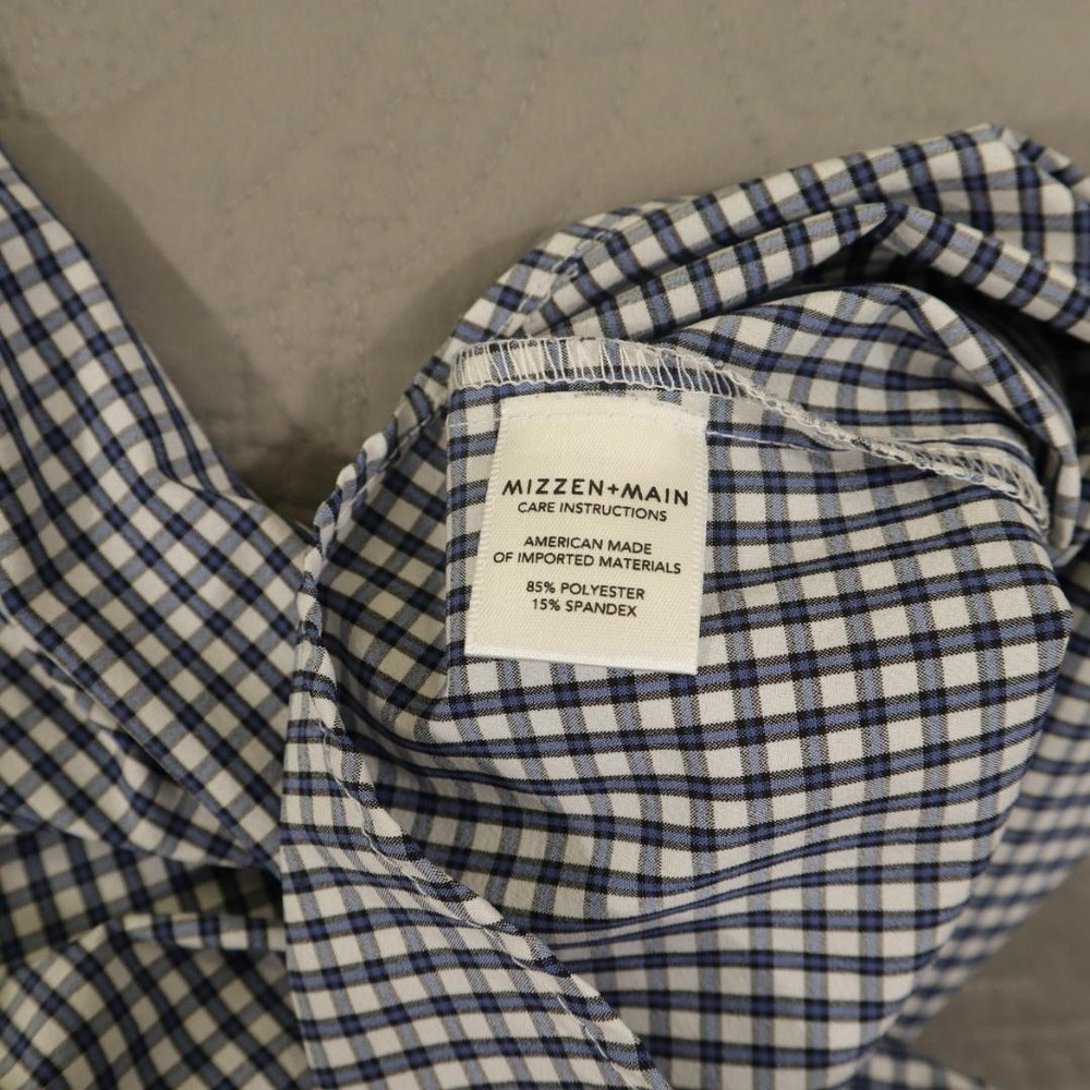 Brand: Mizzen+Main Style: Mens long sleeve dress shirt from the Leeward Collection with spread collar, button front, barrel cuffs, and a curved shirttail hem in a trim, slim-style fit. Color/Pattern: Blue and white gingham check pattern with white buttons for a crisp, modern look. Material: 85% polyester, 15% spandex