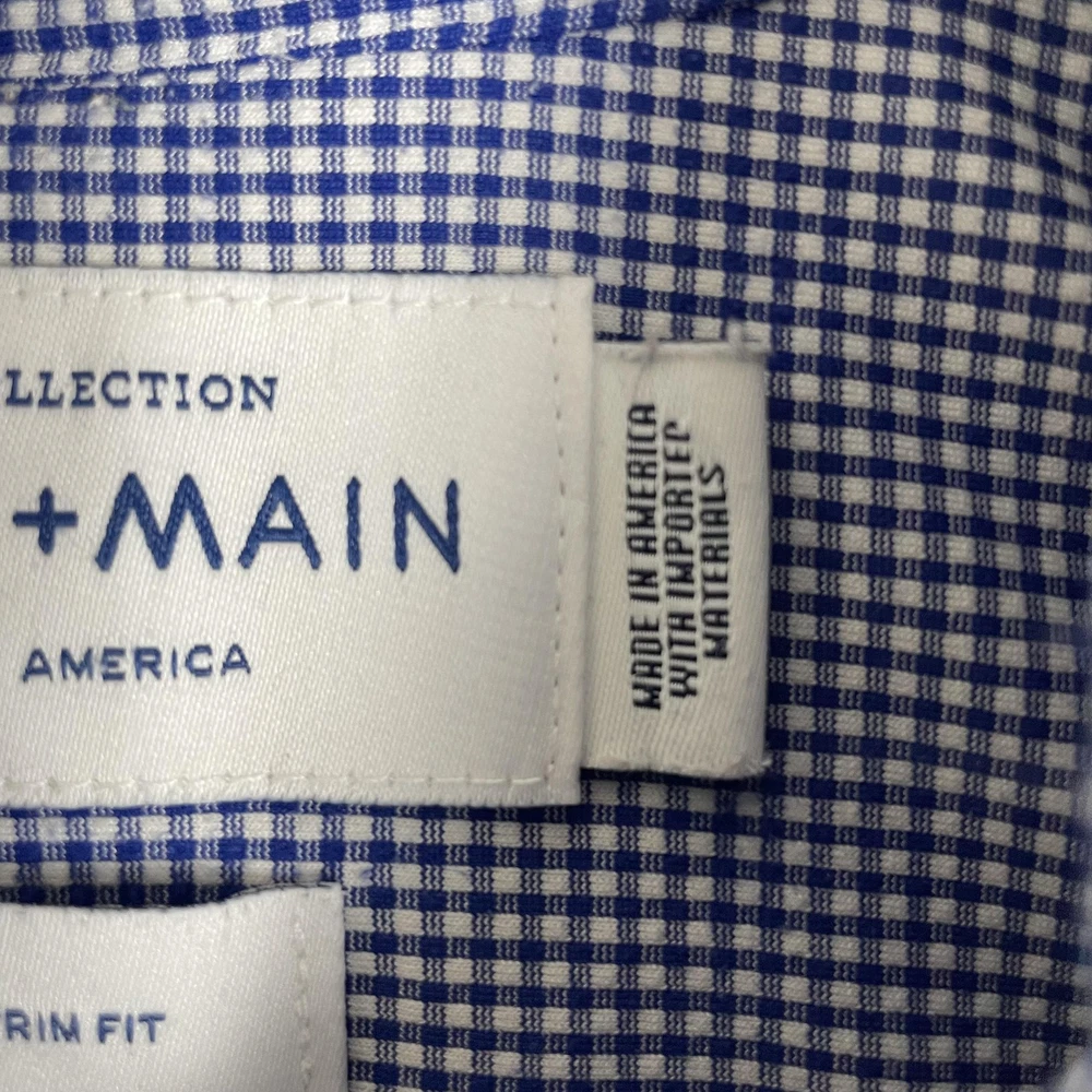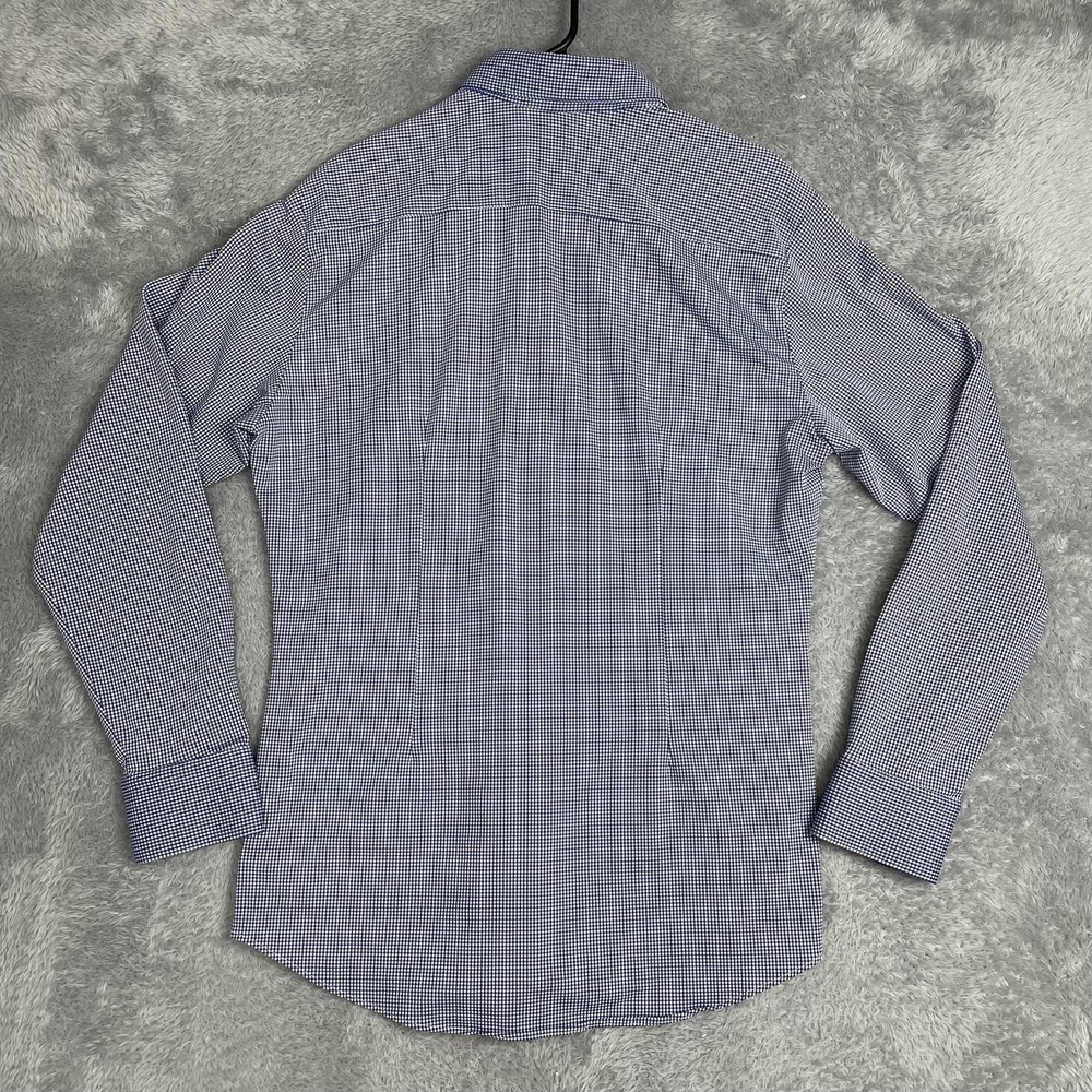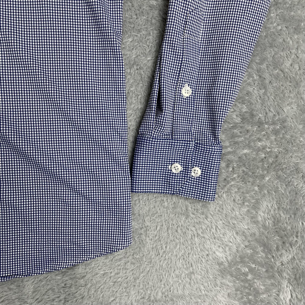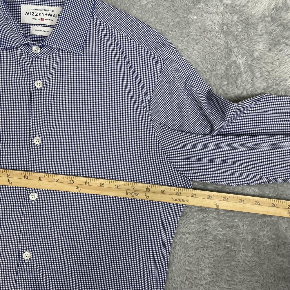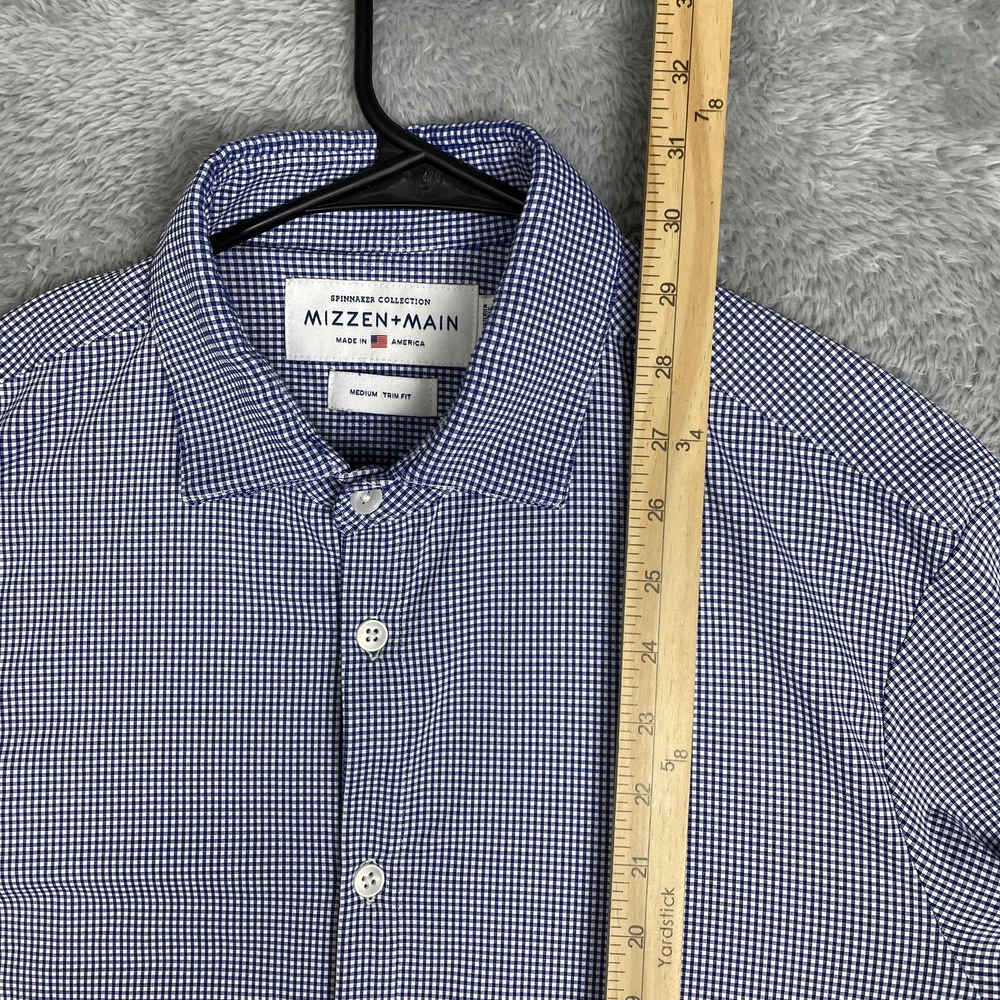Mizzen+Main men's Spinnaker Collection trim fit dress shirt in blue gingham performance stretch fabric. Brand: Mizzen+Main. Style: Spinnaker Collection trim fit button-front dress shirt with spread collar and long sleeves. Gender: Men. Color and pattern: Blue and white micro gingham check. Tag size: Medium Trim Fit. *CHECK THE MEASUREMENTS IN THE PHOTOS Material: 46% polyester, 46% nylon, 8% Lycra spandex; made in America with imported materials per interior content label. Details: Lightweight performance woven fabric with added stretch, full button front placket, spread collar, long sleeves with adjustable two-button barrel cuffs and gauntlet buttons, and curved shirt-tail hem that can be worn tucked or untucked. Branding: Interior labels featuring Spinnaker Collection and Mizzen+Main Made in America wording with separate Medium Trim Fit size tag. Care instructions: Wash cold, hang dry, no ironing necessary, and use iron on low heat if desired per interior care label. Occasion and use: Versatile performance dress shirt suitable for business, office, travel, or smart casual wear with dress pants or jeans. Special notes: Non-iron stretch fabric blend is designed for comfort, easy care, and a polished appearance.