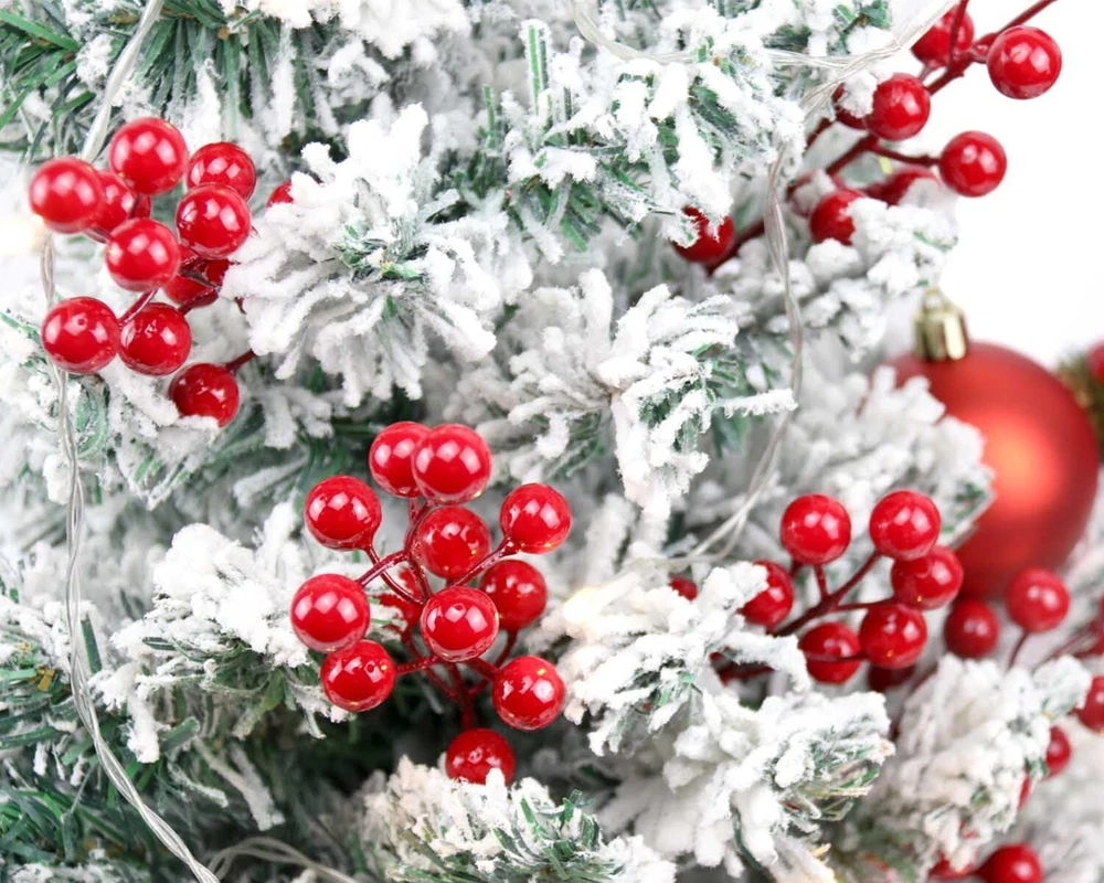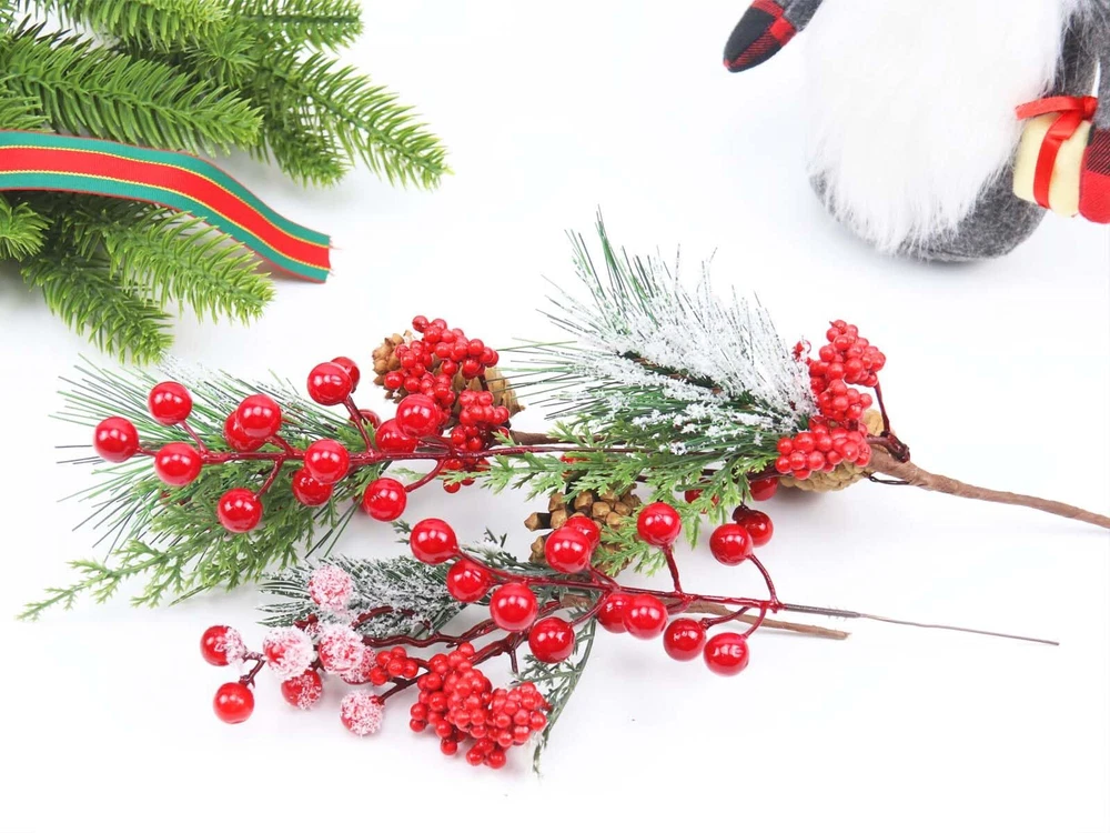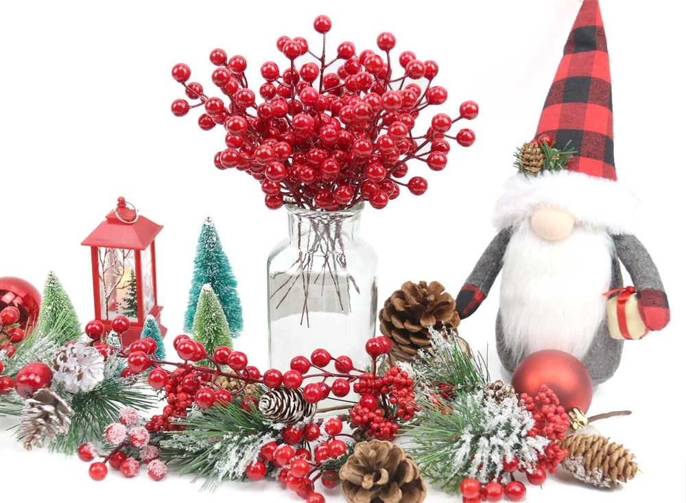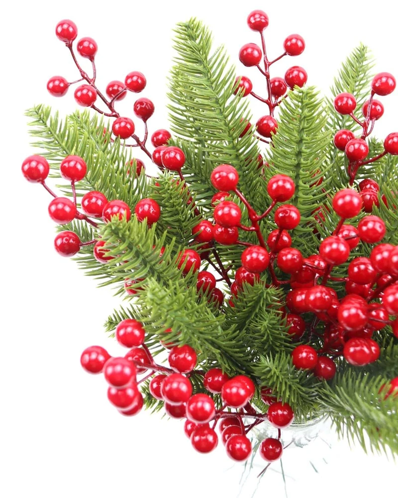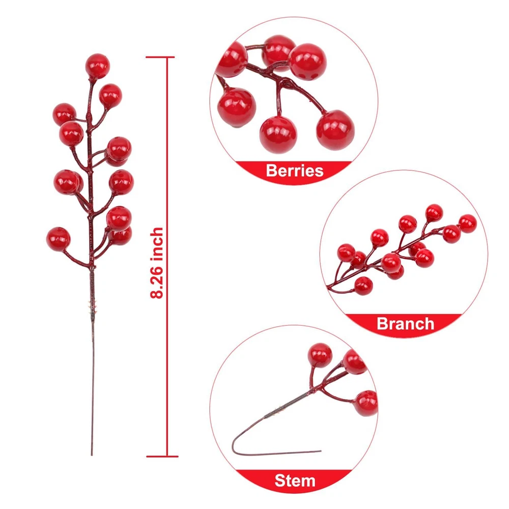 CHRISTMAS RED BERRIES - Red holly Christmas berries will perfectly add festive color to your Christmas tree, holiday floral arrangements and wreaths, as well as winter wedding flower bouquets PACKAGE & SIZE:Each package includes 60 pcs artificial red berry picks, and each berry sprig has 12 red berries, looks lifelike, bright and attractive. The length of each berry stem is about 8.2 inches, great for many Christmas ornaments and DIY crafts REALISTIC DESIGN - The berries are bright red in color, will add rich colors and beautiful details to any floral arrangement. Embrace the holiday spirit and add a touch of festive charm throughout your Christmas tree this winter with these wonderful artificial red berries HIGH QUALITY - Artificial red berries are made from high quality foam ball, covered with a glossy lacquer coating. Christmas berry stems are made from iron wire, strong but bendable for all your crafting needs WIDE USE - Beautiful red berries stems are perfect for Christmas tree ornaments, Christmas table decorations, wreath or garland decorating supplies, Christmas package decorations, also good for DIY Christmas crafts