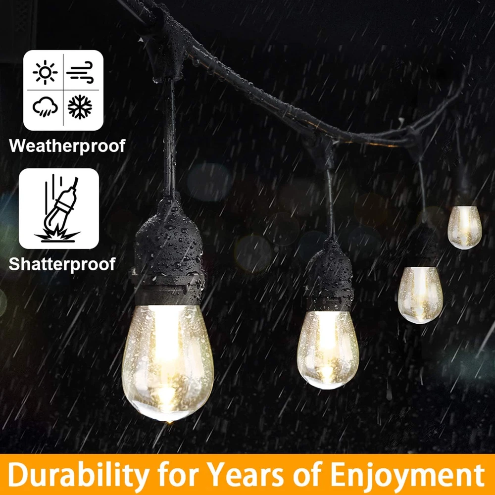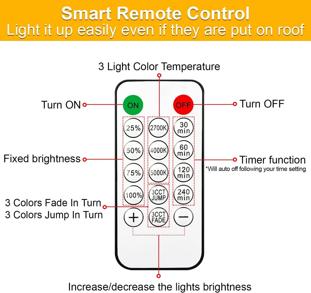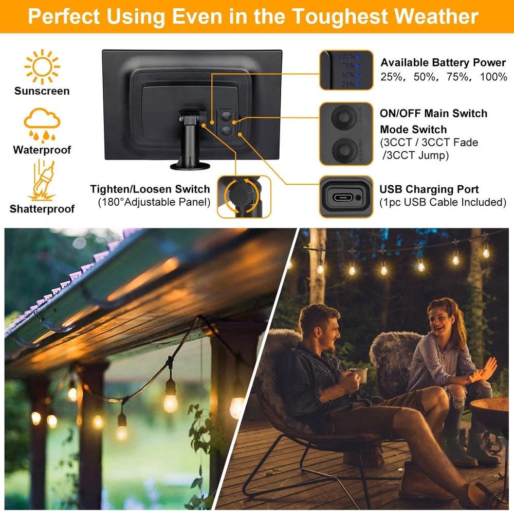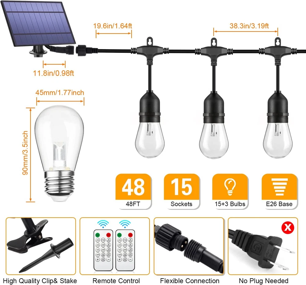 Amazing 3-color in 1 Solar String Light with Jump and Fade Modes: This light is an awesome combination that you've never met before!! Built by the latest LED technology, you can get 2700K 4000K 5000K color lights all in one string, moreover, it is dimmable, smoothly dimmed from 25%-100% by included remote controller. It fits well for many indoors and outdoors activities such family dinner, summer night barbeque, camping, weddings, celebrations. Just try and you will not regret Zero Energy Bills & Auto On/Off: Running by solar energy, so it will completely save your electricity and absolutely easy to install without any outdoor outlets needed. Please note: the light only automatically light up in the evening and off in daytime or you can set set time for working by the remote, no need to turn on & off the lights manually. More convenient to adjust solar panel with a clip (e.g. to pergola or fence) or a stake to mount it in the ground No Worries, Whatever Sunny or Rainy: A premium super large-capacity solar panel and an addition USB charging port, they allow customers use these string lights well even in the bad conditions. Giving you two cool options to choose from, a full charge takes 8 hours of sunlight and 6 hours via USB (can be used up to 8-10 hours/charge). Note: The charging time may take longer than 8 hours when it is on cloudy days All Weather-resistant & Extremely Durable Shatterproof Bulbs: These 48 ft commercial grade solar string lights are equipped with 18 LED S14 Shatterproof Plastic bulbs (3 spares) and 15 IP65 Waterproof E26 base sockets. Safer than glass bulbs and withstand well from extreme hot / cold temperatures and rainy, windy, or damp climates for years of use. Please note that multiple strings solar string light can't be connected together, as one solar panel can only offer enough power to one string light Please note that our solar panel is light-sensitive and will only light up automatically when the surrounding environment is dim. The string light will automatically turn off after 6 hours working. Package contains 15 + 3pcs LED bulbs, 1 pack 48 ft strand, 2pcs remote controllers, 1 solar panel with a stake & a clip and user manual The solar panel with a 6-hour auto shut-off timer function, protecting the battery's power reserve. Even during rainy days, it still has the ability to provide illumination for your patio Product Description Mlambert 3 in 1 Dimmable LED Outdoor Solar String Lights - Create a relaxed and romantic ambiance for your family every day of the season! Save on Bills & Dusk to Dawn Solar Powered Lights! Auto Fully Charging at Daytime for 8-10 Hours Say goodbye to expensive electricity bills and embrace the energy-saving benefits of our solar-powered light. 5000mAh Large capacity solar panel absorb solar energy 8 hours of direct sunlight can last 8-10 hours. When cloudy or rainy day, 6- 8 hours charging via USB port charging is also applicable. Auto Lighting Up at Night for 10 Hours Our solar panel light sensor makes the solar string lights automatically turn on at night and off at dawn . These Solar lights are energy-saving, as absorb the sun to illuminate your patio, backyard, porch, garden, tents, cafeand party decor. 2700K/4000K/5000K Dimmable Waterproof Shatterproof Solar Powered Hanging Lights Upgraded Remote Control Energy-saving Solar Patio Lights with JUMP & FADE Modes Solar String Lights with Remote Control & Timer Simply press the remote button to choose your desired light color and brightness You can easily to choose the color temperature or the brightness you want just by a button. Also, you can also set the time for it if needed. 4 Level Timer Function: We found that many users purchase timer plug with string lights, so we equipped the lights with timming function. 30min/ 60min/ 120min/ 240min timmer for choosing. Will auto off after the minutes mode you setting. ***Comes with 2pcs remote controllers, No worry for the remotes missing*** Easy Installantion & Solar Patio Lights Engery-saving, No Electricity Bills for Home Our string light uses solar energy to operate, so it will save your electricity bill completely And absolutely, no more adding numbers to your electricity bills each year anymore. Moreover, you can hang them anywhere you like without any outdoor AC outlets. Each of the sockets has a hook hole which makes it very easy to install. You can hang up and installation anywhere that’s desired. 2 Newly Jump and Fade Lighting Modes Warm White Soft White Daylight White String Lights with Jump & Fade Modes The light string has 3CCT JUMP and 3CCT FADE modes, adding a naughty and flexible atmosphere to your space. From a distance, it looks like The stars twinkled and danced like fireflies, very beautiful. NOTE: the connection and fixing ring of the string lights and solar panel must tighten and well-connected, otherwise the lights will not work. Using our string lights, there should be no other light source around, otherwise the string lights will not work, our lights only work in dark environment. Maximizing Solar Energy Absorption Choose the Right Place to Install the Solar Panel for Solar Energy Absorbtion We recommend installing solar panels in a location with direct vertical sunlight. We do not recommend installing them under eaves or under trees, where shade can affect solar energy conversion and may result in solar panels that do not absorb sunlight well for power storage. The solar panels may not be sufficiently charged due to long transport, please fully charge for 8-10 hrs after receive the lights. How to use our lights properly? Remote control distance is 5 meters. (Point at the solar panel) When the solar panel is fully charged, need to press the "ON/OFF" button on the back of the solar panel to "on" state, use the remote control and the "mode" button on the back of the solar panel to turn on the light string. The solar panel must be in a dim environment without any light source around, because our light string is 