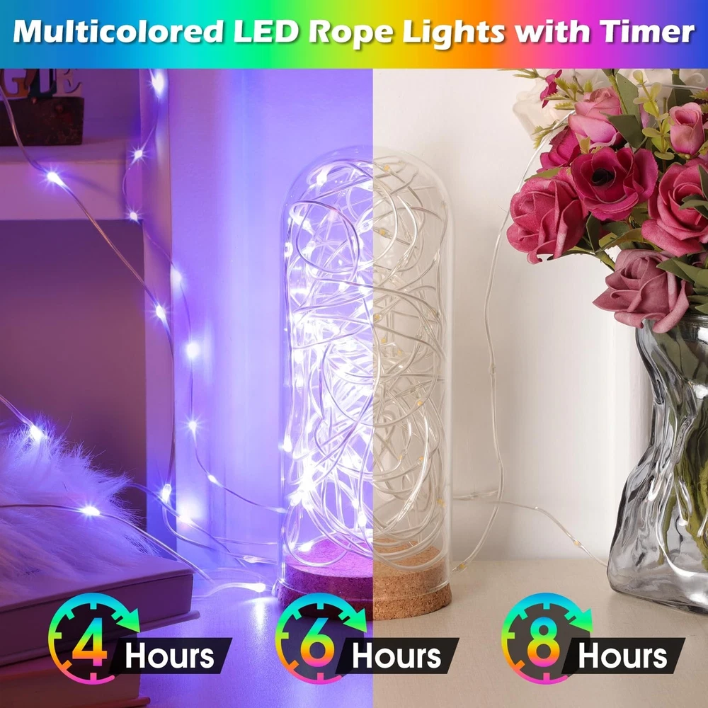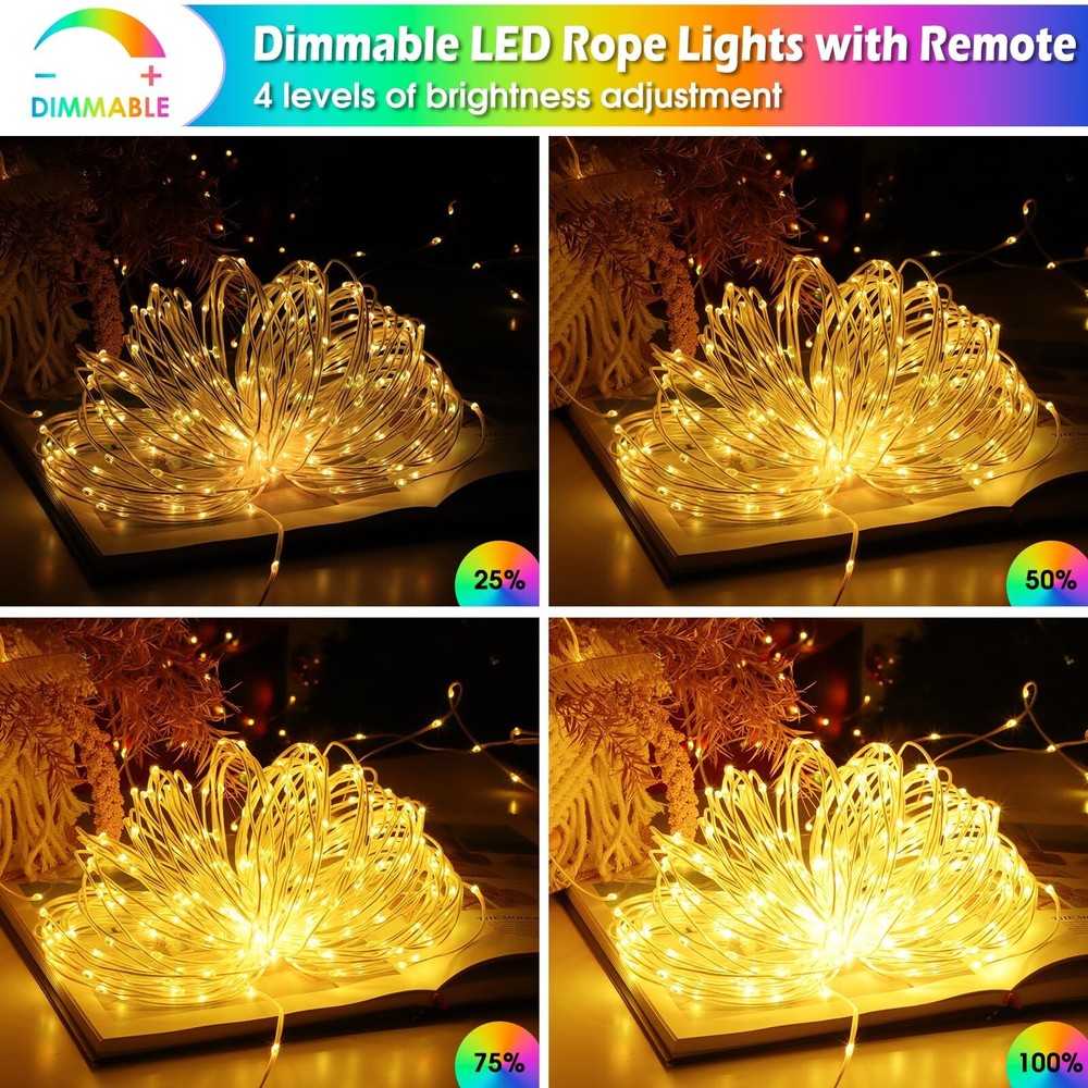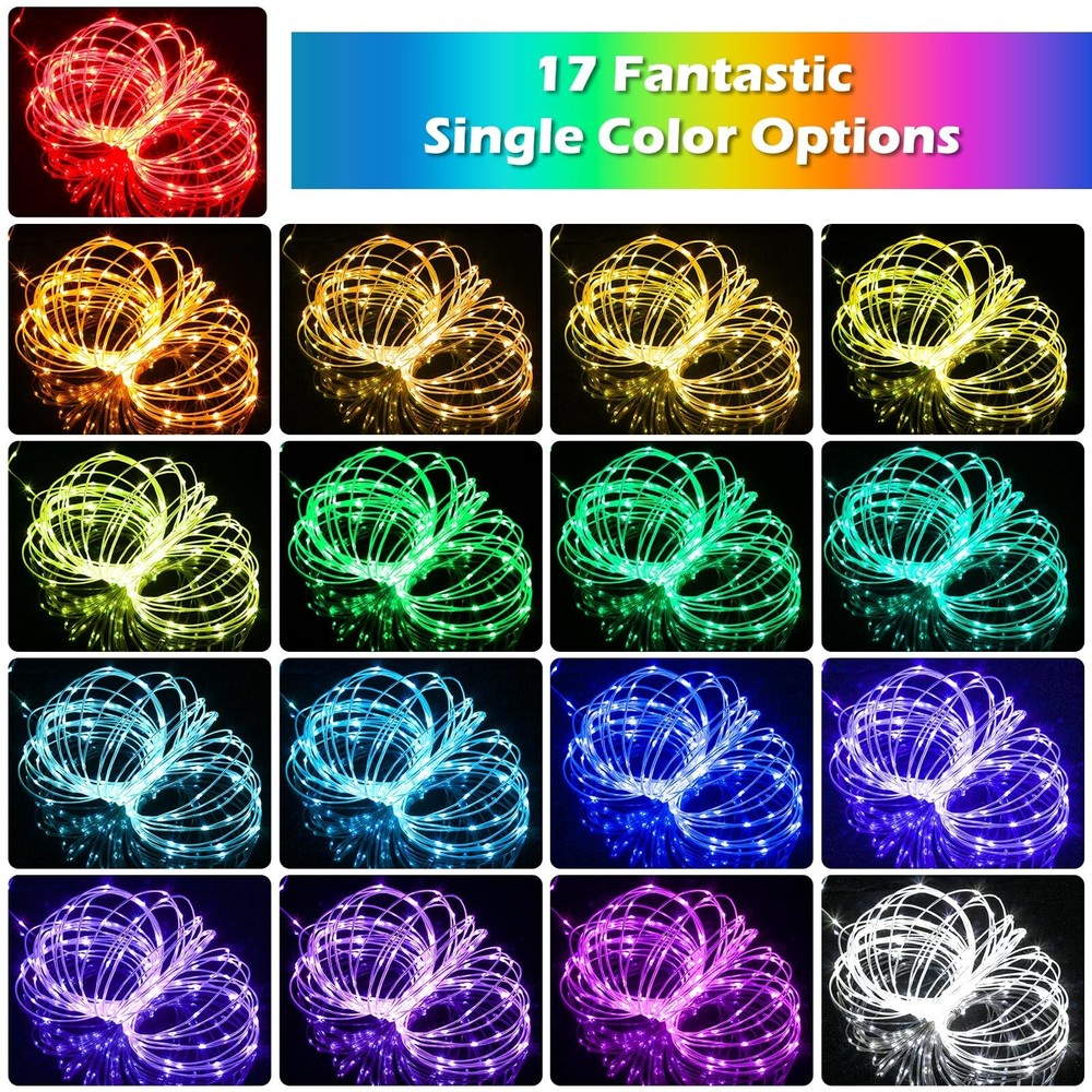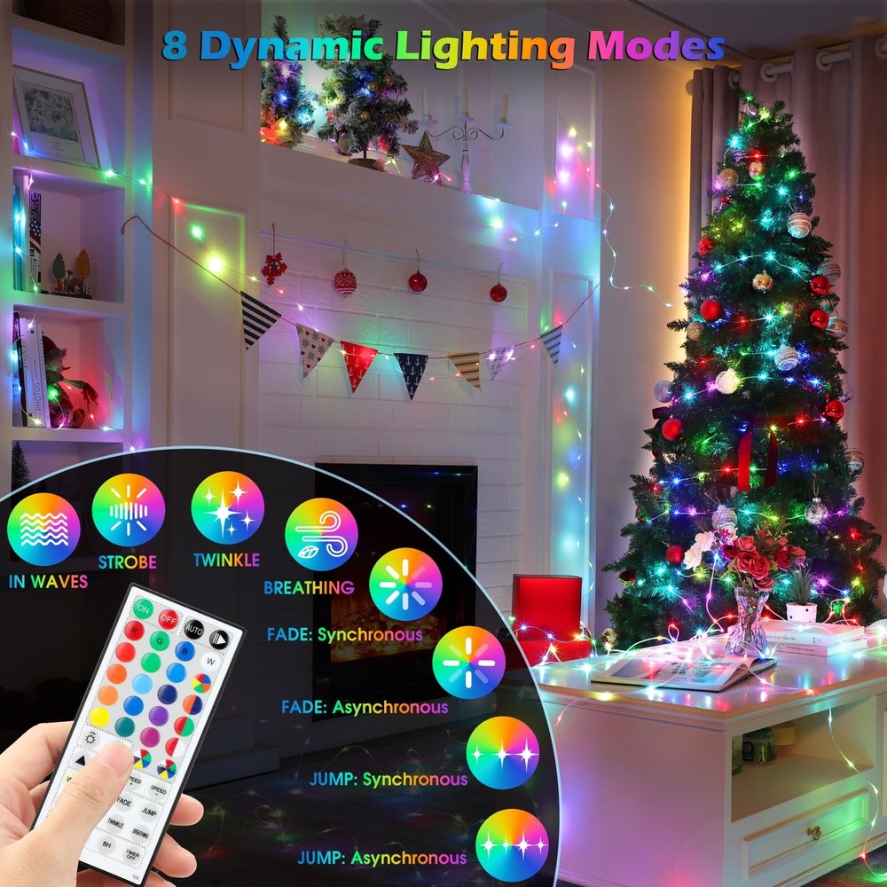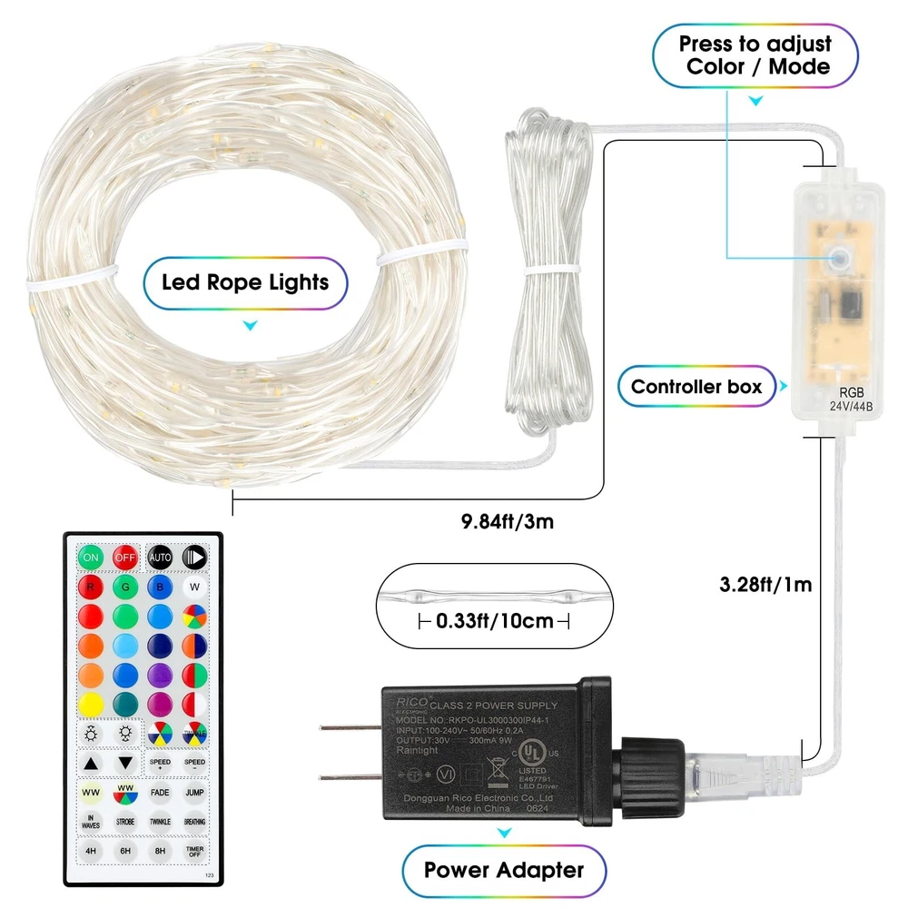 Mlambert 99Ft 300 LED Christmas String Lights Outdoor Indoor, 17 Solid Colors 8 Multicolors 8 Lighting Modes RGB Twinkle Fairy Rope Lights with Remote & Timer for Xmas Tree Holiday Party Decor Product Details Size: 99FT Brand: Mlambert MPN: DY-OA08 UPC: Does not apply EAN: Does not apply Color: Clear Brand: Mlambert Indoor/Outdoor Usage: Outdoor, Indoor Special Feature: Remote Controlled, Dimmable, Waterproof, Blinking, Color Changing Light Source Type: LED Power Source: Corded Electric Light Color: Multicolor Theme: Christmas Occasion: Christmas Style: Glam Package Dimensions : 6.18 x 3.78 x 3.5 inches; 12.06 ounces Item model number : DY-OA08 Date First Available : April 29, 2019 Manufacturer : Mlambert Customer Reviews: 4.2 4.2 out of 5 stars 2,226 ratings Color: Clear Brand: Mlambert Indoor/Outdoor Usage: Outdoor, Indoor Special Feature: Remote Controlled, Dimmable, Waterproof, Blinking, Color Changing Light Source Type: LED Power Source: Corded Electric Light Color: Multicolor Theme: Christmas Occasion: Christmas Style: Glam Material: Copper Controller Type: Remote Control Number of Light Sources: 300 Voltage: 13.5 Volts Wattage: 8.55 watts Included Components: 1 x User Manual, 2 x Remote (Battery Included), 1 x 99ft Rope Light with 300 LEDs, 1 x Adapter Item Weight: 12.06 Ounces Number of Items: 1 Control Method: Remote Water Resistance Level: Waterproof Seasons: Autumn, Winter, Spring Manufacturer: Mlambert Part Number: USTX-RGB-CCR01-1 Item Weight: 12.1 ounces Package Dimensions: 6.18 x 3.78 x 3.5 inches Item model number: DY-OA08 Special Features: Remote Controlled, Dimmable, Waterproof, Blinking, Color Changing Batteries Required?: No Date First Available: April 29, 2019 17 Fantastic Vivid Colors Rope Lights for Decorations: Our 99 FT rope string lights designed with 300 LEDs, each led bulb spacing is approx. 0.3 FT, offer bright lights and 17 vibrant colors + 8 multi-color options. Perfect for indoor, outdoor party, wedding, bar, garden, patio, balcony, porch, window and doorway, ideal decoration for Halloween, Valentine's Day, Christmas and New Year. Bring romantic and joyful ambiance to your space just in few seconds 8 Lighting Modes LED Rope Lights with Versatile Remote and Timer: We offer 2 pcs remotes for the string lights. Easily operation within 16 ft/ 5m: on/off timer (set 4H/ 6H/ 8H), color, speed adjustment, mode switch from flash to jump. The light can also be controlled by the small controller on the string - 8 lighting modes (Fade/ Jump/ Asyn Fade/ Asyn Jump/ In Waves/ Strobe/ Twinkle/ Breathing) to fit your different lighting needs. Note: The remote must be aimed at the controller box for the light string to turn on IP68 Waterproof for All Years Use: Our fairy string lights made of great copper wire and wrapped by transparent tube to ensure longer service life, this lights are high level IP68 waterproof designed for all-weather use, featuring waterproof and shatterproof construction that can withstand the elements, can work perfectly in raining and heavy snow day. They are completely safe to touch even for children and pets. Note: IP44 waterproof for controller, dont soak it in the water Super Flexible & Tangle-free: Our string lights can be easily bent into any shapes you like, soft plastic tube prevents the light strings from tangling (No need to worry about spending hours untangling the lights!). Great to use for your creative DIY works and meet all your decoration needs in any moments. With memory function that reverts to the settings you had when you last turned them off, which is very convenient. Perfect choice for adding ambiance and charm to your outdoor events Widely Used Decorative String Lights: Transform any space into a captivating wonderland with our enchanting decorative rope lights. Perfect for patio, garden, lawn, staircase, front door, pool umbrella, roof, ceiling, tree, fence decoration. Package include 1x 99 ft Rope Light, 1 x Adapter, 2 x Remote, 1 x User Manual