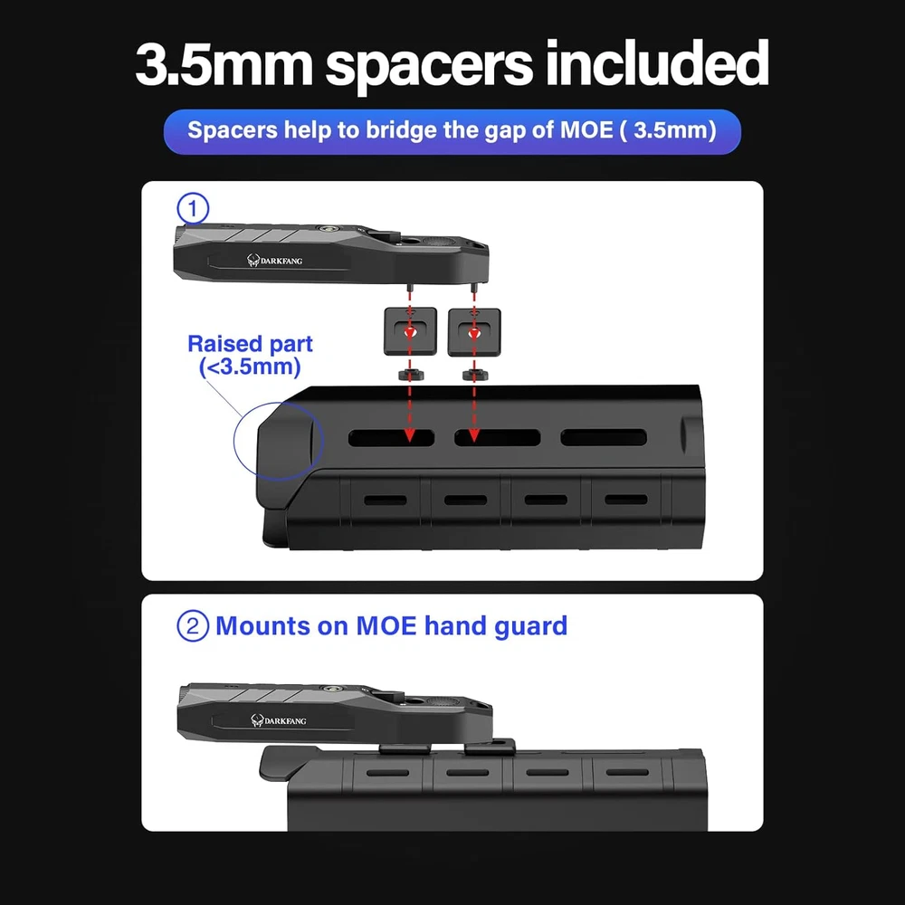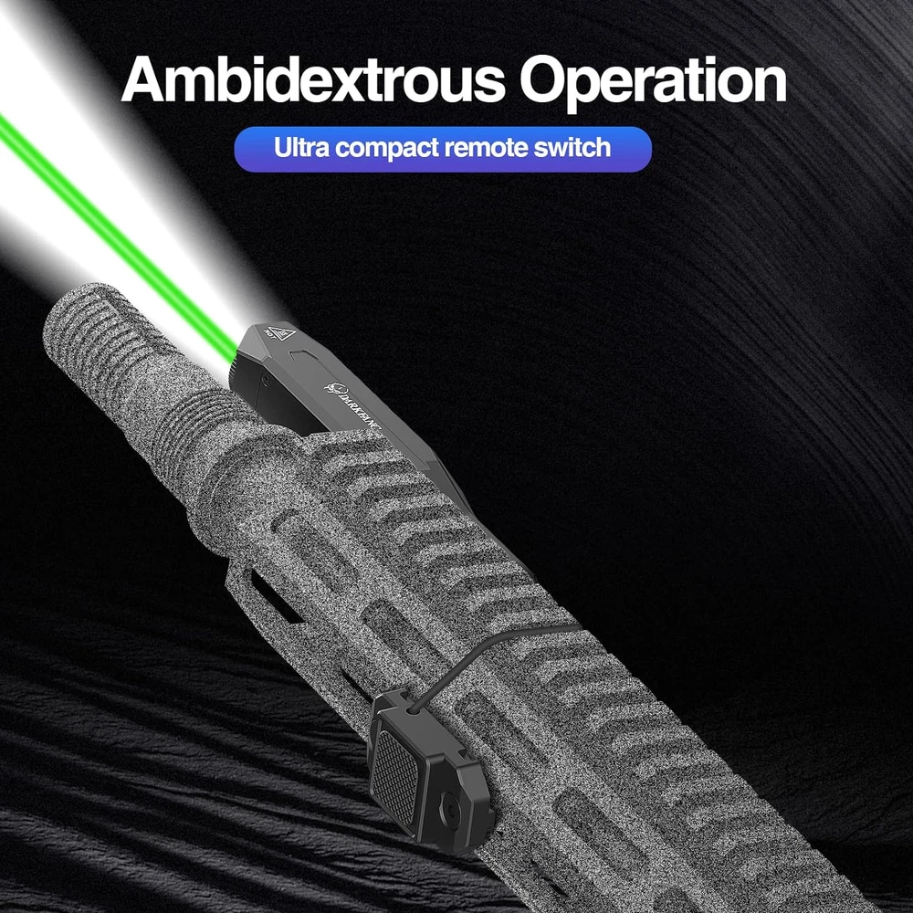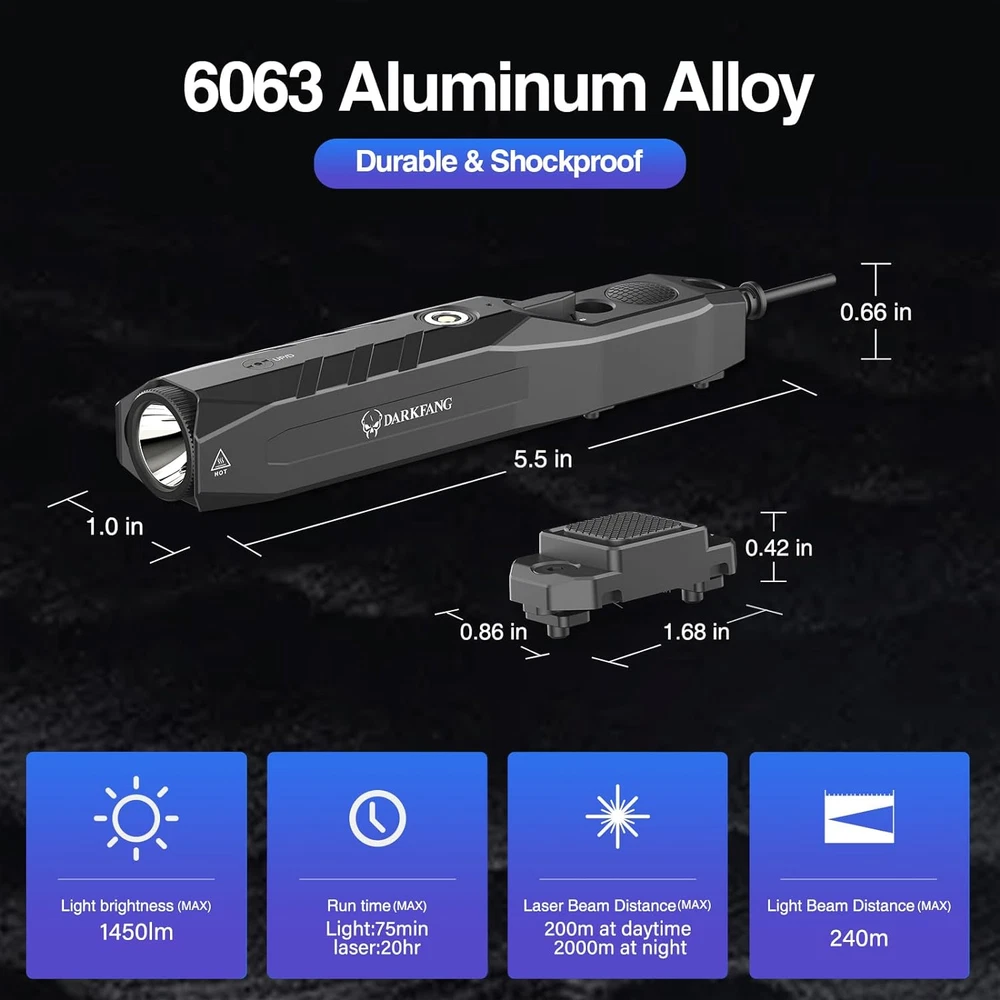 Store New Arrivals Add to Favorite View Feedback Contact Mlok Tactical Flashlight and Laser Combo for Rifle, 1450 Lumen Weapon Light with Removeable Pressure Switch Description Item model number 9066 Light Source Type LED Style Modern Power Source Battery Powered Battery Cell Composition Lithium Ion Country of Origin China Batteries Included? Yes Batteries Required? Yes Product Dimensions 5.5"D x 1"W x 0.66"H Material Aluminum Number of Batteries 1 Lithium Polymer batteries required. (included) Included Components spacers, manual, charging cable, remote switch, Allen wrench Item Package Quantity 1 White Brightness 1450 Lumens Brightness 1450 Lumen Item Weight 7.4 ounces Special Features Long Range, Mountable, Lightweight, Adjustable Light Modes, Rechargeable Runtime 1 hour and 15 minutes Special Feature Long Range, Mountable, Lightweight, Adjustable Light Modes, Rechargeable Part Number DK9066 Color Green laser light combo Batteries 1 Lithium Polymer batteries required. (included) Recommended Uses For Product Tactical, hunting Flashlight & Green Laser Combo---the 9066 laser light combo with 1450 lumen super bright light and green laser beam(classIII A, power less than 5mW) Multi Tactical Modes---the flashlight and laser can work independently and together, fast switch with mode dial, both support momentary/ strobe function(click twice the pressure button) Compact and Ergonomic design---the 9066 flashlight and laser easy to operate through the mode dial, the pressure button with ergonomic design comfortable to use Full Aluminum/ Shockproof Body---this weapon light made from 6063 aluminum alloy, durable and shockproof under harsh environments Mlok/Picatinny remote switch---the remote pressure switch can be installed on the mlok rail or picatinny rail. The 9066 flashlight can be installed flexibly for mlok rail, and the attachment points are toward the rear so that the bulk of the unit rides forward alongside the flash hider, keeping less of the light from being blocked Product Description Compact remote switch 6063 Aluminum Alloy and Low profile design The 9066 1450lumen flashlight has 1450 lumen can reach 240m at maximum, the green laser help tracking targets with precision Package including: 9066 Flashlight laser use manual 2x spacers magnetic charging cable Remote pressure switch DARKFANG Tactical Flashlight Laser Combo with Removeable Remote Switch DARKFANG 9066 flashlight has 1450 lumen flashlight at maximum, and the green laser beam is class IIIA, power less than 5mW, which can easily cope with different situations. the compact remote pressure switch can be installed on the mlok rail or picatinny rail, the 9066 flashlight can be installed flexibly for mlok rail, it support momentary/strobe/steady modes, easy to operation with the pressure switch. Main Features: Low profile and compact design Fast dial mode switch Compact remote pressure switch Magnetic charging rechargable battery Multi tactical modes Specification Model Number DK9066 Brightness 1450 Lumen Max Green Laser Class IIIA, power less than 5mW Working time 1.2 hrs for constant on/ 2 hrs for strobe mode Charging time 2 hours Mounting method Mlok rail Working mode Support Constant ON/ Strobe/ Momentary Net Weight 130g Dimension 5*1*0.66 inch Package 1x DK9066 flashlight, 2xAllen wrench,1xremote pressure switch,1x magnetic charging cable, 1x use manual,2xspacers 6063 Aluminum Alloy Flexible Mounting option Multi Tactical modes Magnetic charging method ABOUT US We offer the best prices around on high quality products. Our E-store includes media such as books, movies, music and games while offering electronics, toys, sporting apparel, clothing, tools, general home, garden items and more. SHIPPING We are always working hard to ensure your package arrives as soon as possible. Please understand that some factors like weather, high postal traffic, and the performance of shipping companies are outside of our control. We offer free shipping to the lower 48 states and ship within 2 business days of payment, usually sooner. We do not accept P.O. Boxes. Please provide a physical address. For shipping outside of the continental USA, we only use eBay's Global Shipping Program.The item is shipped to KY and then sent to the rest of the world. International customers are responsible for all duties and taxes. Continue to check out in order to calculate costs for shipping the item to your country. Messages regarding eBay's Global Shipping Program MUST be directed at eBay EXCLUSIVELY. RETURNS We offer a 30-Day Return Policy on items which you are not completely satisfied with. You have the option for a full-refund or an exchange of the item. No returns are available on items shipped outside of the USA. PAYMENT We accept PayPal. CONTACT US This page content is yet to come Please ad us to your favorite seller and visit again later Thank You CUSTOMER SATISFACTION We try our very best to make sure every customer is completely satisfied. If there's a problem, message us! We're happy to help. WE ACCEPT Copyright © 2021 AutoDS. | All Rights Reserved