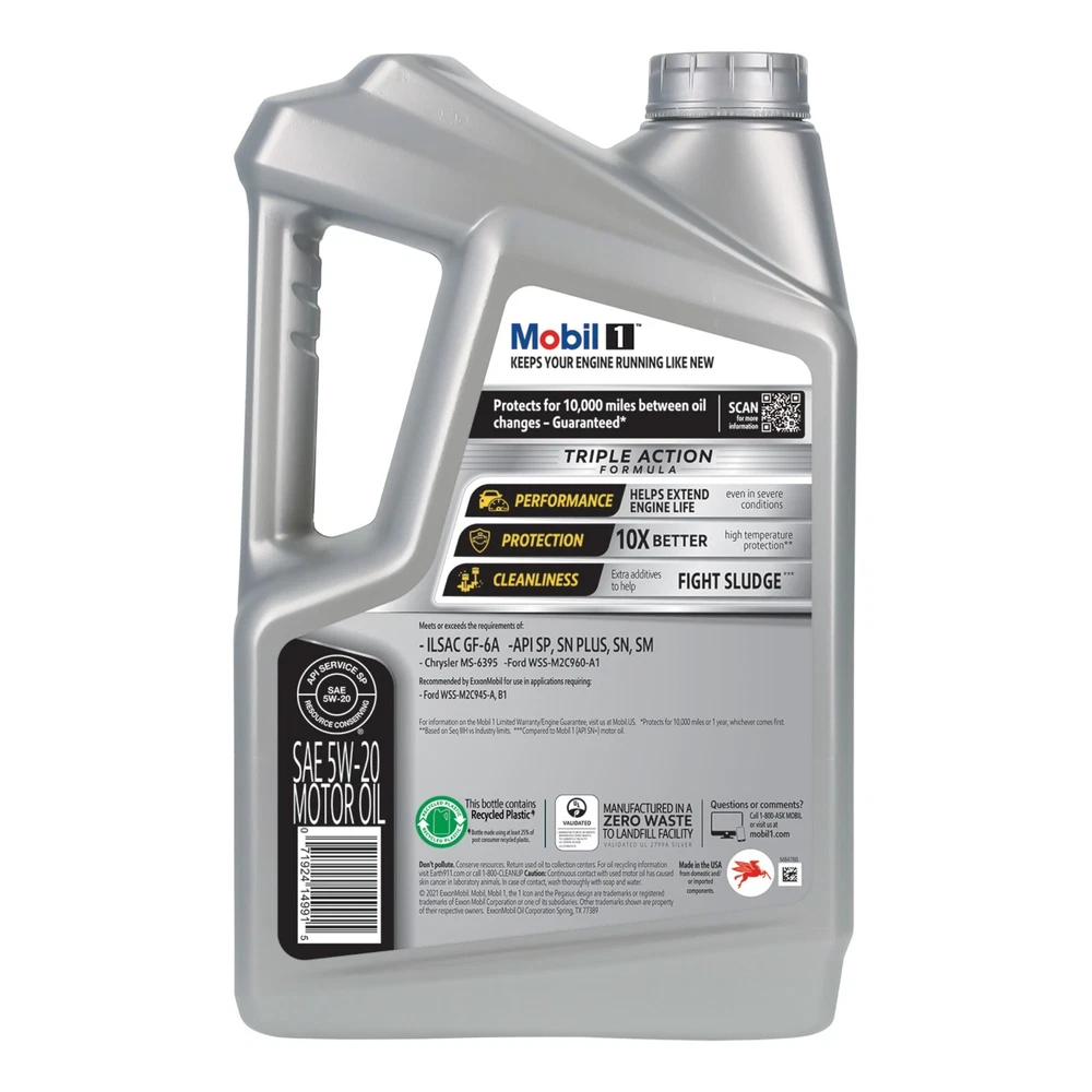 Mobil 1 advanced full synthetic motor oil 5W-20 helps to extend engine life for vehicles of all ages. Designed to deliver outstanding engine protection from the five factors that can damage engines over time and protect critical engine parts for up to 10,000 miles between oil changes*. Its uniform synthetic oil molecules reduce friction, helping to prevent deposits and sludge buildup. Mobil 1 helps to keep your engine running at lower temperatures.** This technologically advanced motor oil is proven to cool engine temperatures by over 10%.*** Mobil 1 advanced full synthetic motor oil 5W-20 also helps control oxidation to prevent oil breakdown and is recommended by ExxonMobil for all types of modern vehicles, including high-performance turbo-charged, and supercharged gasoline and diesel multi-valve fuel-injected engines found in passenger cars, SUVs, light vans, and light trucks. Mobil 1 is America’s leading synthetic motor oil brand at retail†, recommended by car builders and experienced mechanics, and is the Official Motor Oil of NASCAR®. (*Protects for up to 10,000 miles or 1 year, whichever comes first. To learn more about the Mobil 1 Limited Warranty, visit Mobil.US. **Compared to conventional oil. ***Based on proprietary engine testing–results may vary. ****Source: The NPD Group/Retail Tracking Service/Dollar Sales/PCMO Full Synthetic/52 weeks ending September 30, 2023.) Mobil 1 advanced full-synthetic motor oil 5W-20 utilizes Mobil 1’s signature Triple Action Formula to deliver outstanding engine performance, protection, and cleanliness. Helps protect critical engine parts for up to 10,000 miles between oil changes,* controlling oxidation to prevent oil breakdown and maintaining excellent viscosity Meets ILSAC GF-6 standards to help provide low-speed pre-ignition (LSPI) and timing chain wear protection while keeping your engine clean and helping to improve your fuel economy Mobil 1 is specially formulated to help remove sludge and lower engine temperatures Provides excellent internal engine heat protection (up to 500 degrees F) and low temperature protection (to -30 degrees F)