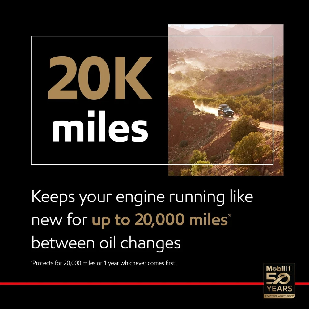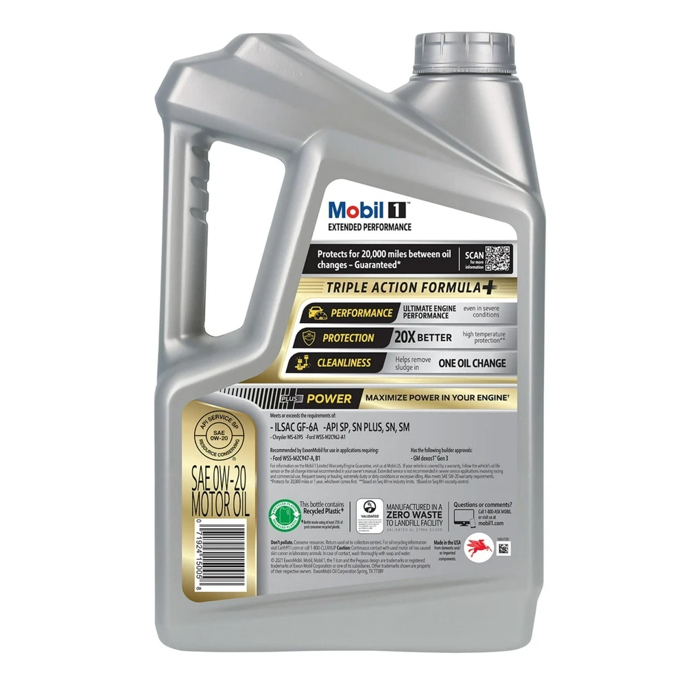Mobil 1 Extended Performance Full Synthetic Motor Oil 0W-20, 5 Quart Product details If you trust your vehicle to be there for you, you need to be there for its engine—with Mobil 1 Extended Performance full-synthetic motor oil 0W-20. Our ultimate full-synthetic motor oil meets or exceeds the industry’s toughest standards to help you get the most from your engine for up to 20,000 miles between oil changes—guaranteed.* Mobil 1 Extended Performance utilizes Mobil 1’s Triple Action+ Formula to combine outstanding engine performance, protection, and cleanliness with the added benefit of maximized engine power. This cutting-edge formula is recommended by ExxonMobil for all types of modern vehicles, including high-performance, turbo-charged, and supercharged gasoline and diesel multi-valve fuel-injected engines found in passenger cars, SUVs, light vans, and light trucks. Mobil 1 is America’s #1 synthetic motor oil brand at retail,*** trusted and recommended by car builders and experienced mechanics, and is the Official Motor Oil of NASCAR®. (*Protects for up to 20,000 miles or 1 year, whichever comes first. To learn more about the Mobil 1 Limited Warranty, visit Mobil.US. **Based on Seq IIIH vs industry limits. ***Source: The NPD Group/Retail Tracking Service/Dollar Sales/PCMO full-synthetic/ 52 weeks ending September 30, 2023) Mobil 1 Extended Performance full-synthetic motor oil 0W-20 helps protect critical engine parts for up to 20,000 miles between oil changes,* controlling oxidation to prevent oil breakdown and maintaining excellent viscosity Utilizes Mobil 1’s Triple Action+ Formula to combine outstanding engine performance, protection, and cleanliness with the added benefit of power Meets ILSAC GF-6 standards to help provide low-speed pre-ignition (LSPI) and timing chain wear protection while keeping your engine clean and helping to improve your fuel economy Helps extend engine life by working to prevent damaging deposits and sludge buildup Provides excellent internal engine heat protection (up to 500 degrees F) and low temperature protection (to -40 degrees F) More details Features Meets OEM Requirements Brand Mobil 1 Motor Oil Viscosity 0W - 20 Motor Oil Type Full Synthetic Motor Oils Number of Engine Cycles 4 Cycle Manufacturer Part Number 120903 Model 120903 Manufacturer ExxonMobil Assembled Product Dimensions (L x W x H) 119.00 x 214.00 x 322.00 Millimeters