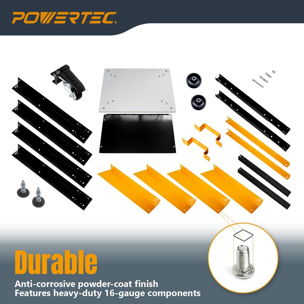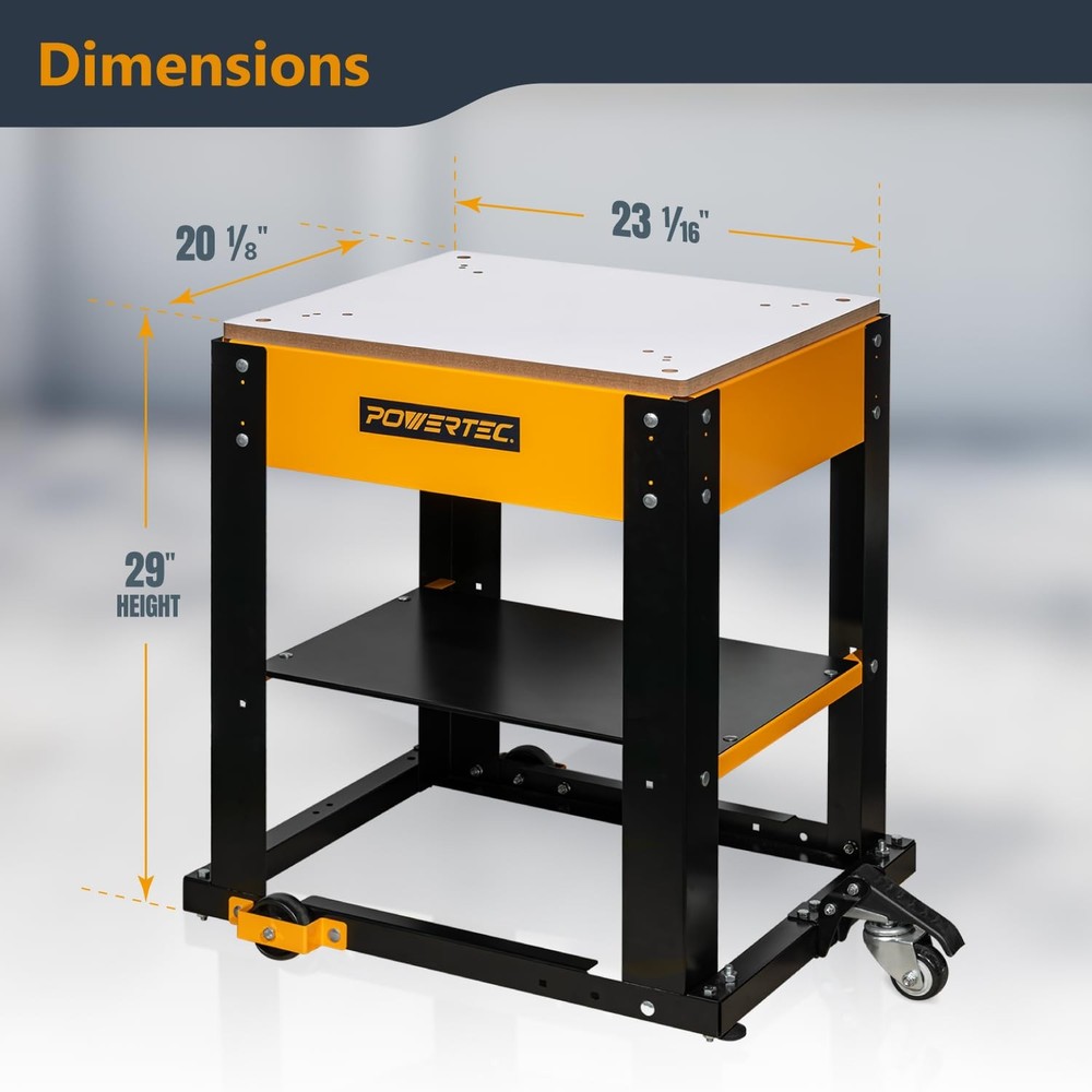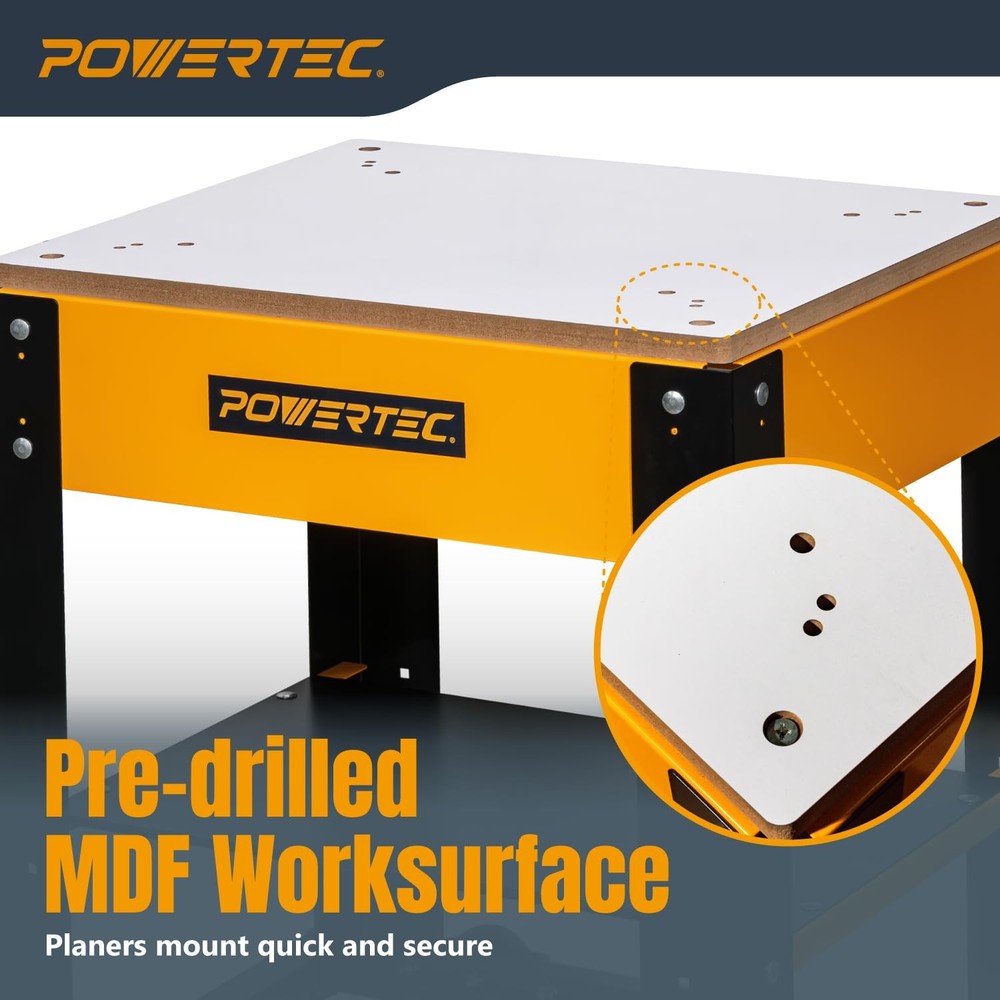 INCLUDES: Planer Table Stand, MDF top, Heavy Duty Frame and Rails, Integrated Mobile Base w/ Wheels, levelers, a lever activated caster assembly, and Hardware FUNCTION: Provides sturdy and stable platform with a safe and secure work surface for a wide range of planers. It also allows accommodates other tools, and allows them to be easily moved around the workshop FEATURES: An melamine MDF tabletop that provides a durable and reusable work surface, and the pre-drilled holes allow for quick and easy mounting of the planer to a stand, plus wheels, levelers and a lever activated caster that gives this mobile planer stand easy movement and portability. To fit your shop requirements, the lever can be mounted either inboard or outboard of the stand. (Melamine table top offers partial water resistance that is easy to clean and helps avoid warpage) MULTI-PURPOSE: Ideal for supporting a variety of smaller, compact benchtop machines, power tools and accessories. Also compatible with the majority of major brand name planers and saws DIMENSIONS: Top (covered in Melamine) 23-1/16" x 20-1/8" | Height (with top) 29.5" | Shelf 23-7/16” x 15” | Shelf height 11-3/4" | Weight 53.3 lbs