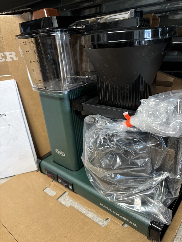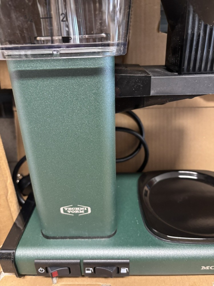 Brand Technivorm Moccamaster Capacity 40 Fluid Ounces Color Juniper Product Dimensions 6.5"D x 12.75"W x 14"H Special Feature Auto Shut-Off Coffee Maker Type Drip Coffee Machine Perfect Coffee Every Time: This pump-free coffee maker heats water to the correct temperature for coffee extraction Brew-Volume Selector switch for brewing half or full carafes Easy to Use: The Moccamaster brews a full 40 oz pot of coffee in 4-6 minutes using one switch Open box item - There is a small chip on the hot plate from a manufacturer defect as seen in photos. All parts still in original packaging and in original box.