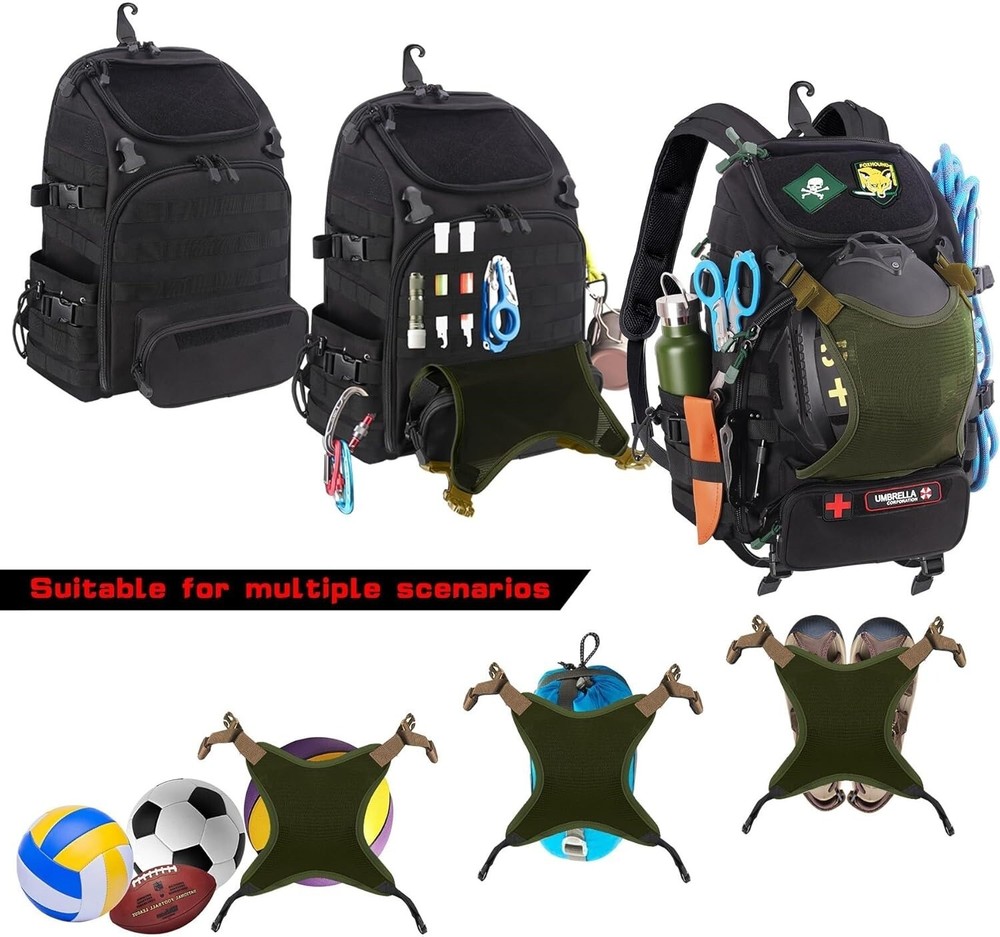 Mochila De Viaje Tactica 35L Exteriores Para Hombre Bolsa De Senderismo Acampar Adecuado para múltiples escenarios: es una mochila de emergencia con kit de 72 horas que combina funciones al aire libre y deportivas. Puede ser adecuada para actividades tácticas, escalada, senderismo, así como varios deportes de pelota como baloncesto, fútbol, béisbol, softbol, voleibol, etc. MULTIPROPÓSITO: esta mochila de trabajo tiene un bolsillo superior abierto de acceso rápido en la parte delantera para guardar la llave, el teléfono. Bolsillo principal para un balón de baloncesto de tamaño completo, balón de fútbol, voleibol, fútbol y más. El soporte para casco se puede utilizar como bolsas para zapatos. MOLLE Y EXPANDIBLE: la correa MOLLE puede colgar artículos pequeños, o para sujetar bolsas o equipos adicionales, puede adaptar el soporte del casco, la bolsa para zapatos, la bolsa médica. Dos correas laterales ajustables y el bolsillo pueden sujetar el palo o la botella de agua de forma segura. La mochila de softbol también tiene correas de compresión inferiores, puede colgar sus rodilleras, trípode o tienda de campaña. PERSONALIZACIÓN: Personalizable con parches, que incorporan un estilo militar o de béisbol personalizado. Esta mochila de asalto del ejército cuenta con un compartimento exclusivo para computadora portátil, que proporciona un almacenamiento seguro y conveniente para dispositivos electrónicos. IMPERMEABLE y SÓLIDO: Fabricado con tela Oxford 900D de alta calidad y resistente, que es impermeable, a prueba de polvo y resistente al desgaste. La base resistente y las correas de hombro ajustables garantizan la seguridad de su tabla de remo durante el transporte. TRANSPIRABLE: Cómodo de llevar, se puede usar como una mochila de asalto de 3 días, una mochila tipo bolsa de emergencia, una mochila militar, una mochila de caza, una mochila de supervivencia, una mochila de tiro, una mochila de trekking o una mochila de día para uso diario, y usar nuestra bolsa de béisbol como una mochila deportiva, una mochila de gimnasio o como una mochila para bate de béisbol y sóftbol. con acolchado de espalda y correas de hombro adecuados para reducir la presión de transporte.