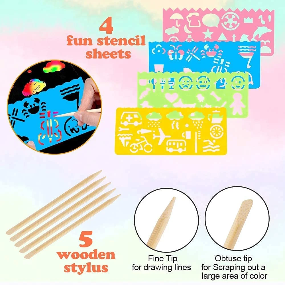 Surprise Scratch Art Kits: Included 50 scratch papers (size: 7.2 x 5.0 inch), 4 painting stencils (size: 6.0 x 2.6 inch), 5 wooden stylus and 1 soft brush. kids can customize their own designs on magic scratch papers, turn interesting colors into imaginative pictures. Easy to take on the go and keep them busy Safe & High Quality: Our scratch art paper made of nice quality and thick cardstock with black-coated surface. Scratching sticks are made of wood, safe and environmentally friendly, not easy to fade and deform. No odd flavor, no toxic powder, so kids can create colorful designs safely Creative & Funny Set: Rainbow scratch paper set is a creative and funny arts and crafts kit for kids and adults. Simply scratch the design onto the special black coating surface paper with the included wooden stylus tools to reveal remarkable magic rainbow colors underneath Perfect Gift Idea: Great scratch off art for children, scratch your own design onto these black scratch art paper for an amazing art experience. Or cut out the beautiful designs to hang around your home or classroom to showcase children's creations. Inspire kids creativity and imagination Multiple Application: These scratch crafts is perfect for notes, card making, draw, sketch and other paper crafting projects! The perfect outlet for your children's artistic thoughts. Inspire your child's free drawing time and then, get ready to watch them surprise you! Product Description Mocoosy 50 Sheets Rainbow Color Scratch Art Paper With Painting Stencils What is it about creating scratch art that makes kids so happy? Is it the repetitive motion of the stylus, the pleasing scratching sound it makes, or the thrill they get when the artwork underneath is revealed? Kids and adults can have their say with Mocoosy Scratch Art Paper Set and find colorful designs show through on the black paper when they scratch the surface, plus lots of ideas for drawing and making scratch paper. There's always a big reveal and surprises galore when children start drawing with the stylus that's included. Get ready to see kids make their mark with this colorful crafts set! Create magical multicolor art! Simply scratch coated sheets with a wood stick to reveal brilliant colors beneath. Inspire your child's free drawing time and then, get ready to watch them surprise you! Features: Upgraded materials : Made of thick cardstock with black-coated surface. Safe and No odd flavor, No toxic powder, kids can create colorful, no-fail designs Scratch & Color Reveal : Simply use the wooden styluses included to easily scratch away the black film to reveal the beautiful rainbow colors Art & Imagination : Great crafts for children, Scratch your own designs onto these ornaments for an amazing art experience. Inspire kids creativity and imagination Wide Usages : use for multiple purposes, doodle, notes, create cards, draw, trace and more! Also fits for adults use, leisure and entertainment, and kill the time About Mocoosy Mocoosy is a young and rapidly developing company operating in various party favors and decorations. We’re committed to providing more quality, more stylish and beautiful products and quality service. Not only did we hope that our party supplies are glowing to be a hit at your events, but also add a dose of fantasy to your kid's daily life. With Mocoosy products,let your every day deserve to be commemorated. Funny Art Paper Craft Kits For Kids Inspire Your Child's Free Creation Time 50 x MAGIC SCRATCH PAPER - Made of safe and high quality cardstock with black-coated surface. Kids can create colorful designs safely 5 x WOODEN STYLUS - Simply use the styluses to scratch away the black coated to reveal the beautiful rainbow colors 4 x PAINTING STENCILS - Come with 4 stencils for little kids to super easily painting cute pattern without skills. 1 x SOFT BRUSH - Easy to clean and no mess, solve the problem to sweep black surface matte without kids hands directly 1 x GIFT BOX - Packaged with colorful gift box. Great scratch gift for kids Birthday, party, Christmas gift. Fun Craft Project for Children kids can create colorful art by scratching off the black coating to reveal rainbow colors, build fine motor control, and boost confidence through artistic expression Long Term Preservation Thick scrtach note paper is not easy to break or poke. Even if it gets wet, the color will not disappear or fade Decoration-Worthy Art! Decorate their designs around your home or classroom to showcase children's creativity. You'll have a space full of proud kids!
