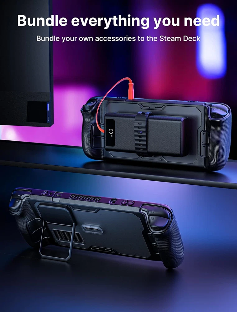 Comprehensive Protection: This accessory consists of a protective back case with its own metal stand, a strap to attach other accessories, and a front cover to use when the Steam Deck is idle. Provide full protection for your Steam Deck. Perfect Fit: The modular case designed for Valve Steam Deck, Steam Deck OLED, the cut-outs are perfectly aligned with the handheld’s output/input ports. Ultimate Protection: Its eco-friendly PC-ABS and silicone material prevent the screen from scratching or cracking, so it's safe to use when you carry your Steam Deck in a backpack or a handbag. The TPU wrap on its edges dampens the shock of a fall, reducing its potential damage. The More, The Better: The JSAUX ModCase also features a modular slider on its back cover. Level up your gaming experience by adding up other compatible accessories, such as the JSAUX cooling fan. What You Get: You will get a Steam Deck case, a front shell, a metal bracket and a strap in the package. We also provide this Modular Steam Deck Case with an 18-Month worry-free period and 24/7 friendly client consultation, if you have any questions, we will resolve your issue within 24 hours. Product Description JSAUX ModCase for Valve Steam Deck The Basic Set Includes: - Steam Deck protective case - Steam Deck detachable front shell - Detachable metal bracket - Detachable silicone strap 1 Face Cover 2 Protective Case 3 Metal Bracket 4 Silicone Strap 1 Drop Protection 2 Precise Hole Position 3 Texture Edges 4 Heat Dissipation 5 Button Protection More Steam Deck Accessories Add to Cart Add to Cart Add to Cart Add to Cart Add to Cart Add to Cart Add to Cart Customer Reviews 4.7 out of 5 stars 2,715 4.5 out of 5 stars 322 4.6 out of 5 stars 1,377 4.6 out of 5 stars 1,377 4.8 out of 5 stars 1,502 4.5 out of 5 stars 1,027 4.6 out of 5 stars 37,680 Price $29.99 $ 29 . 99 $18.99 $ 18 . 99 $19.99 $ 19 . 99 $28.99 $ 28 . 99 $8.99 $ 8 . 99 $9.99 $ 9 . 99 $9.99 $ 9 . 99 Kickstand ✔ ✔ ✘ ✘ ✘ ✔ ✘ Max Output / / 45W 65W 60W 60W 100W Color Black Black Black Black Grey Grey Black, White, Purple, Blue Cable Length / / 5FT, 10FT 10FT / 10FT 3.3FT, 6.6FT, 10FT AFTER-SALES SUPPORT 24/7 client consultation 24/7 client consultation 24/7 client consultation 24/7 client consultation 24/7 client consultation 24/7 client consultation 24/7 client consultation